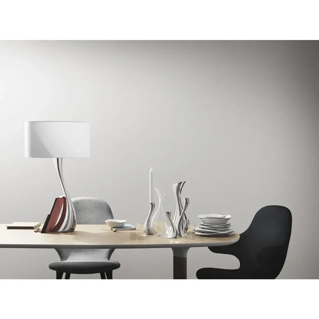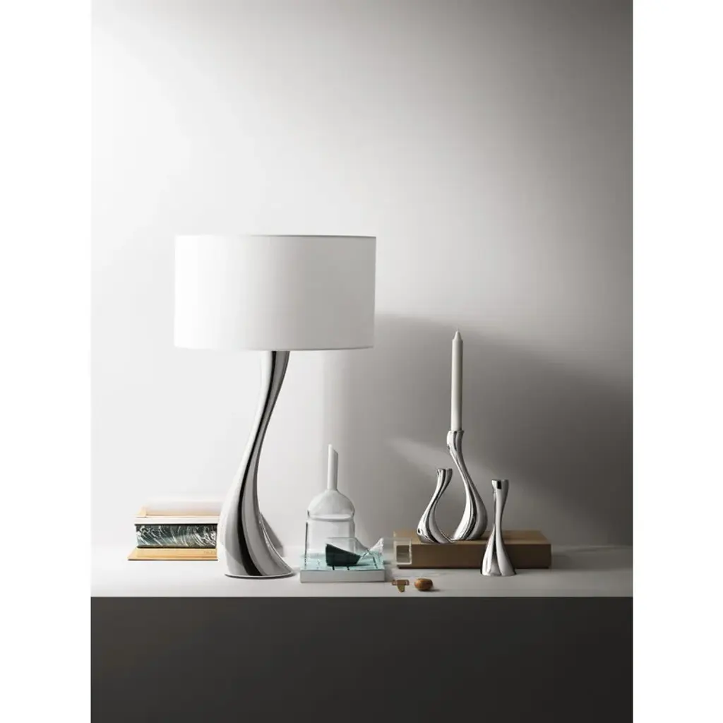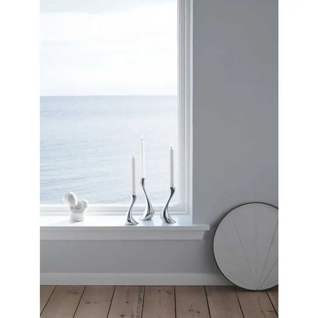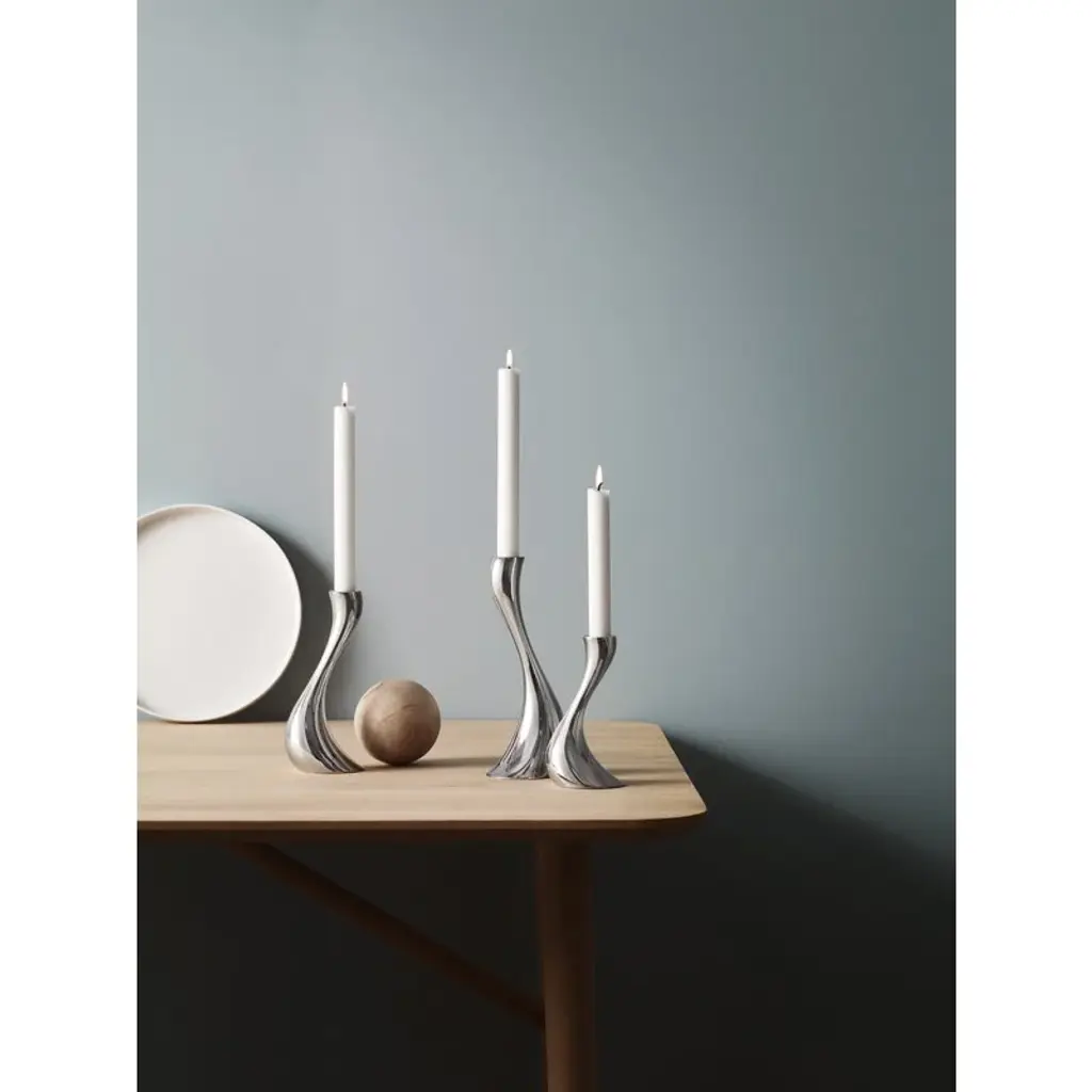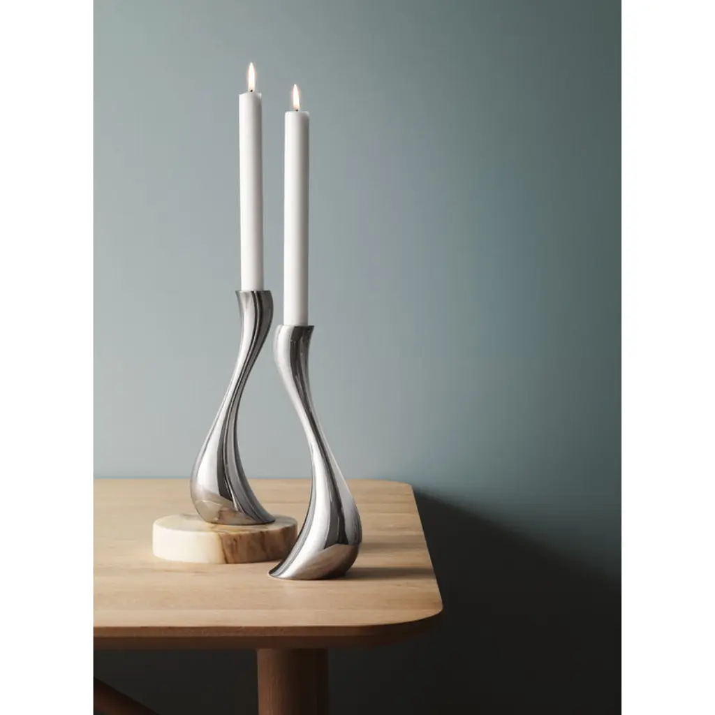 Georg Jensen's Cobra candleholders catch the eye with the shine of mirror-polished steel. The organic lines of the candleholders resemble melting wax – almost as if a classic candlestick had started to melt. Designed by Constantin Wortmann, the Cobra collection is characterized by a swerving, dramatic appearance, and its strong curves create an impression of fast movement. Just like actual cobras, the members of the Cobra collection are imposing, striking and bold. With its mirror-polished steel surface and dynamic design, Cobra is a true design classic that adds a dramatic element to any interior.