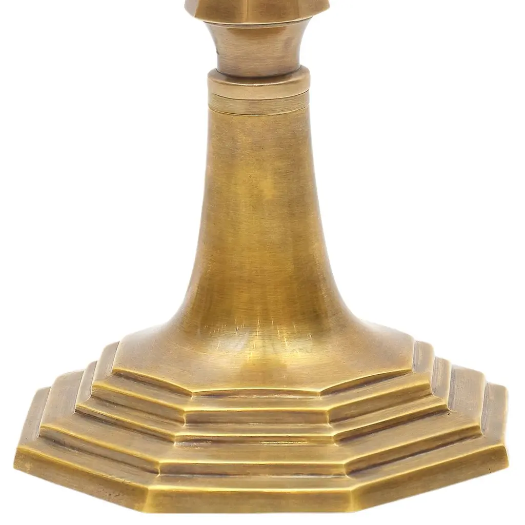 Candlelight is one of Bunny’s favorite ingredients for an inviting room, whether for solo reading or a dinner for twenty. Our Constance Hurricane, in a beautiful vintage brass finish, has a serene air courtesy of its slim profile and tall glass shade, complete with beautifully rounded lip, supported by an octagonal stepped base.