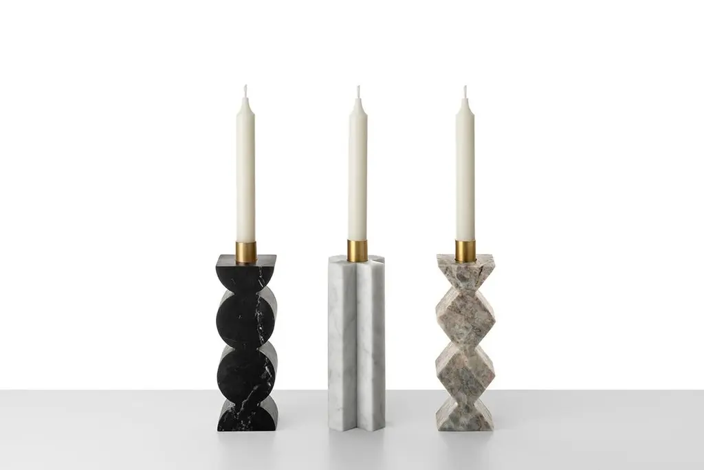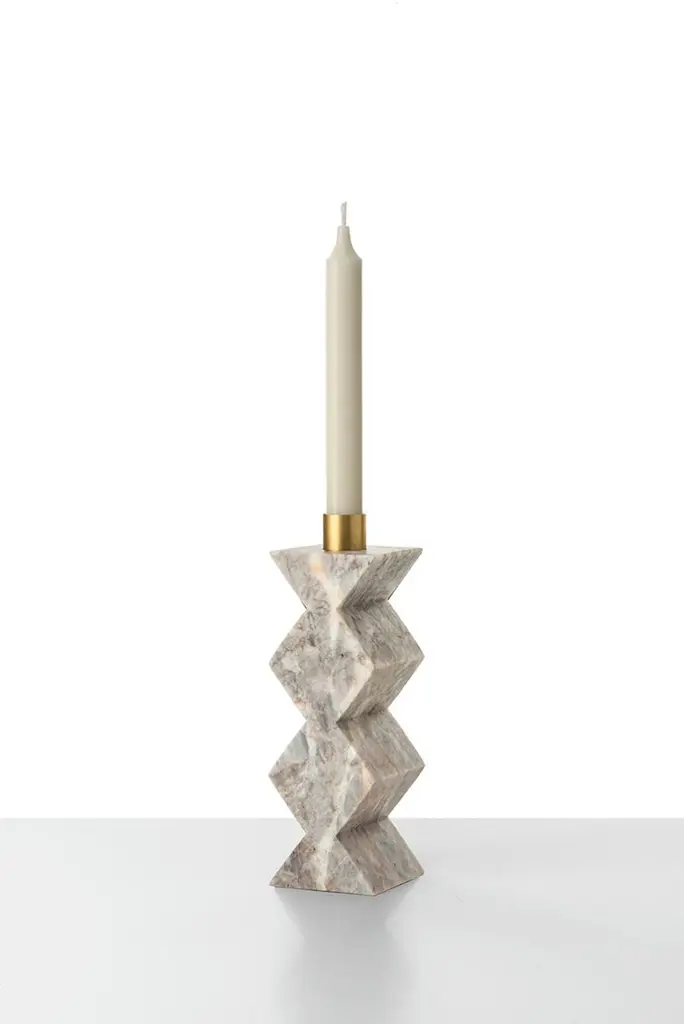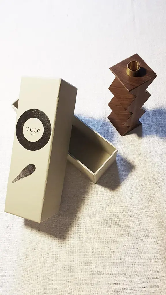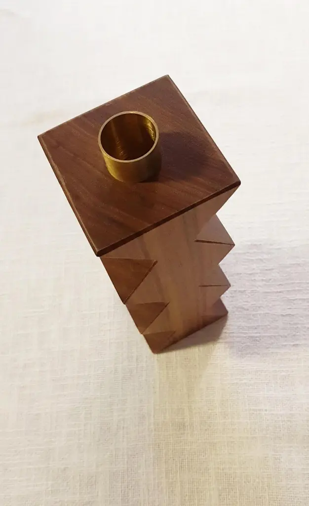 Constantin III is a simple but charming candleholder with a geometric shape with rhombus. The body is in solid Canaletto walnut with natural finishing, emphasizing the wooden veins. The cylinder in natural brass on the top is the place where to put an 18 mm candle.In the same collection 3 different models of candlesticks in wood or in marble. A perfect set for a present.Constantin collection owes its name to its inspirer. It is in fact the modern art of Constantin Brancusi that has guided the designer’s hand to conceive candelabra, bookends, containers and centre pieces in wood, marble and brass. Taking up Brancusi ability to represent the essence of things with a high degree of abstraction, designer Agustina Bottoni has shaped the candlesticks and bookends thinking of the columns and bases of Brancusi famous sculptures. For the container and centerpiece she has been inspired instead by the works in which almost raw solid wood is contrasted with polished and mirrored metal.