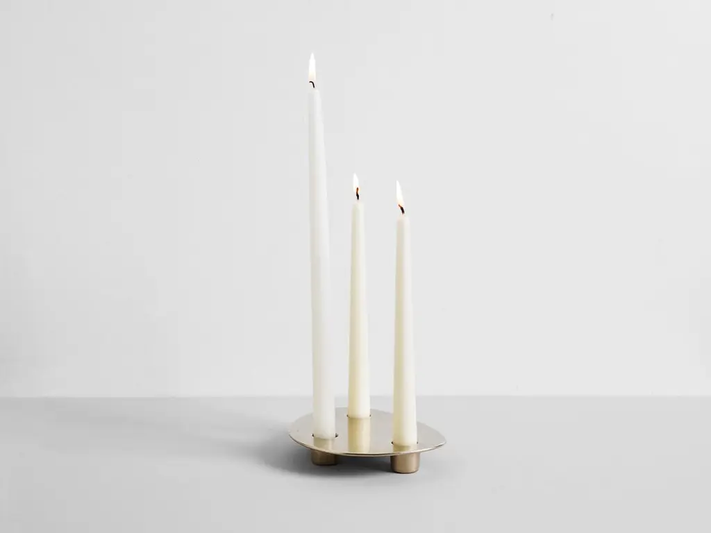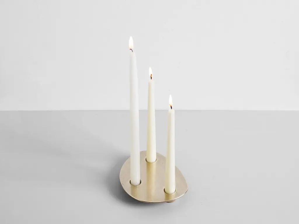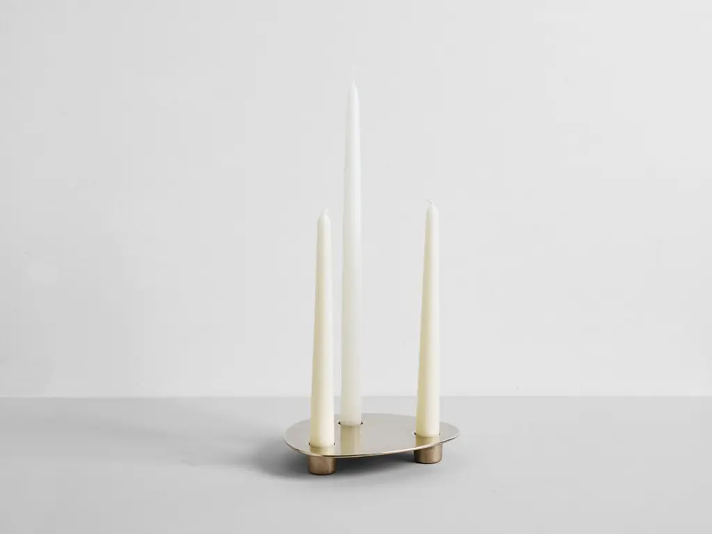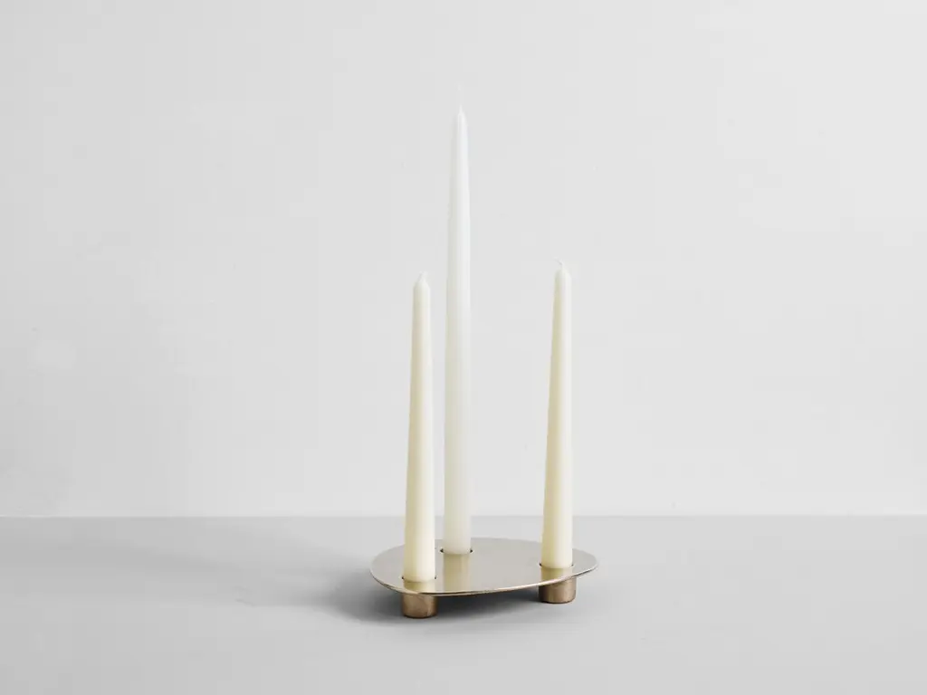Brass Trio Candle Holder by Henry WilsonDimensions: D 18 x H 3 cmMaterials: BrassTrio holds three candles in a solid, hand poured, brass form. Trio candleholder is manufactured in small batches, slight variations will occur from piece to piece. Production marks may include slight pour ripples or surface pitting. They will arrive with a bright finish but will oxidise and darken over time to reveal a distinctive patina. Simply use a metal polish to restore a like-new finish. Dimensions mm. 80 x 150 x 30 H mm.Henry Wilson's work combines a rational, democratic utility with an element of sculptural expression. There is a clear form and function in our products, but it’s important they also have feeling. We are interested in the awkward beauty that comes from something made by hand. We like to explore how imperfection can be introduced into an Industrial process, to make something at scale that retains a sense of individual charm.Permanent collections and exhibitions- Museum of Applied Arts and Sciences, Sydney, Australia- Art Gallery of Western Australia, Perth, Australia- 'Sempering' XXI Triennale, MUDEC, 2016, Milan, Italy.