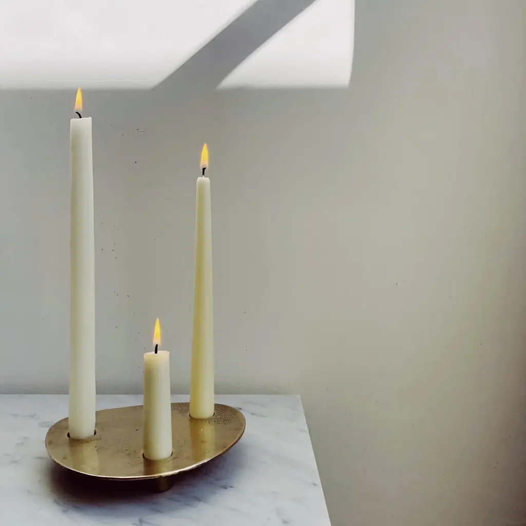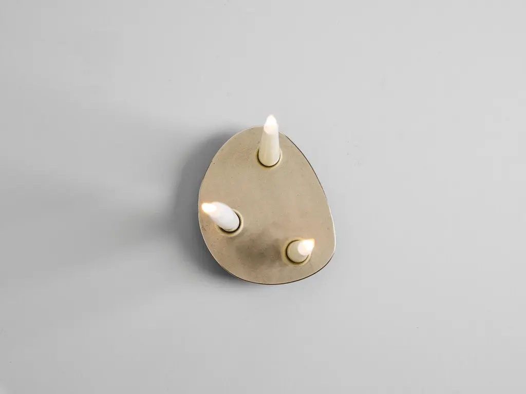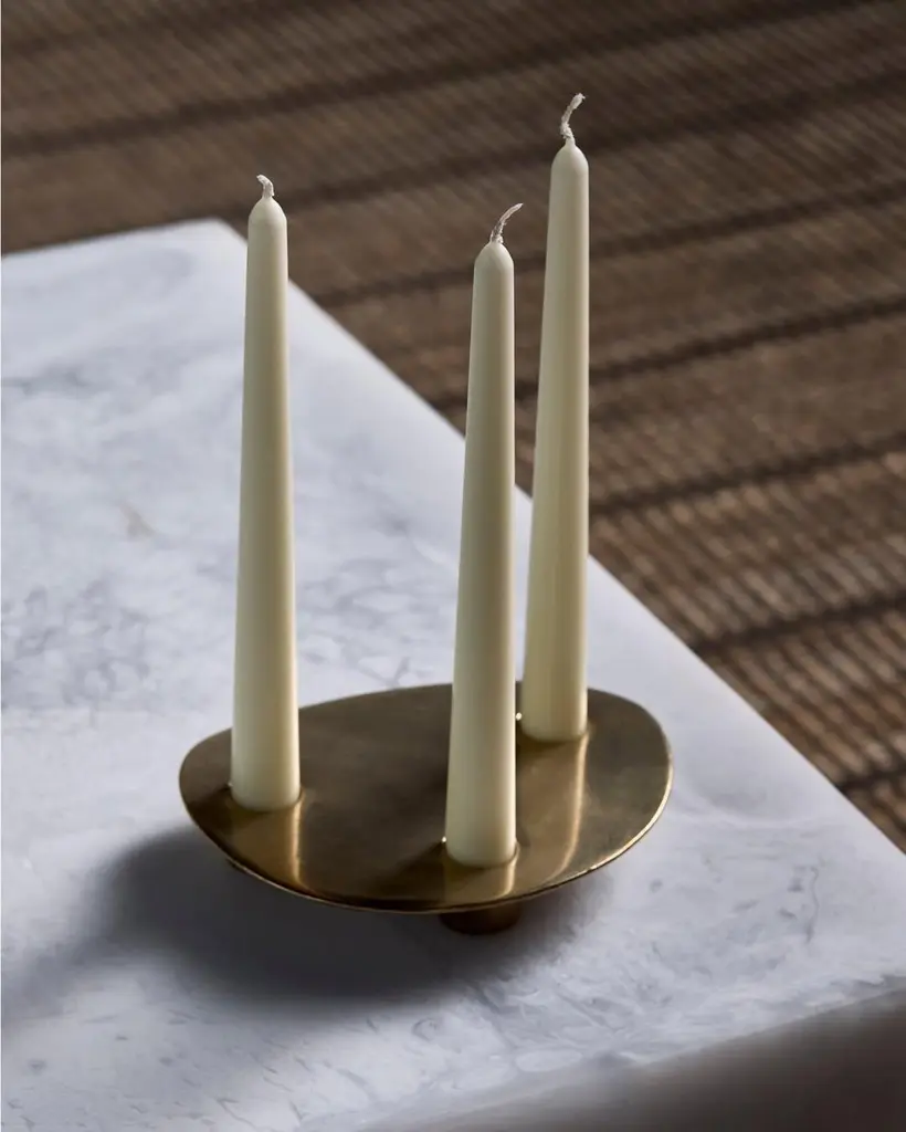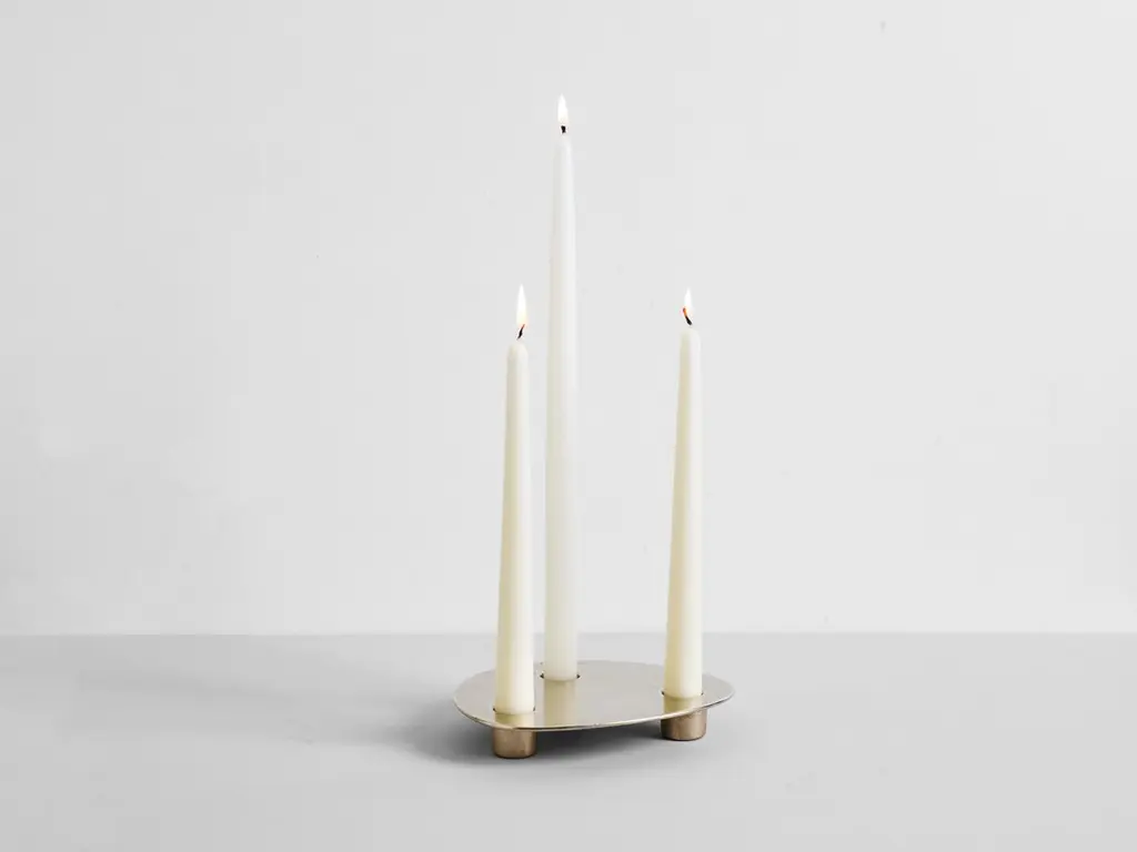 Brass Trio Candle Holder by Henry WilsonDimensions: D 18 x H 3 cmMaterials: BrassTrio holds three candles in a solid, hand poured, brass form. Trio candleholder is manufactured in small batches, slight variations will occur from piece to piece. Production marks may include slight pour ripples or surface pitting. They will arrive with a bright finish but will oxidise and darken over time to reveal a distinctive patina. Simply use a metal polish to restore a like-new finish. Dimensions mm. 80 x 150 x 30 H mm.Henry Wilson's work combines a rational, democratic utility with an element of sculptural expression. There is a clear form and function in our products, but it’s important they also have feeling. We are interested in the awkward beauty that comes from something made by hand. We like to explore how imperfection can be introduced into an Industrial process, to make something at scale that retains a sense of individual charm.Permanent collections and exhibitions- Museum of Applied Arts and Sciences, Sydney, Australia- Art Gallery of Western Australia, Perth, Australia- 'Sempering' XXI Triennale, MUDEC, 2016, Milan, Italy.