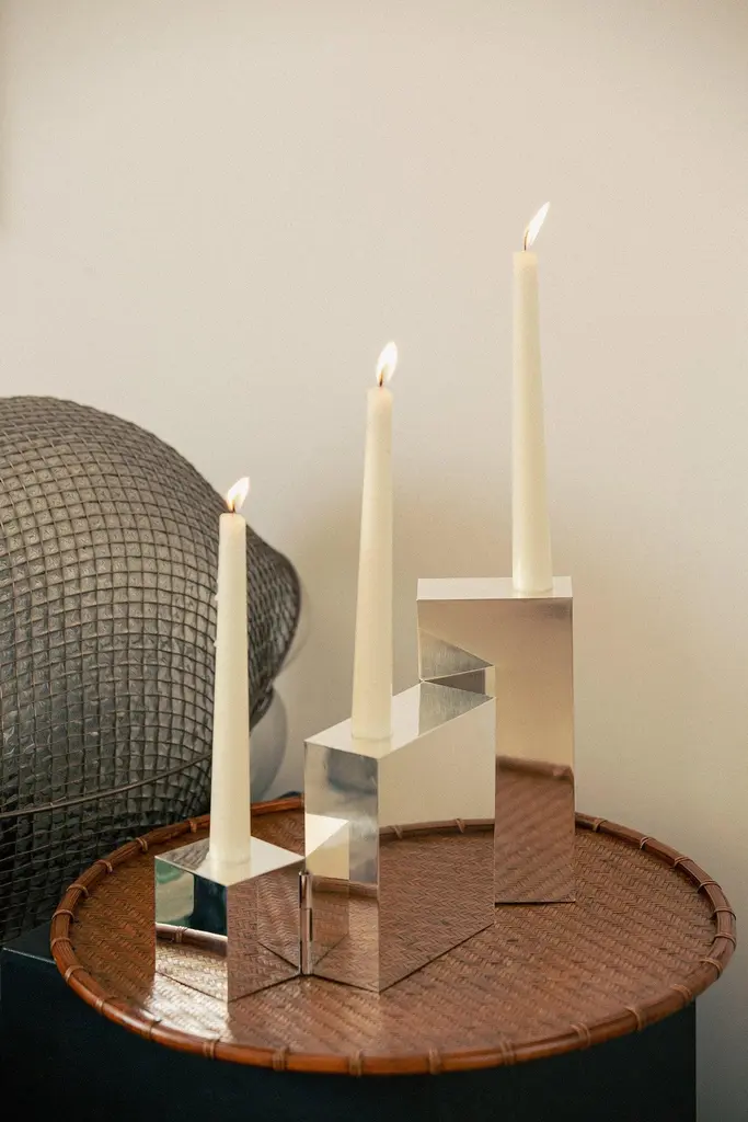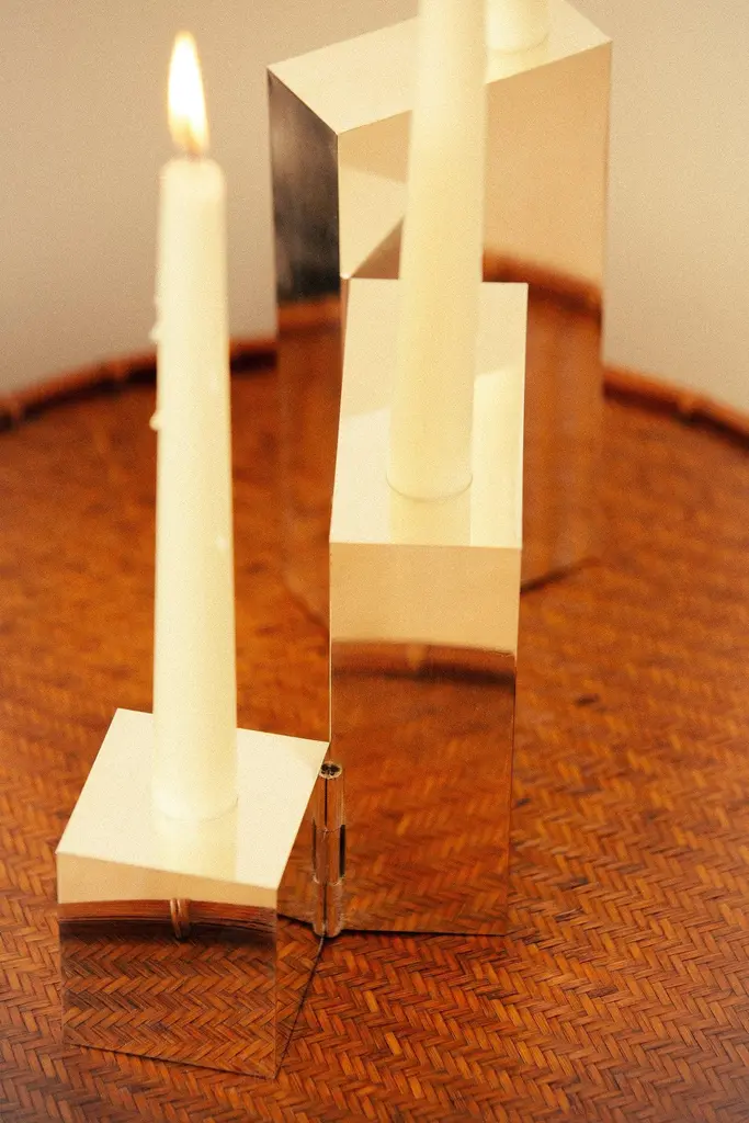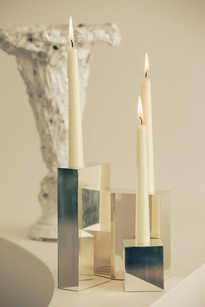 Hinge Silver Candelabra by Henry WilsonDimensions: D 22 x H 19 cmMaterials: Sterling silver plated.Available in sterling silver plated or aluminum.Intended as the playful expression of a love for the technical side of design, this abstractly tiered piece is precision-machined from billet aluminum and finished in a honed, multi-directional polish. Its three tiers pivot from two edges by virtue of an integrated hinge, which allows for restrained sculptural arrangements.Henry Wilson's work combines a rational, democratic utility with an element of sculptural expression. There is a clear form and function in our products, but it’s important they also have feeling. We are interested in the awkward beauty that comes from something made by hand. We like to explore how imperfection can be introduced into an Industrial process, to make something at scale that retains a sense of individual charm.Permanent collections and exhibitions- Museum of Applied Arts and Sciences, Sydney, Australia- Art Gallery of Western Australia, Perth, Australia- 'Sempering' XXI Triennale, MUDEC, 2016, Milan, Italy.