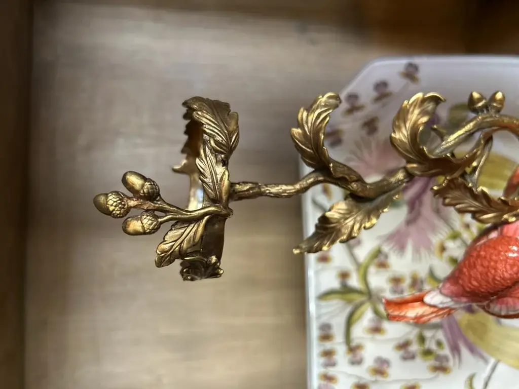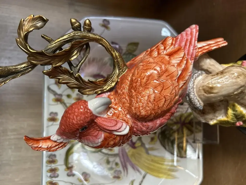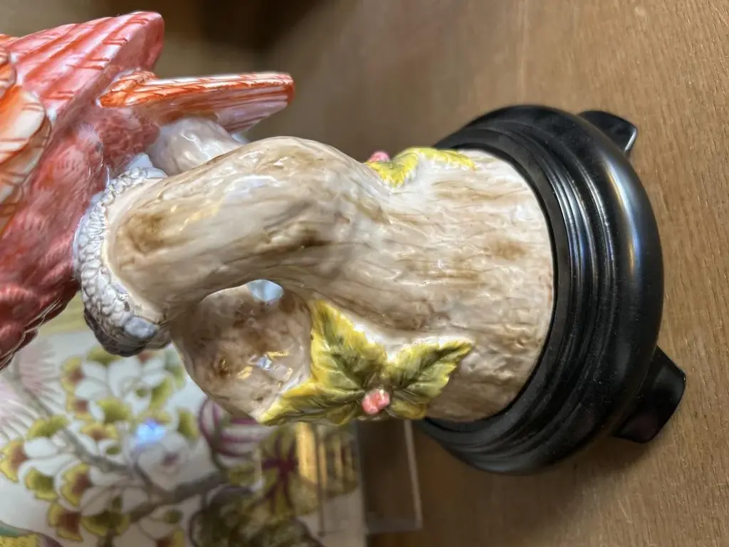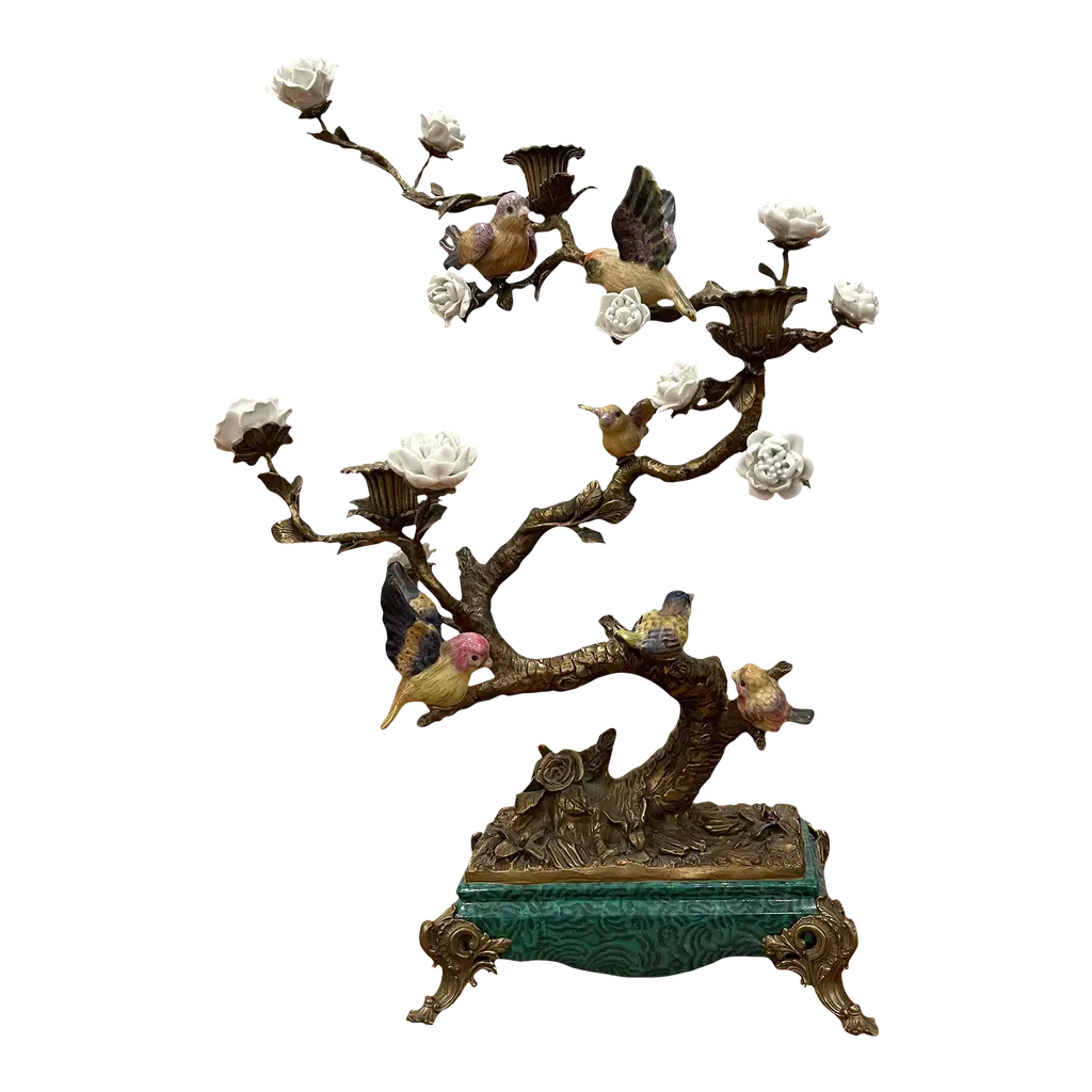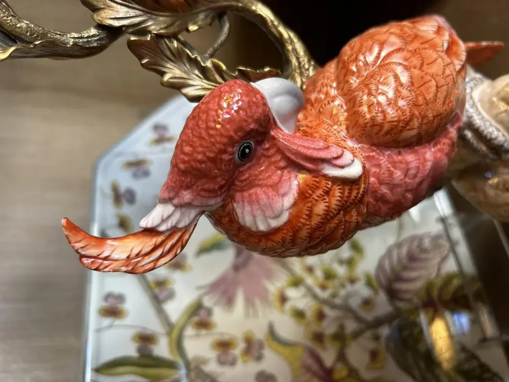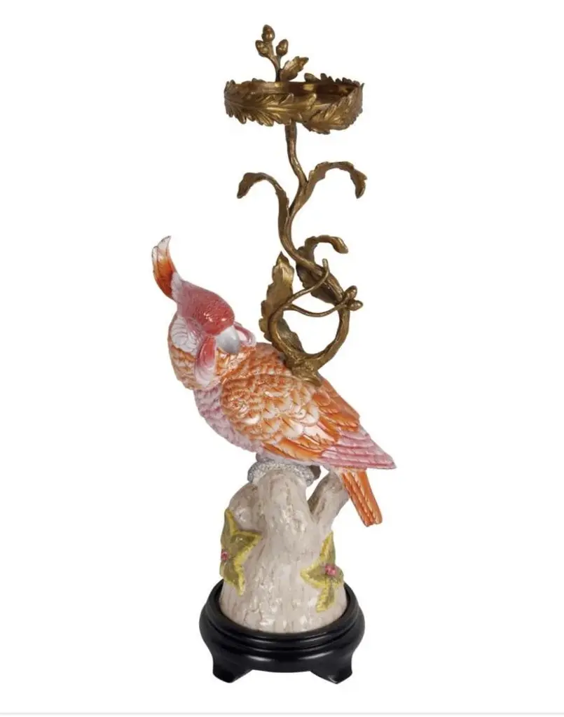 Coral Colored Porcelain And Bronze Parrot Candlestick By Gand & C