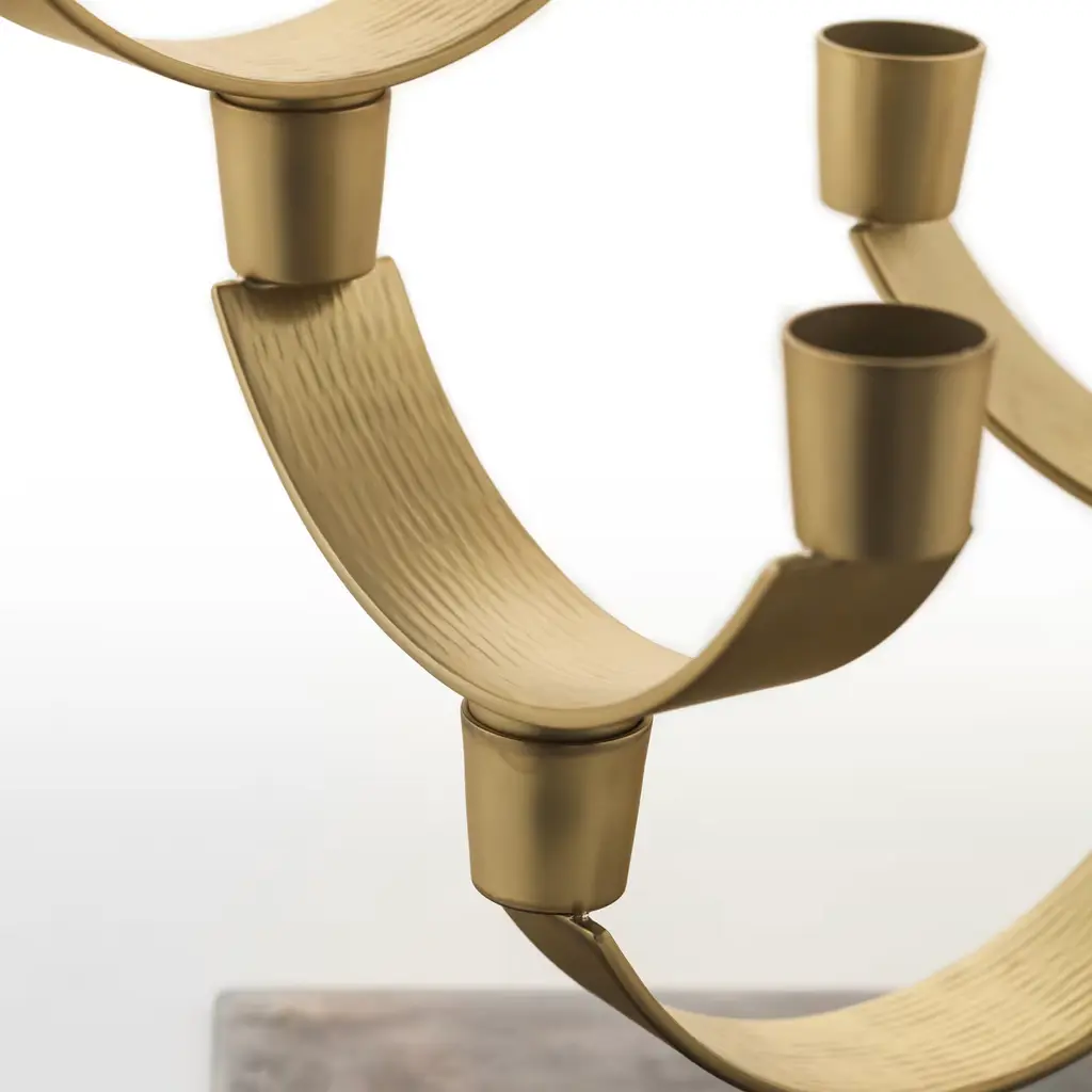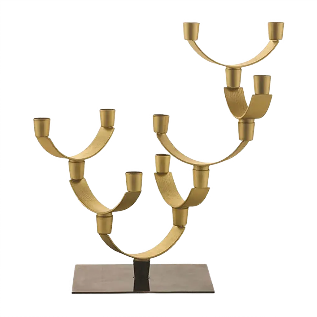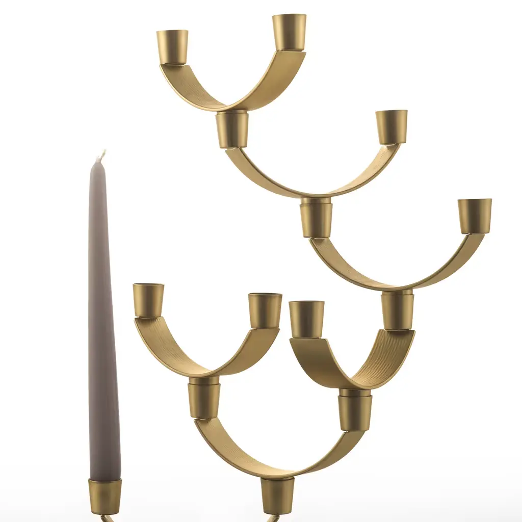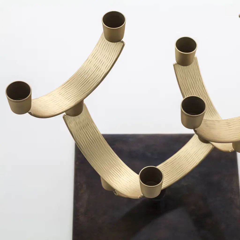 This striking piece is made entirely in brass with two different finishes: the rectangular base is bronzed while the seven semi-circular branches and mouths have a satin finish. The combination of these two hues and the geometric silhouette created give this piece a modern allure. Highly customizable, the seven modules that comprise it can be arranged according to one's need and sensibility.