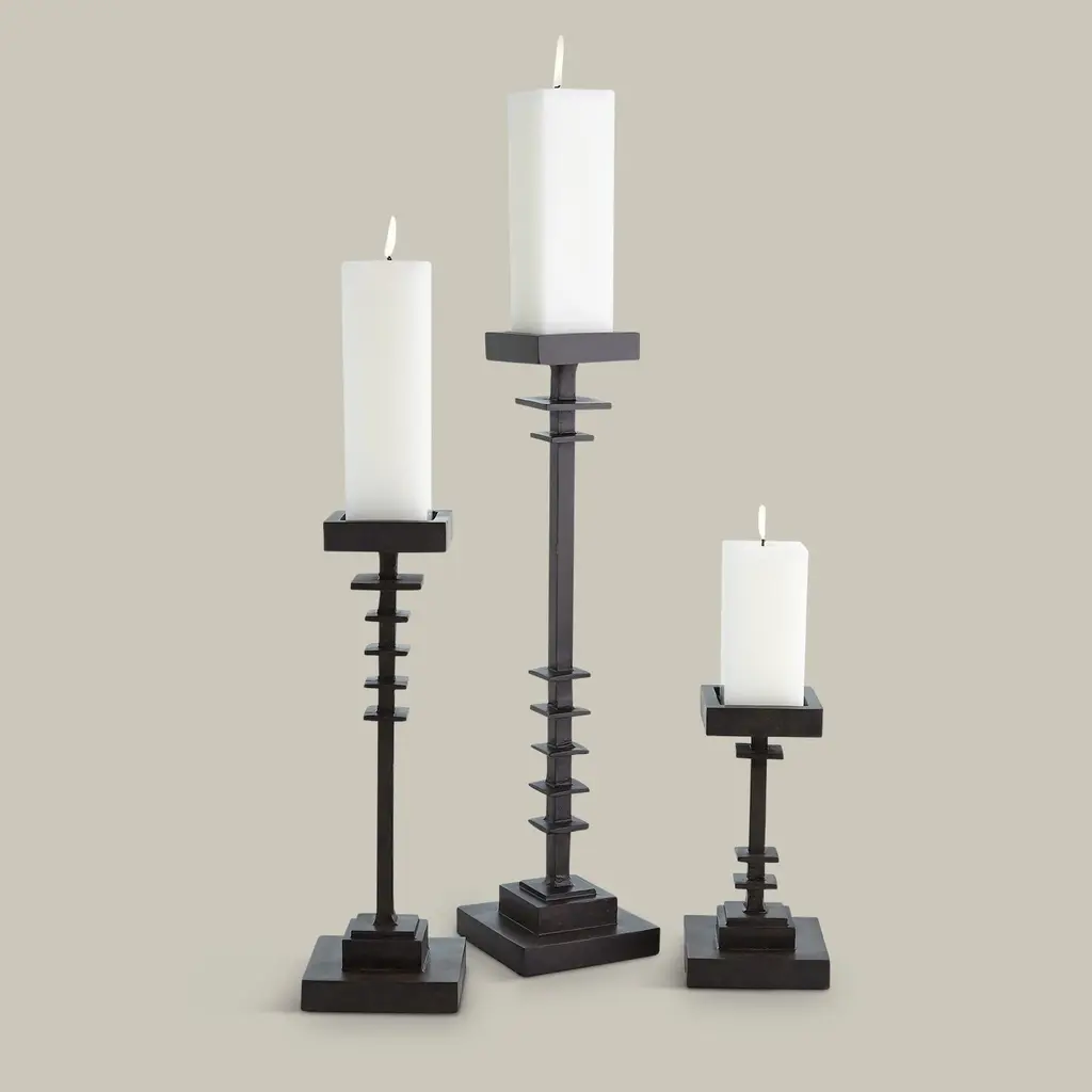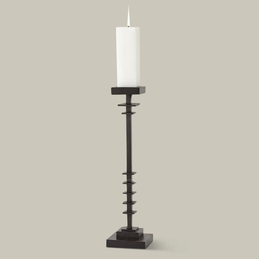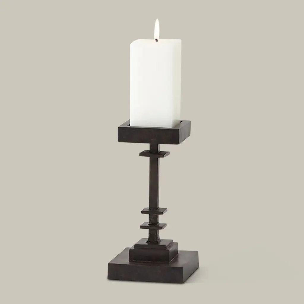 The Corentin Candle Holder showcases a blend of strength and design. Crafted with precision, its stepped design adds a dynamic visual element, creating a sense of depth and dimension. The dark finish accentuates the forged metal texture, making it a captivating centerpiece that effortlessly makes any decor and brings a warm and inviting glow to any space.