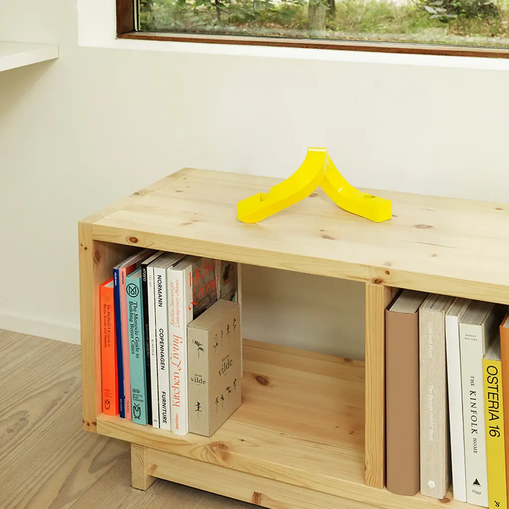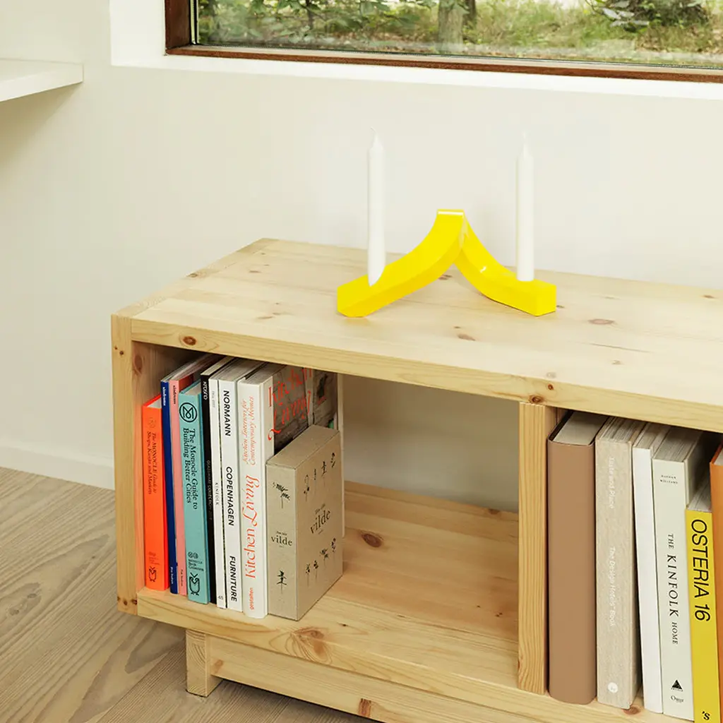 Crooked is a candlestick and decorative sculpture in one. A tribute to the designers love of "crooked" characters, Crooked draws inspiration from the intersection of design, art and architecture. Crooked Candlestick comes in two versions with room for either one or two candles, and in either painted aluminum or bronzed brass.