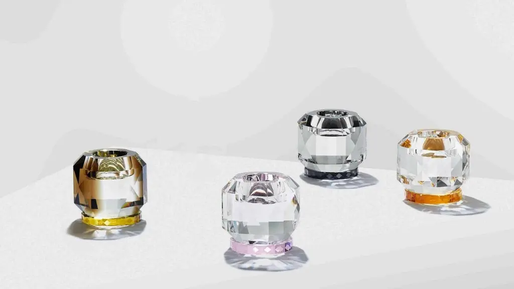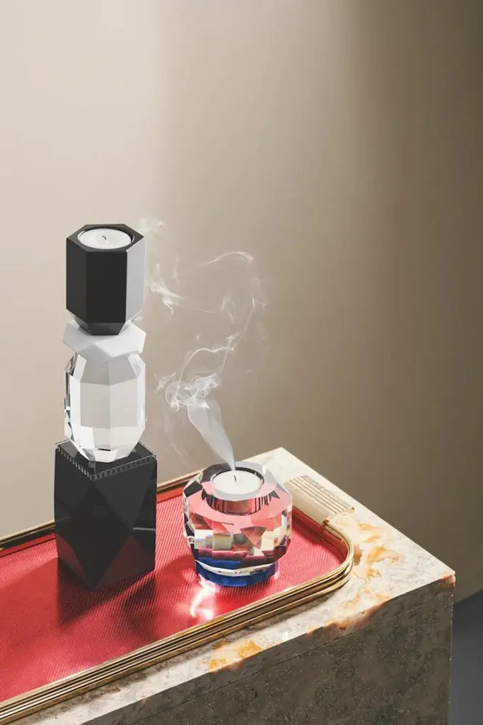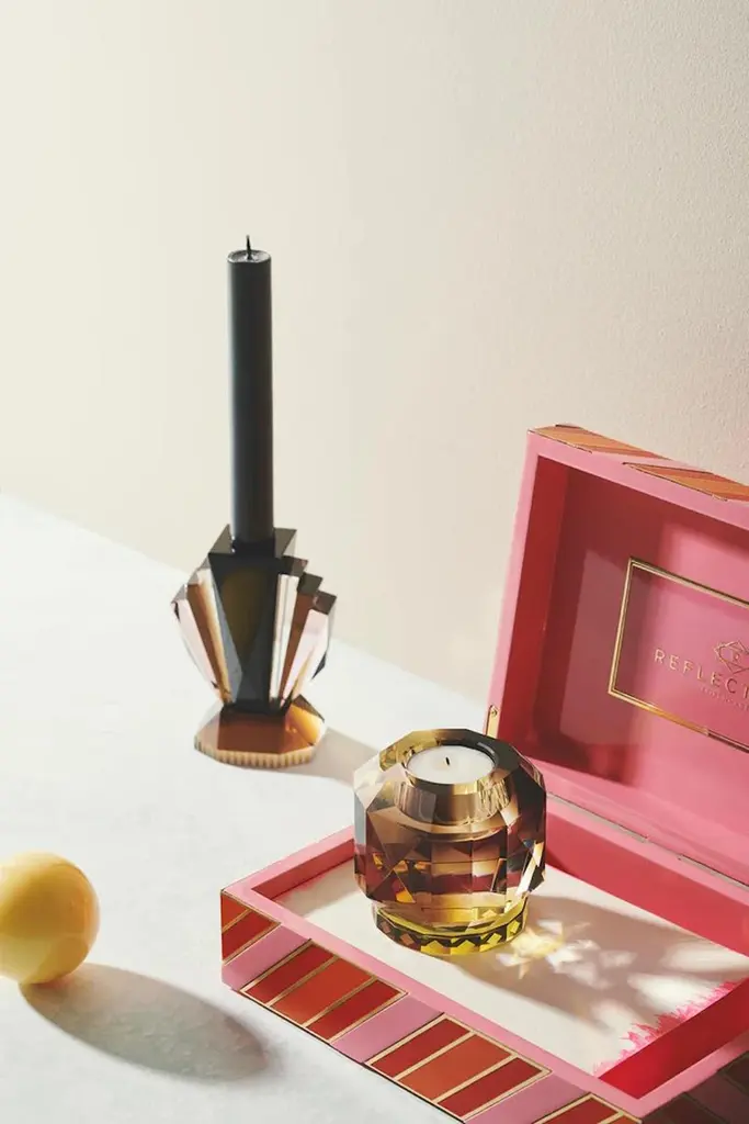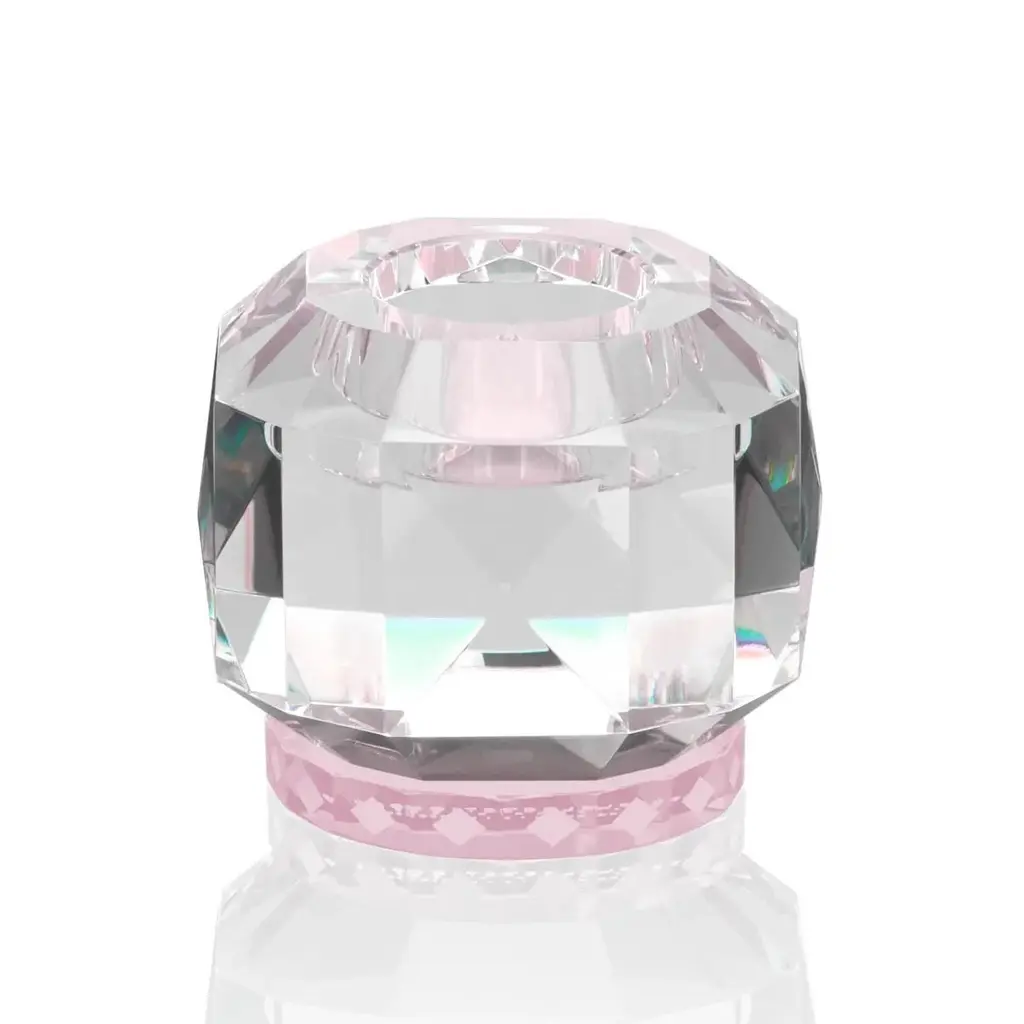 Crystal candleholder available in four colours: Transparent/Brown/Yellow, Transparent/Amber, Transparent/Pink and Transparent/Black. Strategically placed, the crystal candleholders become dazzling elements that capture the attention of your guests. Estimated production time: 2 to 6 weeksh: 8cm, w: 9cm, d: 9cm