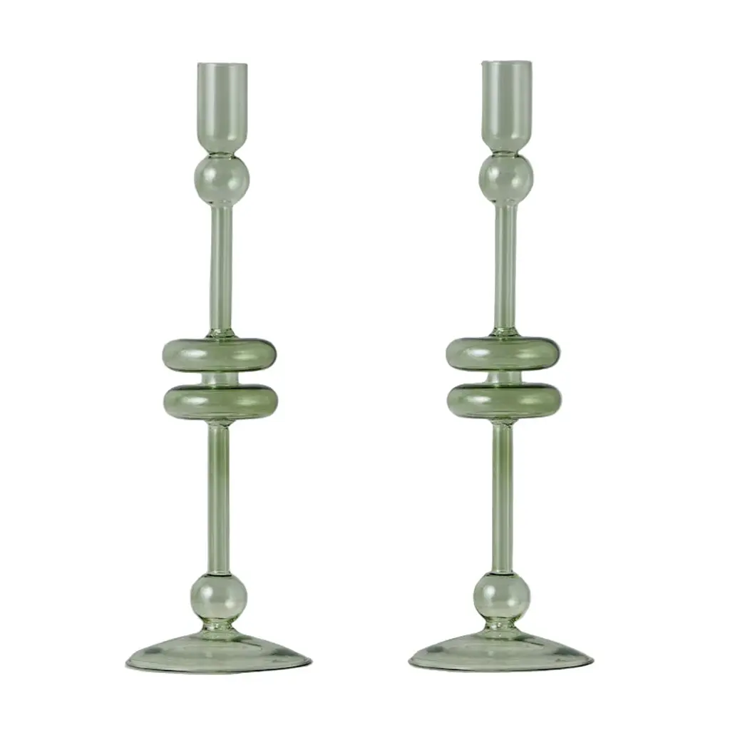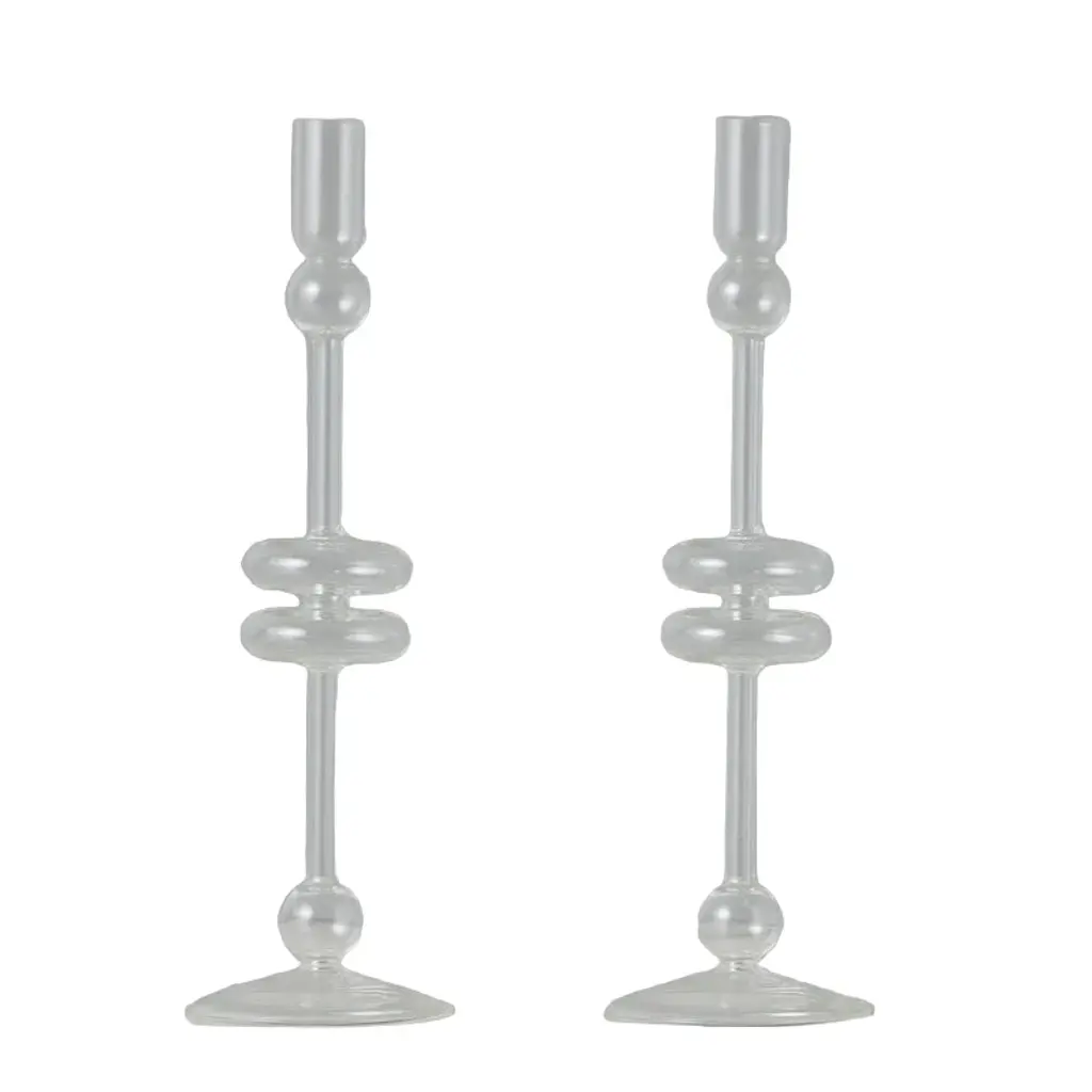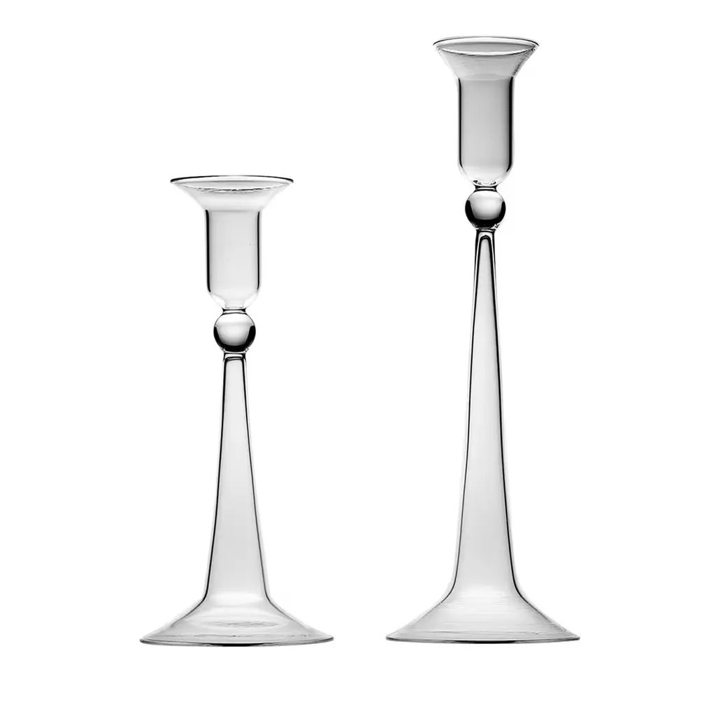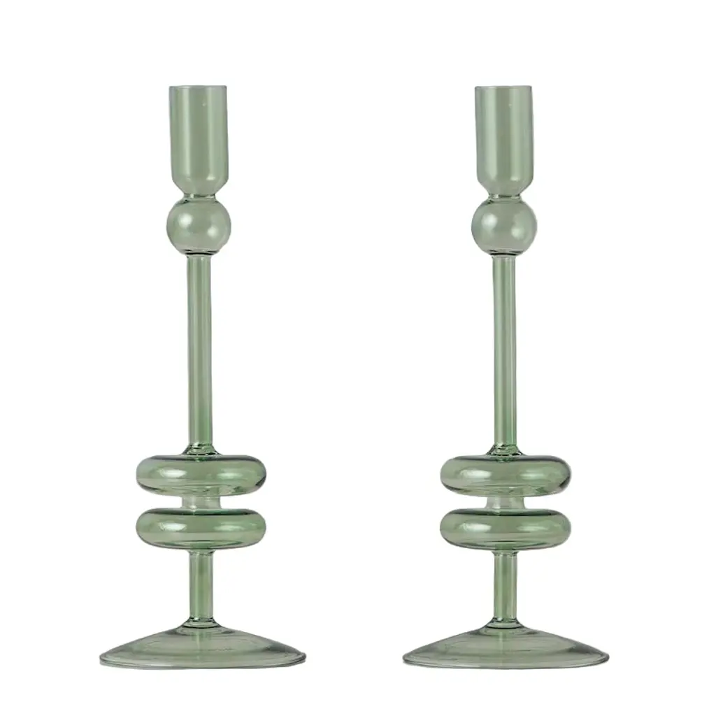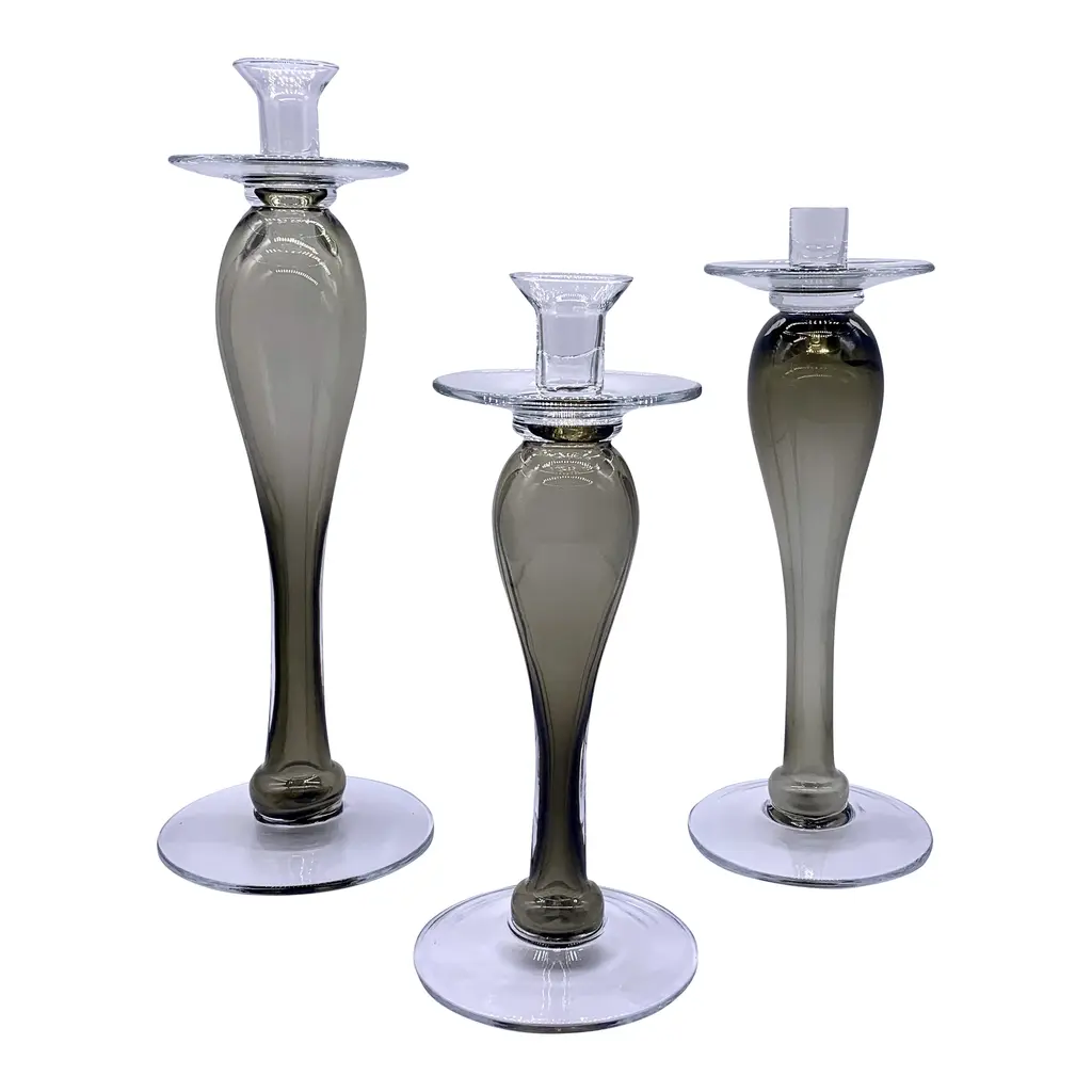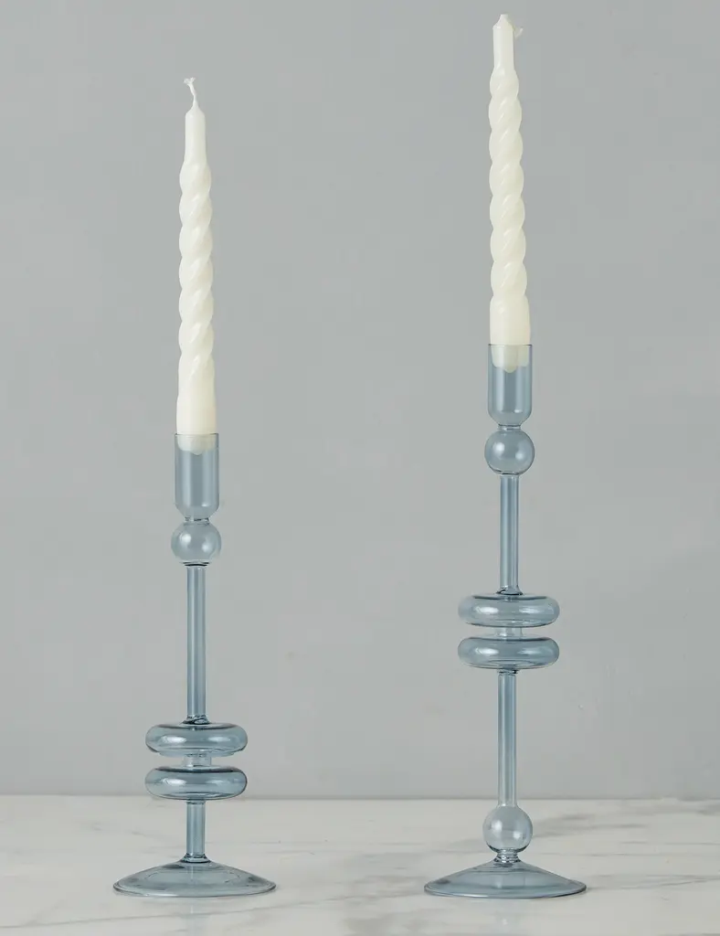 Elevate your home decor with a pair of Denim Glass Candlesticks. These expertly crafted taper candle holders add a touch of timeless elegance to any room. Available in two sizes and three colors, they are perfect for adding a pop of color to your dinner party or creating a statement throughout your home. Mix and match the sizes and colors to create a memorable tablescape. The pair will be 2 of the size that you select. These candlesticks pair perfectly with our Twisted Taper Candles. Hand wash only. Never use sharp objects to remove hardened wax drips.