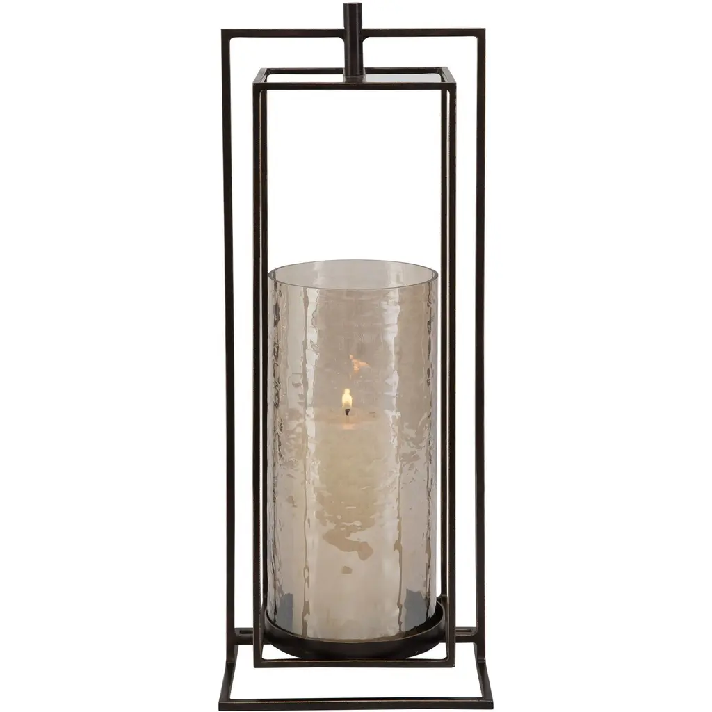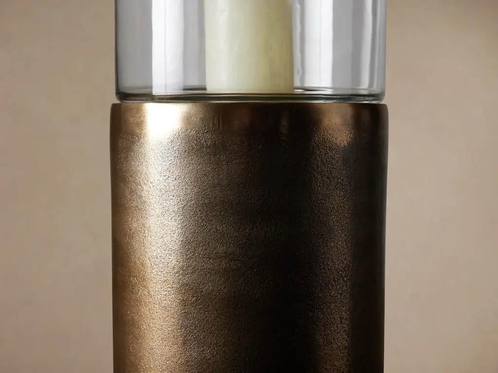 The perfect accompaniment to any décor, this modern floor hurricane is crafted by Indian artisans with a mouth-blown glass cloche accented by a top metal ring. Grounded by a textured aluminum base decorated with distressed antique brass finish, this hurricane allows your favorite candle to glow with an elevated, sophisticated appeal. Crafted in India from textured aluminum and glass. Aluminum base features a distressed antique brass finish. Can be used outside but should not be used outdoors year-round.