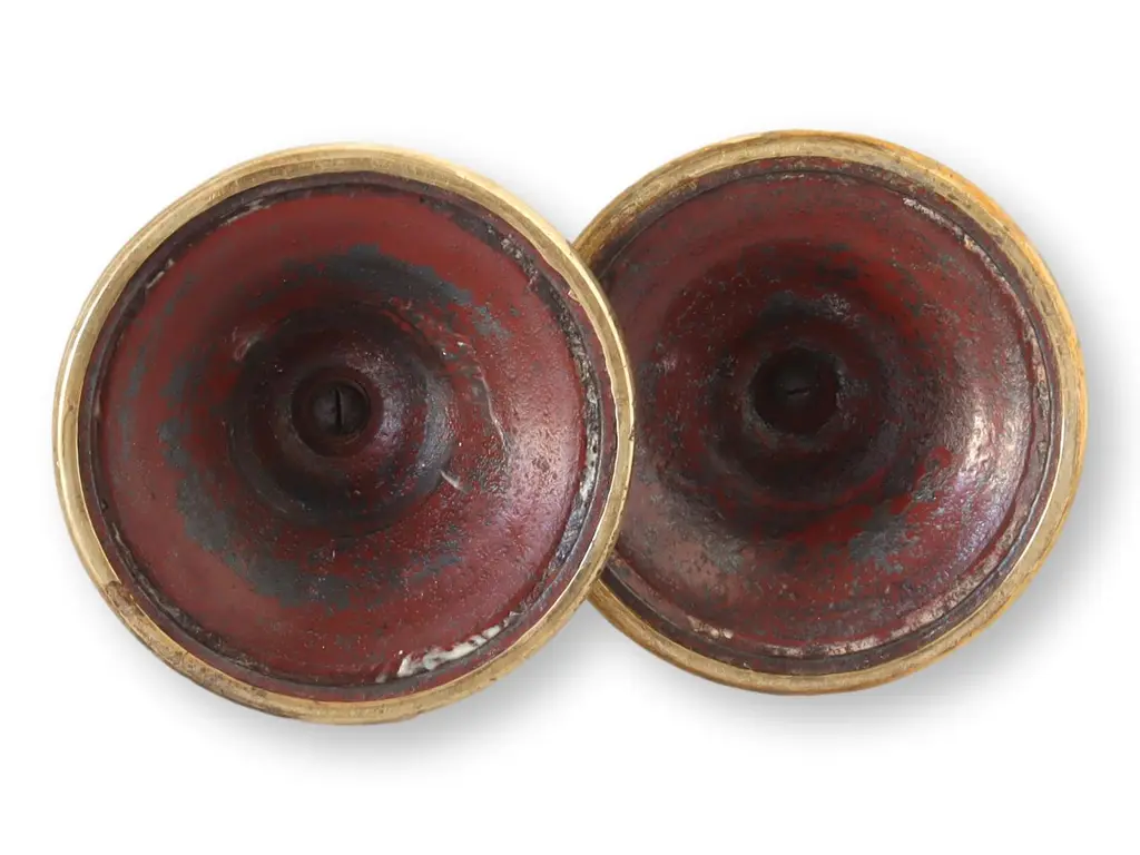 Infuse your space with radiance using this pair of early 19th-century brass candlesticks. Notable for their elegantly undulating candle cup tops, they introduce an element of grace to the overall design. There is no maker's mark.