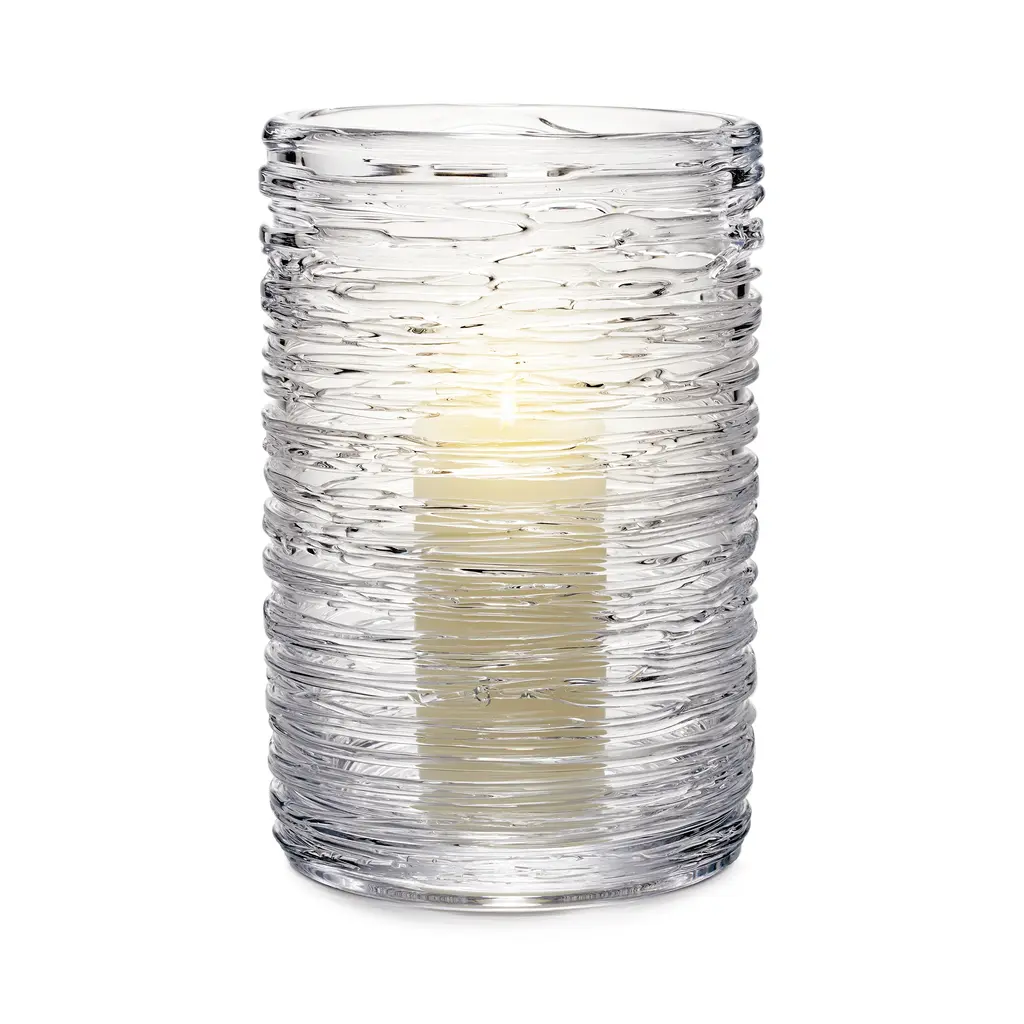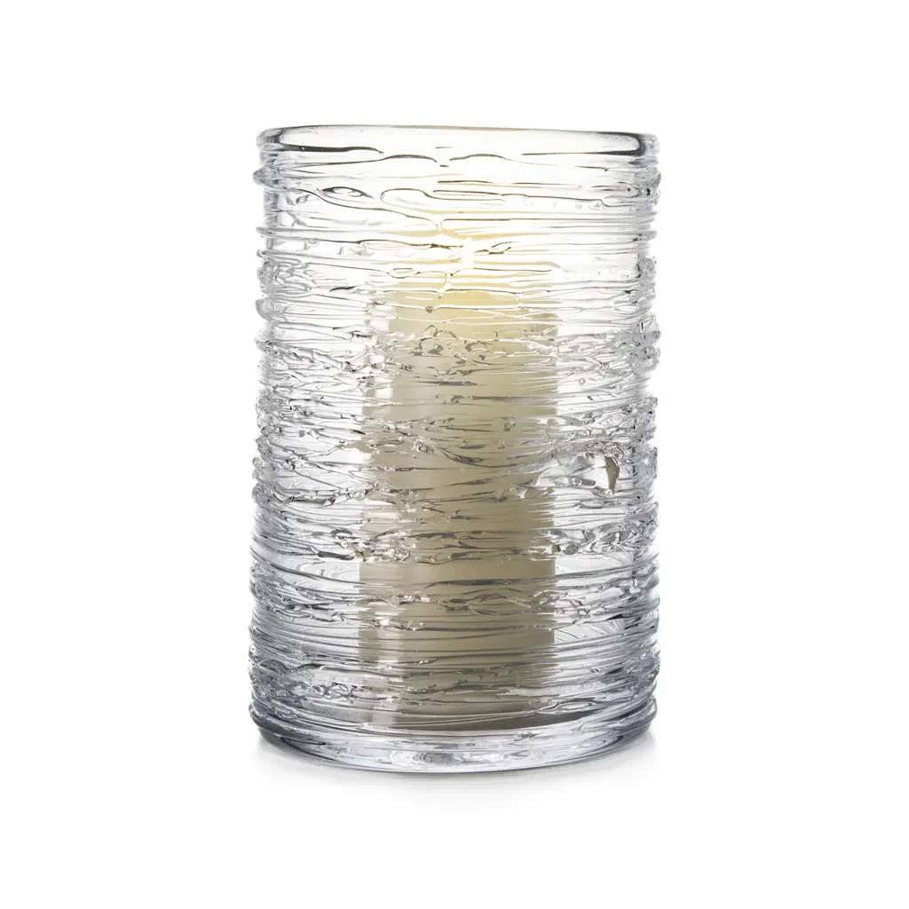 Embrace the constantly changing beauty of nature with the Echo Lake Hurricane from Simon Pearce. Master glassblowers skillfully wrap delicate strands of glass to create a unique, cylindrical silhouette, inspired by the rivers and streams of Vermont. Add in your favorite candle to create a sparkling display of light and shadow. Highlights