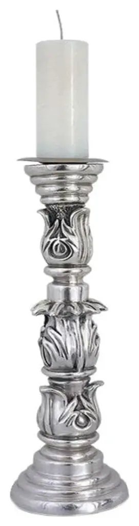 Chaste in design, the Elegant Tall Candlestick by D''Argenta proclaims its value, not through meretricious ornamentation, but through simple and graceful fluted lines and scrolls. Its unpretentious motif makes it the perfect accent to any room''s decor, and an ideal gift for weddings, anniversaries, and special occasions. Weight: approx. 10 lbs. About D''Argenta Silver EleganceOrnate in design, exquisite in detail, and beautifully elegant, the Sterling Silver Plated products created by the artists of D''Argenta Silver Elegance are the perfect heirloom quality pieces for any home. The distinctive sterling silver designs stand out against the black neillo inlay and the intricate detail is breathtakingly attractive. D''Argenta Silver Sculptures and objects d''art offer unparalleled excellence in quality and exquisite attention to detail, because they are the hallmarks that have established D''Argenta as a leader in the export of precious metal-finished art for over a quarter of a century. Each of the over 200 limited-edition sculptures, personally signed by the artist, is technically flawless yet competitively priced..the same master-craftsmanship received in pieces that have been gifted to royalty, heads of state and the Vatican. From the surface detail of the innumerable tumuli and broad swells that impart the hides of the elephant collection to the graceful lines that capture the motion of a stallion''s gallop, you will marvel at the beauty of your truly unique acquisition as it graces a special place in your home. Historically, sculptures composed of precious metals were crafted using the traditional hot casting process. 25 years ago, the artisans at renowned metal art company D''Argenta introduced an advanced new metalworking technique that changed the way precious metals are sculpted. D''Aragenta''s new method combined cold casting and electroforming to create intricate, finely detailed sculptures. The pieces are initially plated with a . 015 inch (400 micro) thick layer of copper, then plated with silver or (24K) gold at a thickness of . 001 inch (24 micro). Each sculpture''s interior is composed of a polyester fiberglass core that strengthens sleek metal plating. After being formed, each piece is coated with a protective lacquer to prevents tarnishing and maintain luster. This final step ensures that all D''Argenta sculptures, though crafted with fine silver, do not require polish or any type of metal cleaner and can be simply dusted with a dry cloth as needed. Exported around the world and now available in over 25 countries, D''Aragenta''s products have won international acclaim because of their innovative construction and exquisite beauty. In 1981, D''Argenta was recognized with the Bulgarian Government Gold Medal award. In 1992, a D''Argenta sculpture was gifted to His Royal Highness Prince Naruhito of Japan on a visit to Mexico. A nod to the company''s exclusive prestige, D''Argenta sculptures have been gifted to an increasingly long list of dignitaries, including Pope John Paul II, Prince Phillip of England, and his Majesty King Harald of Norway.