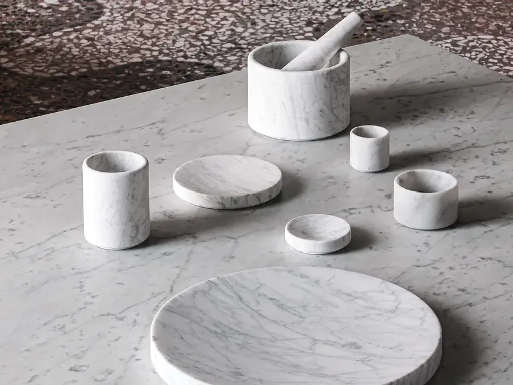 John Pawson has created a family of vessels and utensils for the home whose powerful affinities include rigorous simplicity of form, materiality and function. Each of the pieces comprising the Ellipse Collection is fabricated from a single seamless piece of Bianco Carrara marble. Circular in plan, the pieces share details of geometry and proportion, with variation in the character of the internal curve determined by embedded rituals of use. Contrasting polished and sandblasted textures create subtle differentiation between flat and contoured surfaces, for the eye and for the hand.