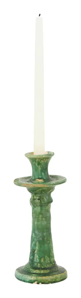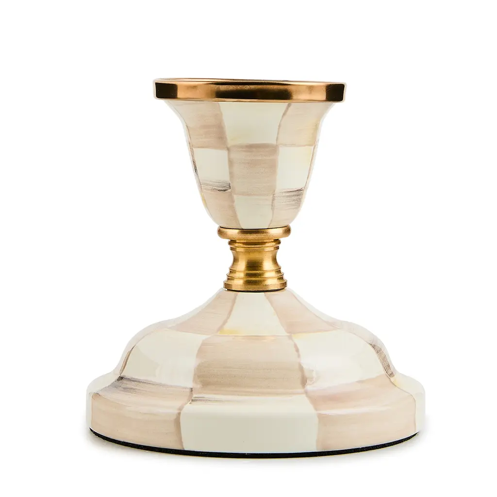 The Emerald Check Large Candlestick is made of enameled steel, rimmed in bronzed stainless steel, and decorated with hand-painted, color-dragged Emerald Checks. Display it with a dinner candle singularly or with its Emerald Check counterparts for a dimensional grouping.