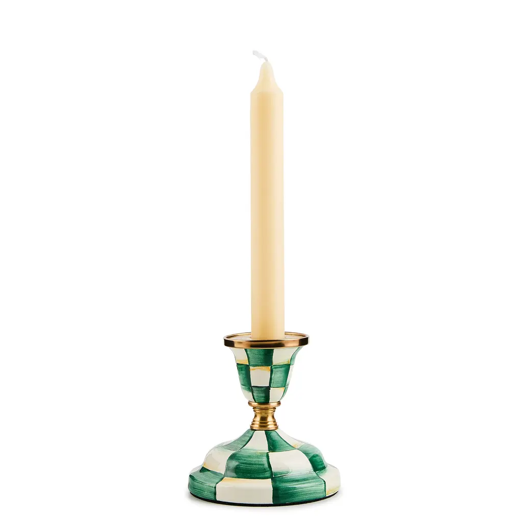 Cast a welcoming glow in an entry hall or illuminate an impromptu potluck with old friends. The Emerald Check Short Candlestick is made of enameled steel, rimmed in bronzed stainless steel. With a verdant palette woven by an artisan's brush through the glossy, hand-painted checks, this radiant candlestick is spellbinding on any tabletop.