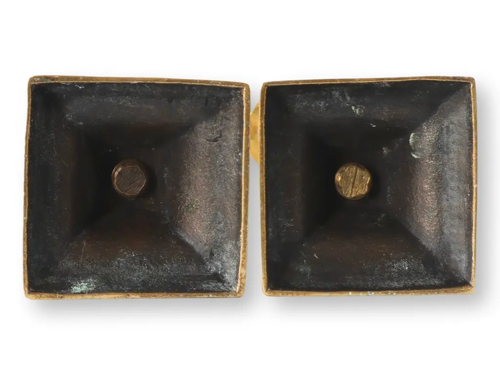 Elevate your decor with this pair of antique English brass candlesticks. Featuring an elegant open twist design and stepped square bases with intricate detailing, these candlesticks exude timeless charm. Their gleaming brass finish adds warmth and sophistication, making them perfect for mantle displays, dining tables, or as a distinctive touch to any setting. A refined piece of English craftsmanship that blends beauty with functionality.