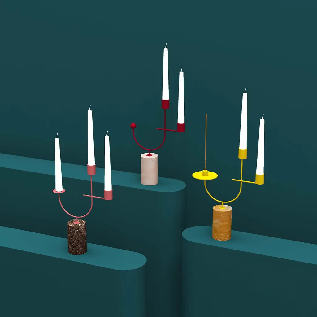 The timeless elegance of ruby red and the refined personality of White Carrara marble elegantly interact to create this candle holder, iconic addition to a contemporary interior. The lush, airy metal structure is comprised of a curved arm balancing a small sphere on one side and a short, cylindrical candlestick on the other, completed with a further perpendicular arm also sustaining a candlestick. The cylindrical base is available in a variety of marbles, please ask the Concierge for details.