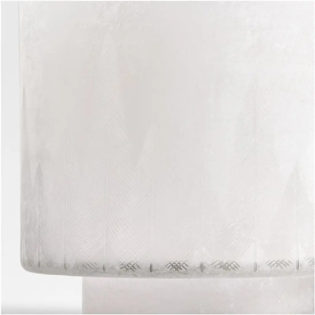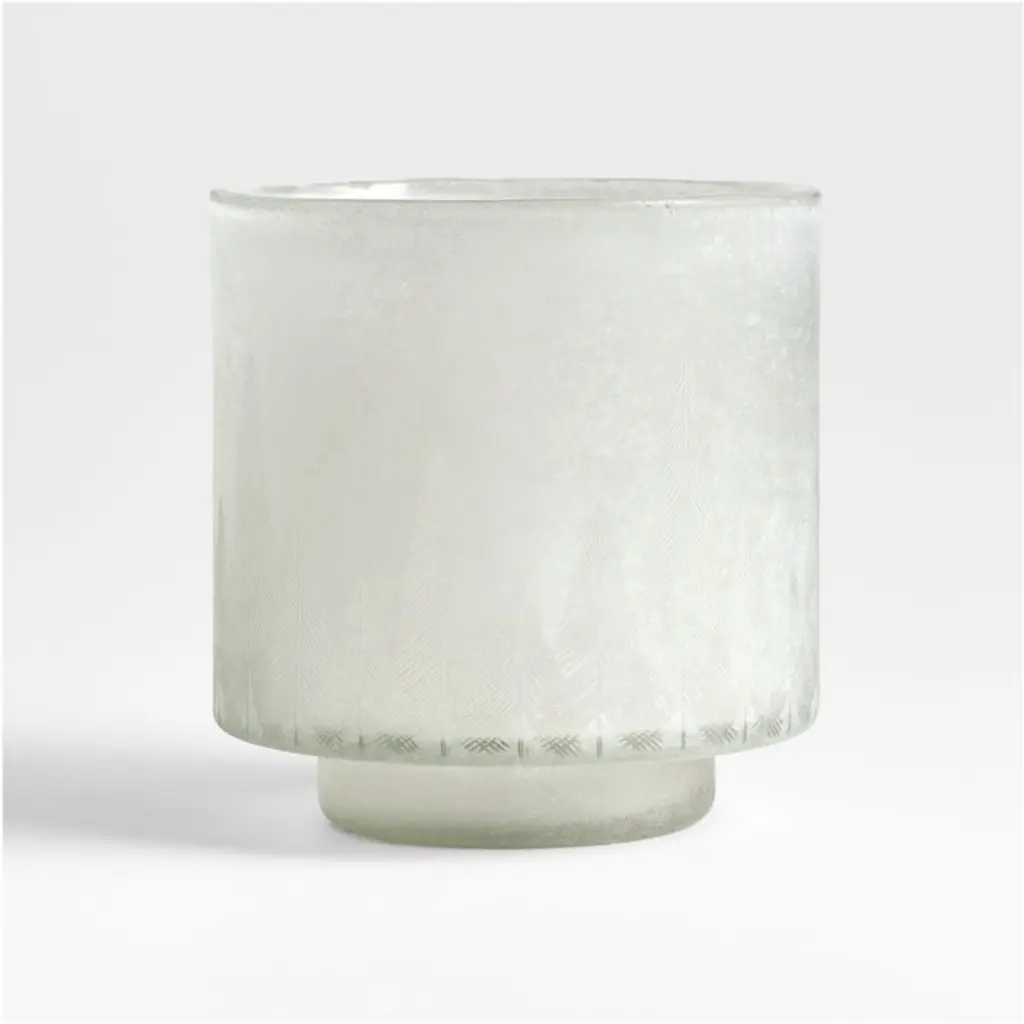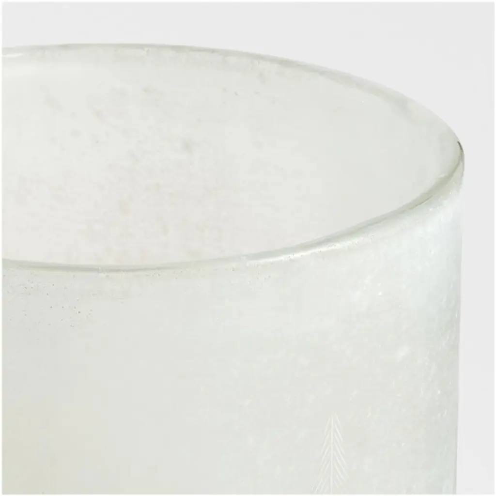 Etched with pines around the perimeter, our frosted glass candle holder recreates the magic and stillness of a snowbound forest. The hand-etched design throws intriguing shadows while the frosted finish diffuses candlelight for a soft glow. A recessed pedestal base adds elevation and gives the hurricane a modern look.