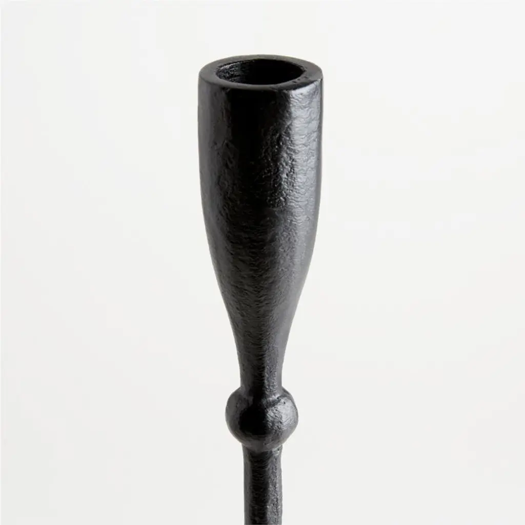 Ferric updates antique cast iron candlesticks with an impeccable balance of modern and vintage style. Dramatically tall and slender, our three taper holders shape black-finished metal with rustic geometry and texture. Group this set of small, medium and large candle holders for a graceful arrangement on your fireplace mantel, dining table or sideboard.