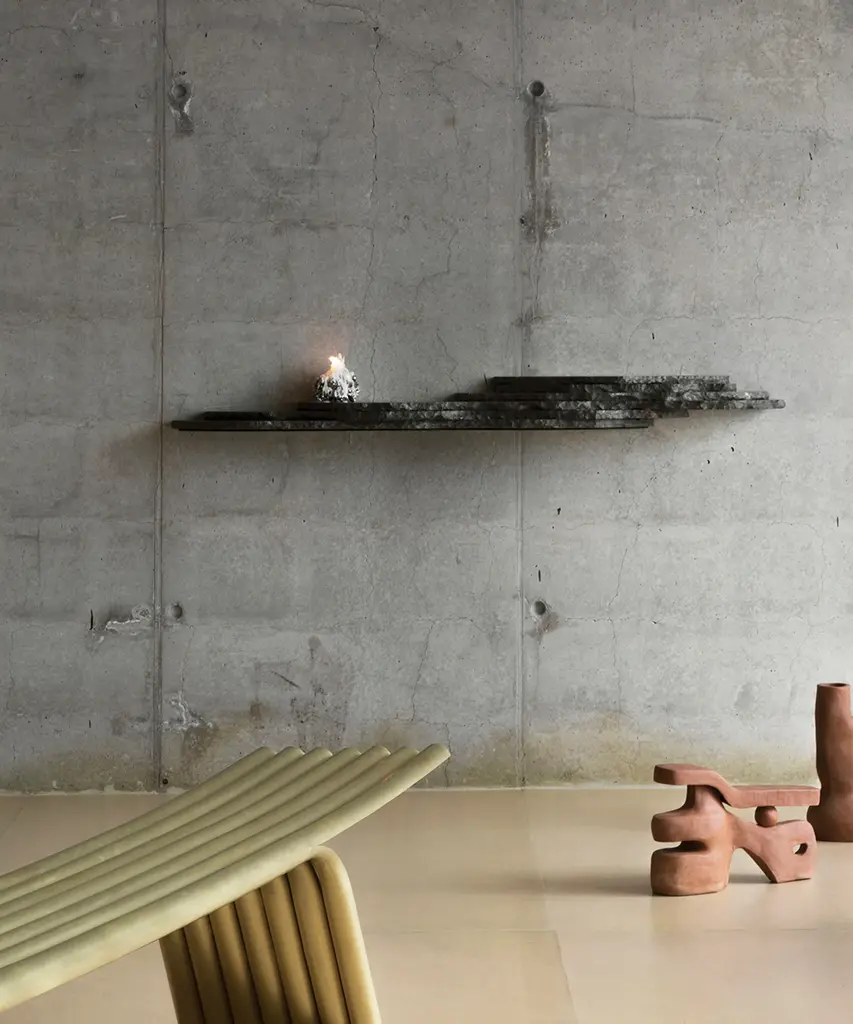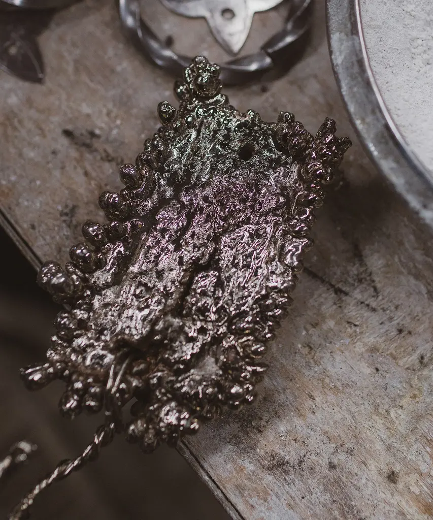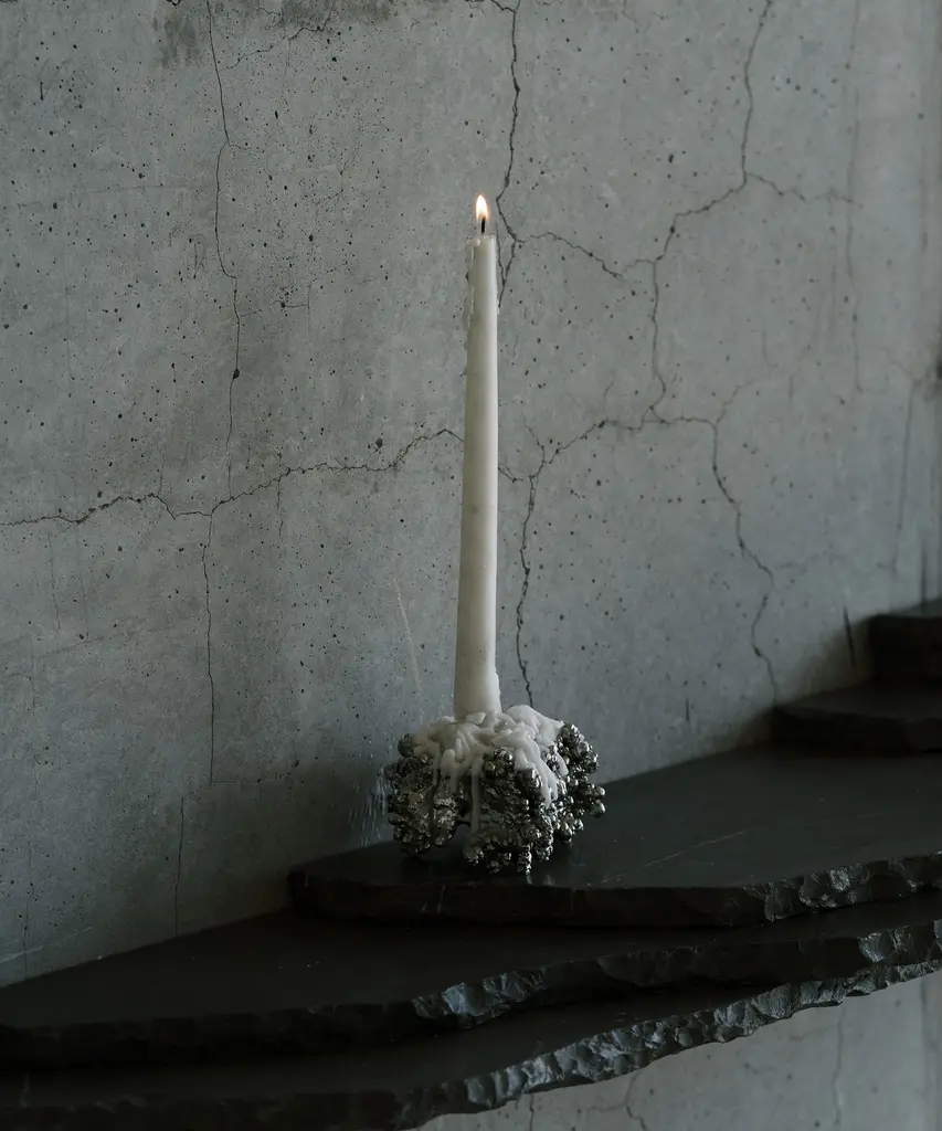 Chrome Candle Holder is the first in a series of pieces that integrate the use of upcycled electroplating rods. These rods, regularly used for submerging metal items into chrome baths, pile up residue through the years which results in heavy conglomerates of copper, nickel, and chrome. Byproducts of an industrial process but which remit to organic forms. This paradoxical entity whose finish stands as the "stereotype of the artificial" (Enzo Manzini), also directly references the natural, with coral-like formations. The specificity of the material's unique pattern formations reins over the object's final appearance. Chrome Candle Holder reveals itself as foreign, almost alien-like. The piece seems to have been recovered from the bottom of the ocean on a lost planet. It is generative in the sense that it accidentally opens a narrative. An object that generates a fissure from which fantasy spills into reality. Informing an imaginative play and creating a scenography from a parallel fiction. Panorammma is a furniture design atelier based in Mexico City that seeks to redefine our relationship with functional objects through experimentation with materials and form.
