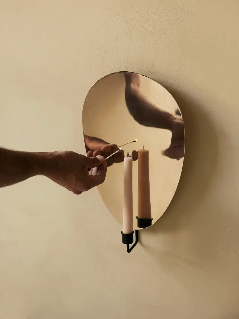 Inspired by French modernist lighting fixtures and designed to resemble a flickering flame, Flambeau is a sculptural design with playful presence. The metal backplate magnifies and reflects candlelight to create intriguing shadows and beautiful ambience.