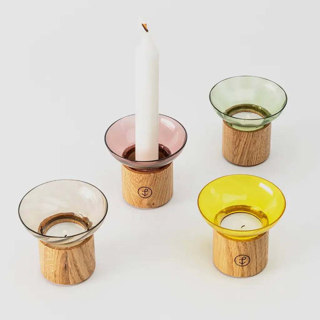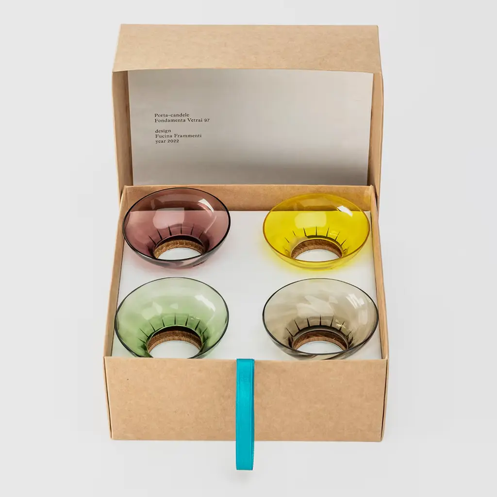 A refined combination of materials celebrating Venice characterize each of the four candleholders composing this vibrant polychrome set. Named after the address where Vincenzo Zanetti - abbott who is said to have guarded the secrets of glassmaking through the years - was born, the set combines Murano glass bobeches with simple bases made from "briccola" wood. Four tealights are included.