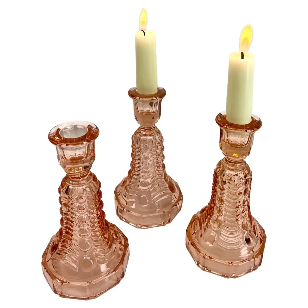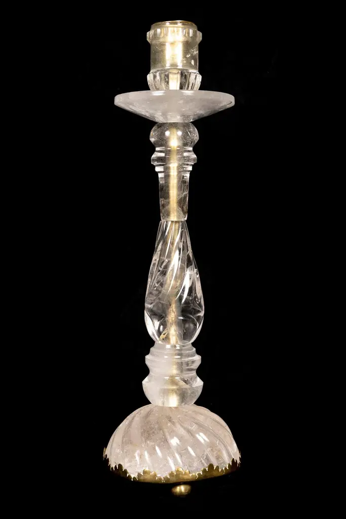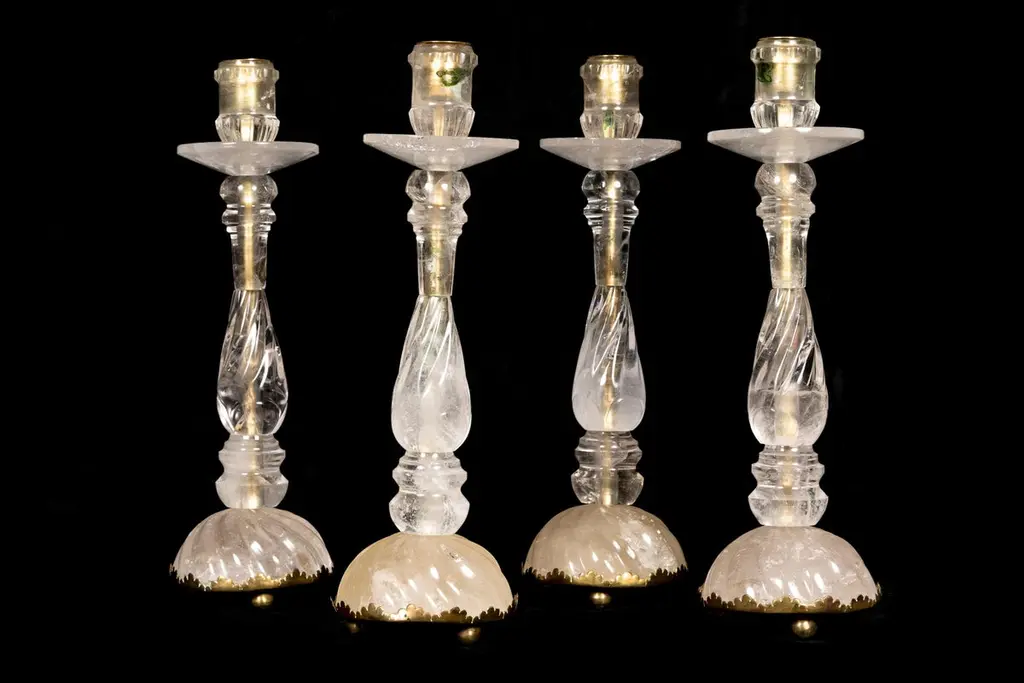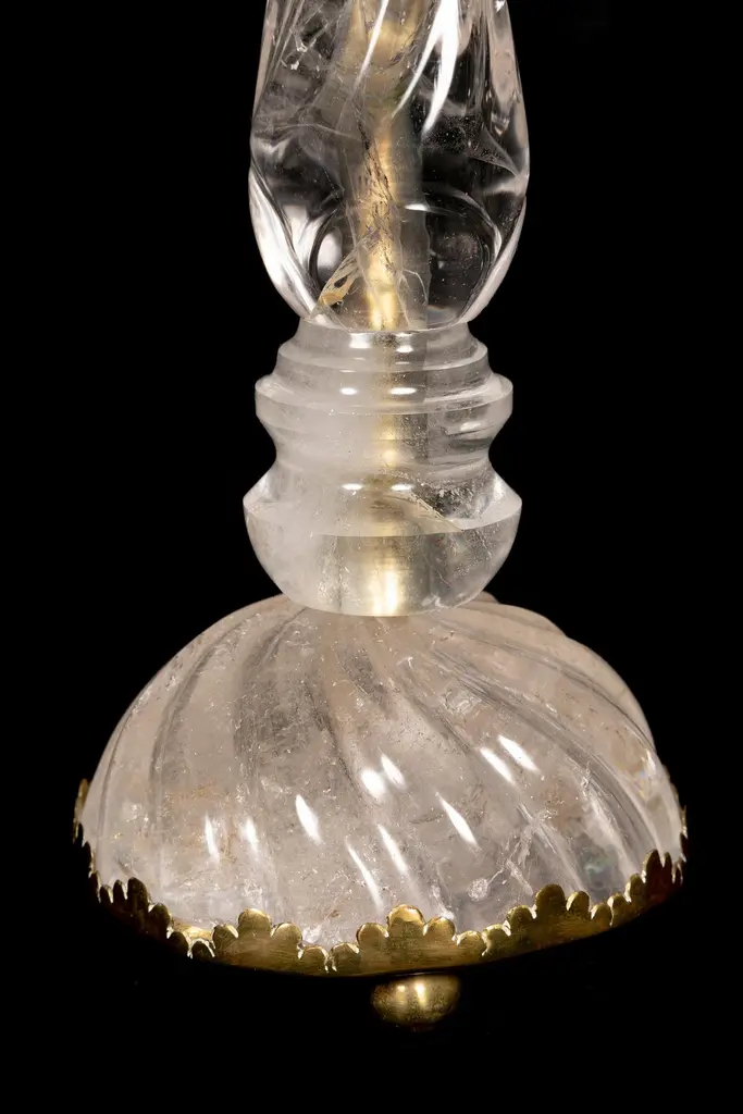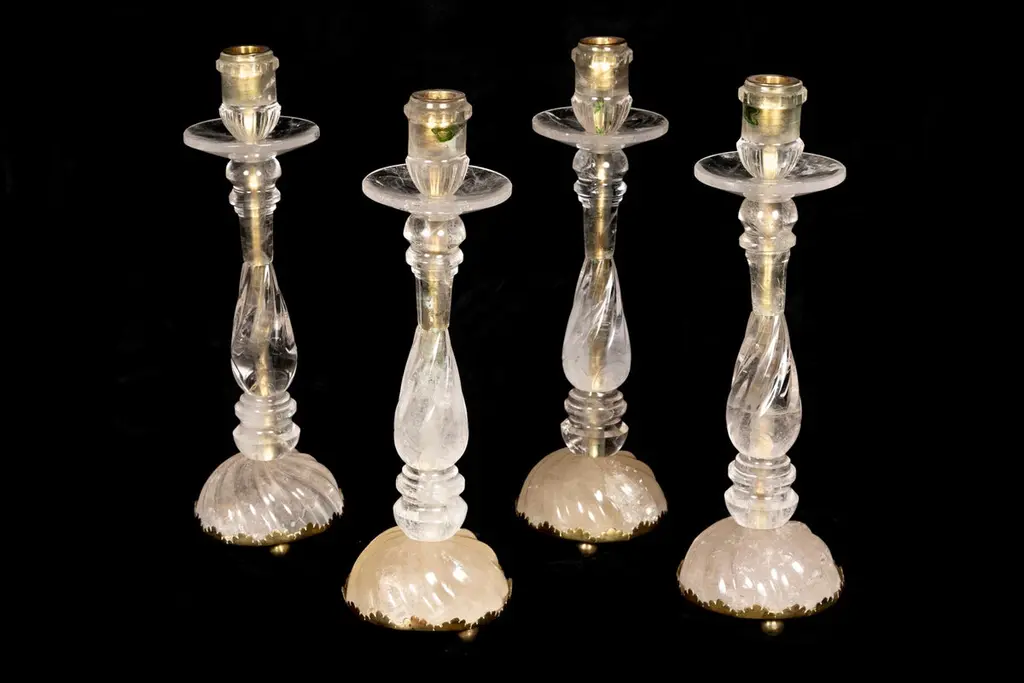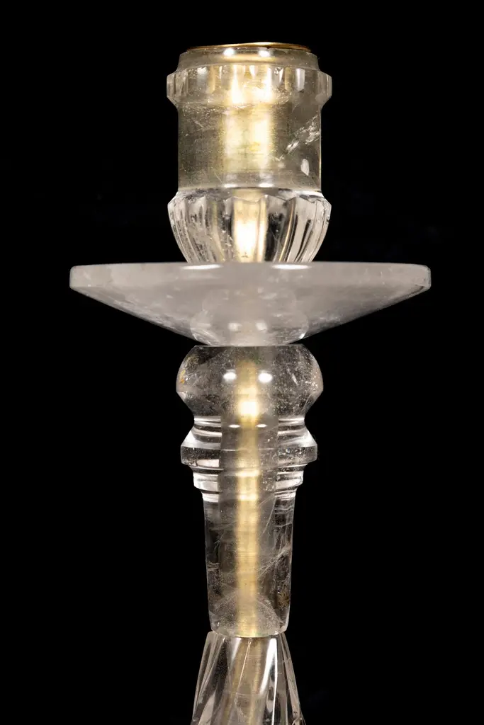 Four large and elegant Louis XVI-style candlesticks composed of rock crystal quartz with bronze mounts. Each candlestick is constructed in multiple sections of faceted and carved quartz, assembled around a central bronze rod. The tall baluster-form stems are cut with spiral fluting and stepped collars, rising to a circular drip pan and a cylindrical nozzle fitted with bronze liners. The drip pans are broad and flat, designed to catch wax, and are also worked in quartz with sharp geometric edges. The bases are domed and carved with a scalloped swirl pattern, also executed in rock crystal quartz. These rest on small bronze ball feet that elevate the structure slightly above the surface. The lower edge of each base is enclosed by a scalloped gilt bronze rim, securing the quartz while adding structural reinforcement. The combination of natural clarity and internal inclusions within the quartz provides subtle variation across the four examples, emphasizing their hand-carved execution.The Louis XVI style is reflected in the symmetry and architectural balance of the design, combining classical forms with the use of precious materials. Rock crystal was a favored material in high-end French decorative arts, often paired with gilt bronze to achieve both durability and refined presentation. These candlesticks demonstrate the technical precision required to cut and shape large pieces of quartz into uniform sections. Their scale and material align with the traditions of late 18th-century French luxury objects, where hardstone and gilt bronze were employed in both lighting and ornamental pieces.