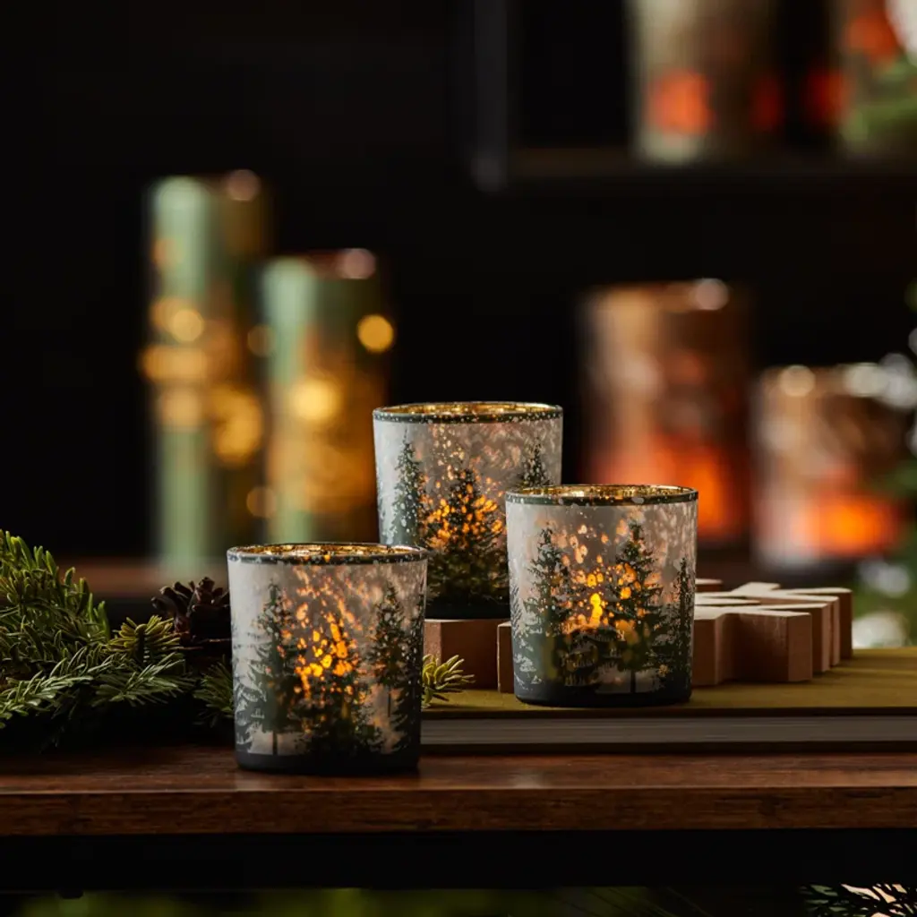 Bring a warm, rustic charm to your holiday decor with the Frosted Pine Mercury Glass Candle Holder Set. Featuring a beautifully printed pine tree design with delicate speckled snowflakes, these votive holders create a cozy winter ambiance. The shimmering gold interior enhances the glow of a candle, casting a soft, inviting light. Crafted from high-quality mercury glass, this set of three is perfect for adding festive elegance to any space. Ideal for your mantel, tabletop, or as part of a holiday centerpiece. Just add your favorite votive or tea light candle to complete the look. Sold in a set of three matching pieces to make a statement in your home.