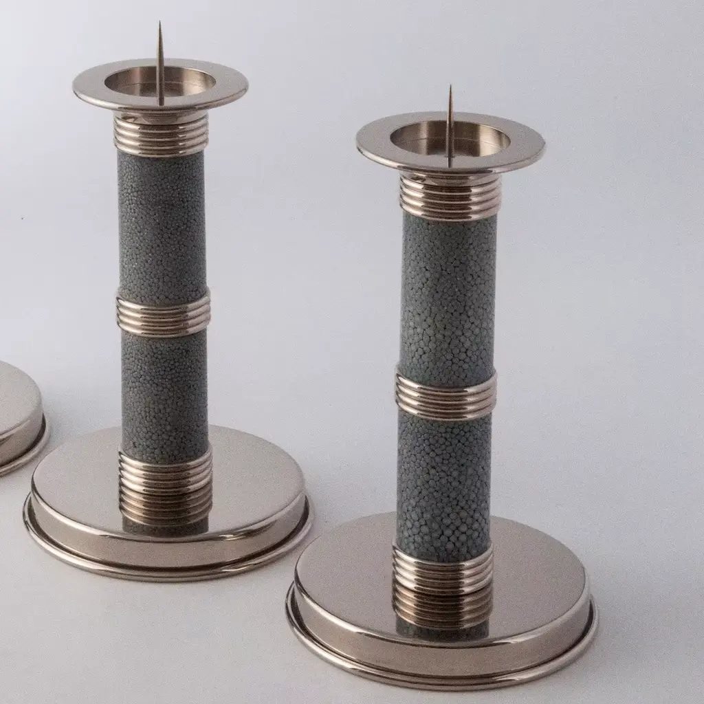 Lending a striking presence to a special table or in pair decorating an entryway console, this candlestick belongs to the Galucharme Collection designed by Nino Basso. Handcrafted of polished nickel-plated brass, the stem is covered in genuine sky blue shagreen and detailed with three grooved rings. The round base (Ø 11cm) and drip catcher (Ø 7cm) complete this Art Decò-inspired contemporary furnishing accessory that goes beyond functionality. Customized box and a care instruction booklet included with purchase.