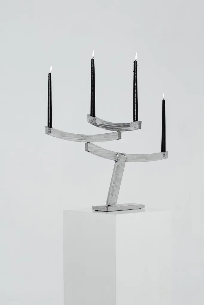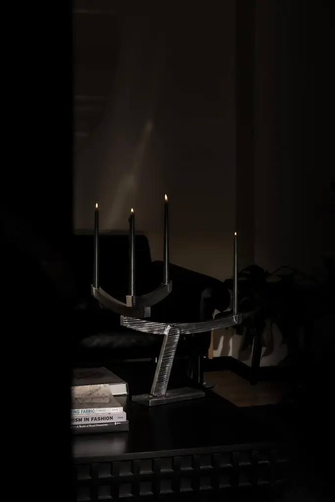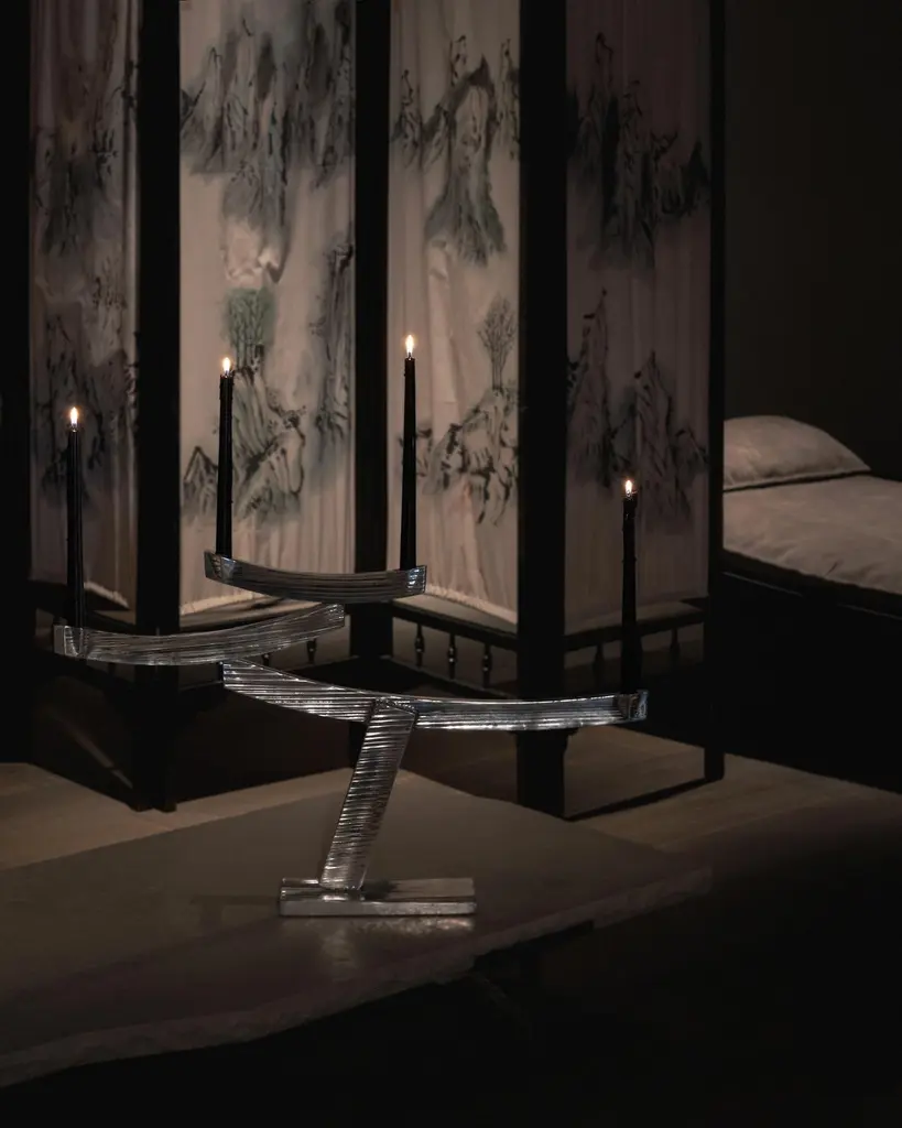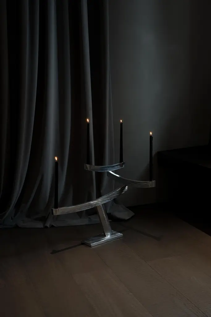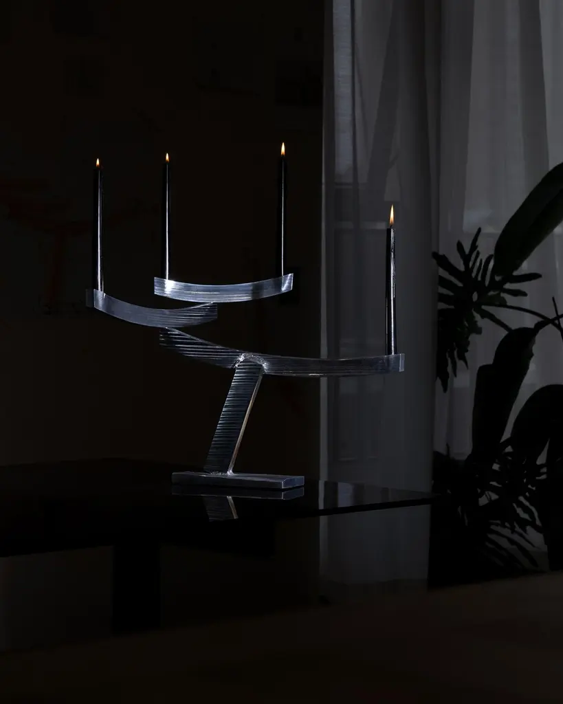 Geology Candle Holder by Atelier V&FDimensions: D 10 x W 80 x H 43 cm. Materials: Cast aluminum.The collection of「 GEOLOGY 」is our reflection and exploration of the synchrony of nature’s work and human intervention.「GEOLOGY candle holder 」 is inspired by a stone waste that has been water jet cut. The end result of an instant of the powerful water jet cutter’s work assimilates the thousands of years of weathering, reminding us of the strength of time. We created an artificial weathering effect on the surface and a natural curve that resembles Chinese calligraphy with its strength and softness. The outcome is dynamic like the Western sculpture and steady like the Eastern pine trees.「 GEOLOGY candle holder 」is portable and durable in use andbeautiful and spiritual in aesthetics.Atelier V&F was co-founded by Chen Furong and Vega Zaishi Wang in Shenzhen. Chen Furong graduated from the Shanghai Institute of Visual Arts, majoring in comprehensive design. And he started the design studios WUU and CHEN FURONG Studio. Vega Zaishi Wang graduated from the London College of Fashion and Central Saint Martin and founded the designer brand VEGA ZAISHI WANG. The designers’ professional background and artistic upbringing become the intrinsic character of Atelier V&F. Their expertise, professional knowledge, and years of experience in the design field are the fertile ground for the development and exploration of Atelier V&F that enable it to break the divide of territories and cultures, and with an inclusive narrative to interpret aesthetics and functionality. The two designers’ poetics of life and living, their respect for different materials’ true nature, and their unceasing pursuit of exquisite craftsmanship instill vitality into Atelier V&F’s works from artistic sculptures, installments, and space to practical and utilitarian objects. Vega’s intuitive riding on fashion’s romantic urge and flow andFurong’s philosophical perspective on practical design is combined in one artistic expression, making their works both detailedly practical and ceremonial. As a married couple, the duo instills powerful emotional strength to the work of Atelier V&F, trying to interpret and represent the non-utilitarian and simple beauty in a coldly rational and precise world.