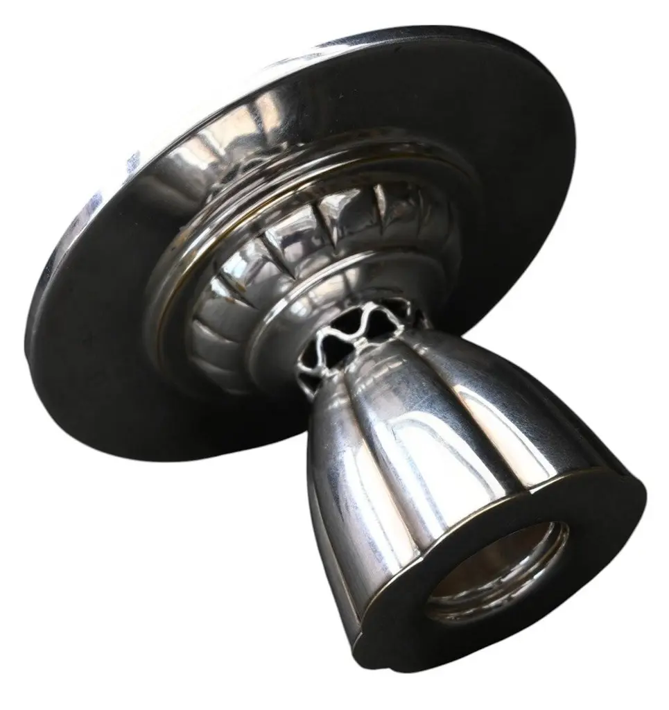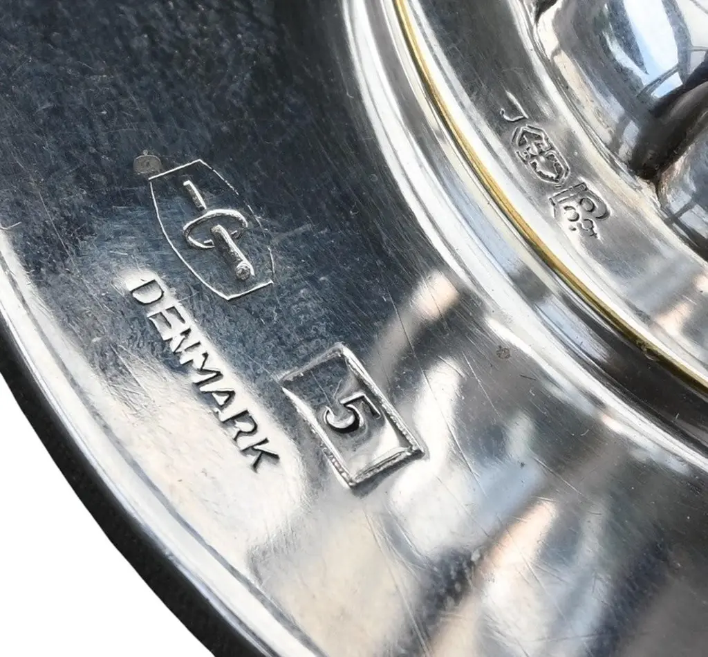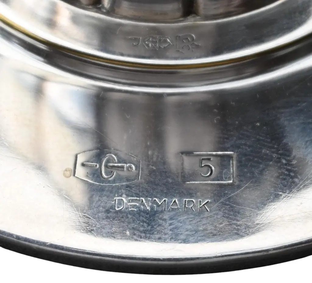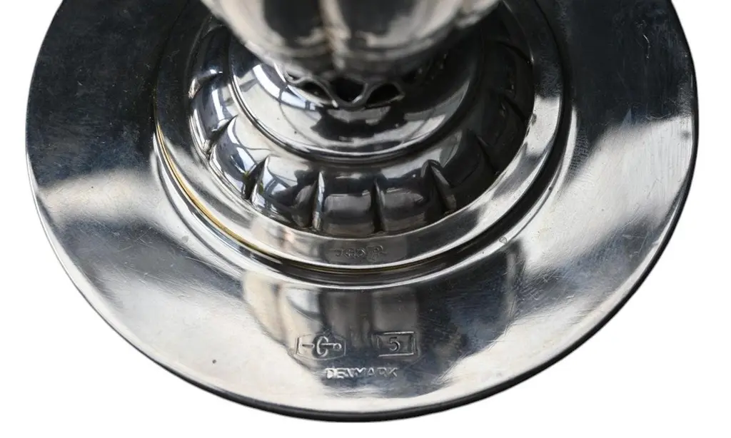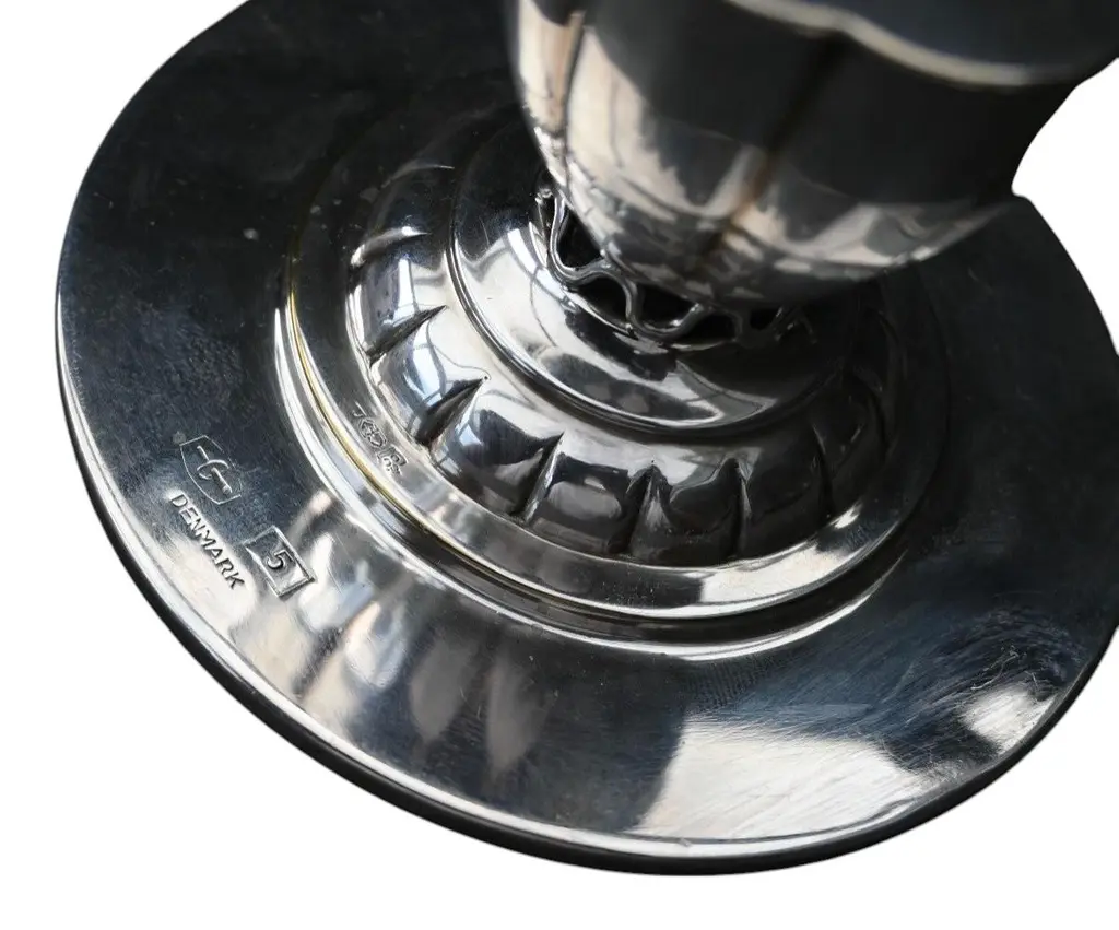 Offered for sale is an exquisite sterling silver candlestick, design No. 5, by renowned Danish silversmith Georg Jensen, based on a model by celebrated designer Johan Rohde.Crafted in Denmark in 1949, this elegant candlestick features Rohde's signature balance of classicism and organic form. The fluted, tulip-shaped socket rises above a tiered, circular base with refined detailing and pierced gallery work—hallmarks of early 20th-century Danish modernist design.Details:Designer: Johan Rohde (1856–1935)Maker: Georg Jensen SilversmithyDesign Number: 5Assay Marks: Three towers (Danish silver mark), date letter “J” (for 1949), Georg Jensen oval monogram, and pattern stampMaterial: Sterling silver (.830 or .925 purity typical for the period)Origin: Copenhagen, DenmarkHeight: 7 cm, diameter base 10.2 cmWeight: 100grCondition:Very good vintage condition with light surface wear consistent with age. No dents or major scratches. Professionally polished to retain its original brilliance. Marks are clear and legible.