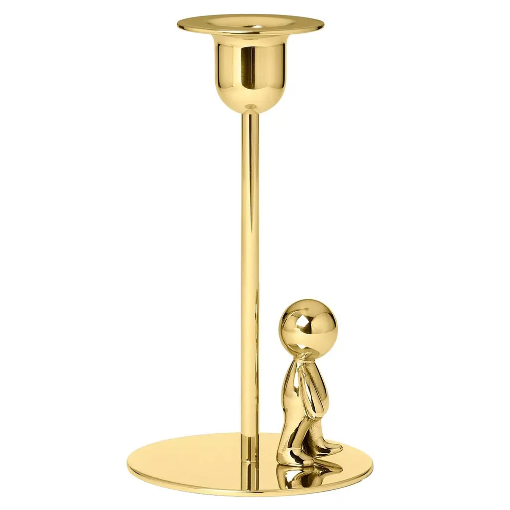 This delightful polished brass short candlestick is a creative accent for any modern interior. Designed for taper candles, the streamlined design boasts a rounded bobeche with a wide rim supported by a short column and a flat base. A small figurine of a man, effortlessly hangs onto the rim as if it were climbing into the bobeche.
