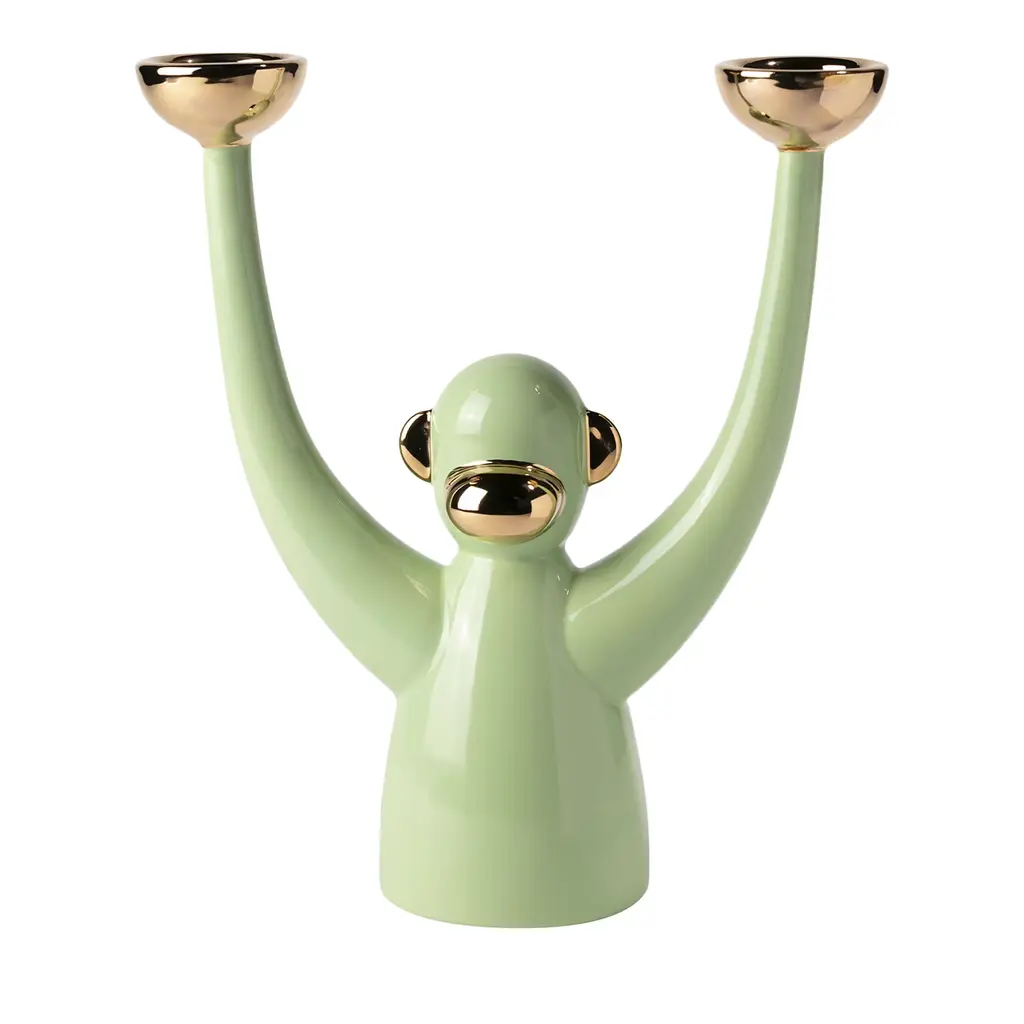 Marked by a timeless minimalist aesthetic, this sculptural double candlestick is a modern take on a traditional piece of home decor. Made of polished brass, the piece features two rounded bobeches with wide rims, two long, curved arms, and a flat base. Two small figurines complete the piece, one pensively sitting on the structure of the piece, while the other walks on its base.