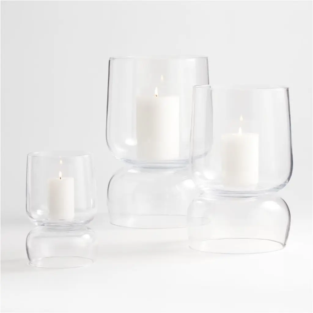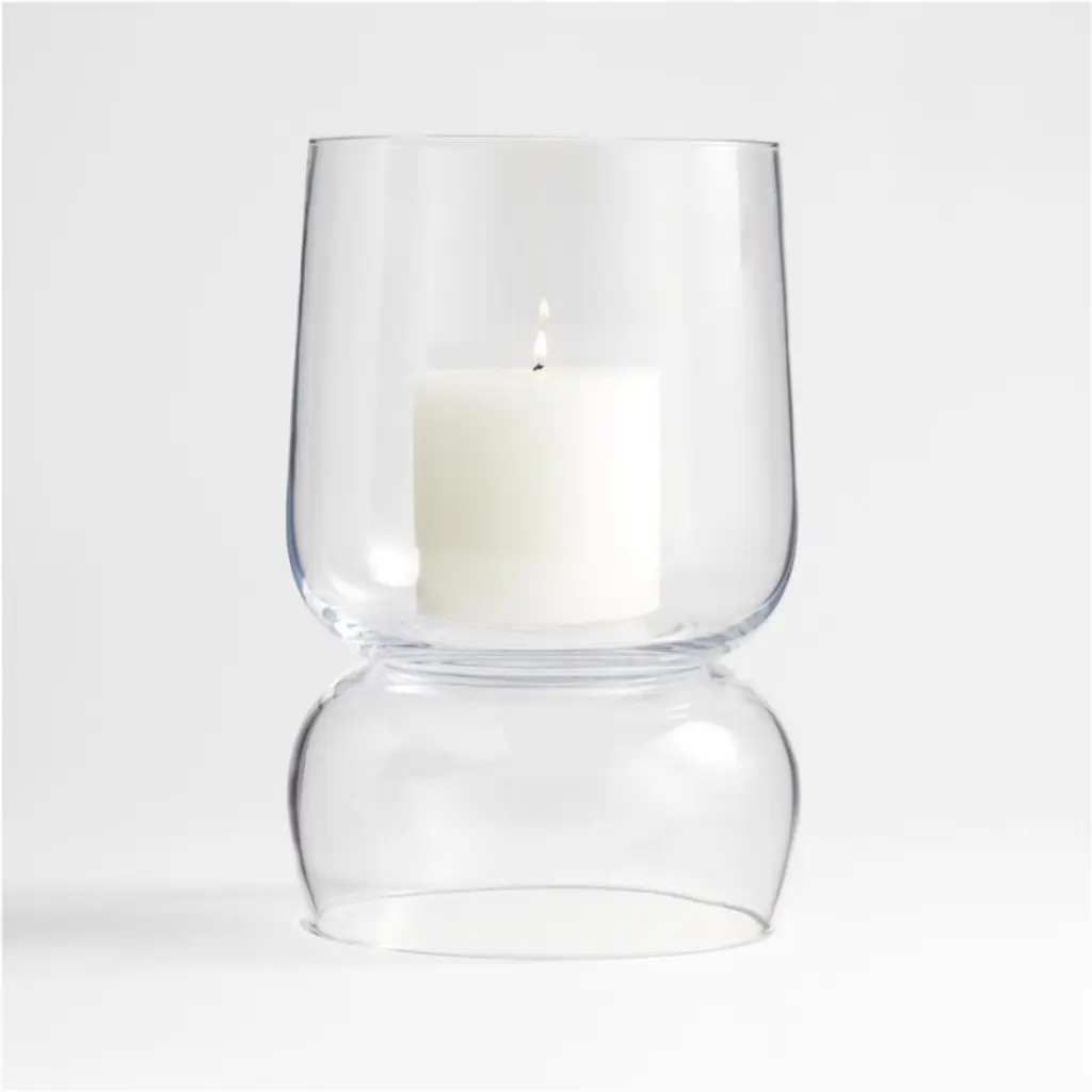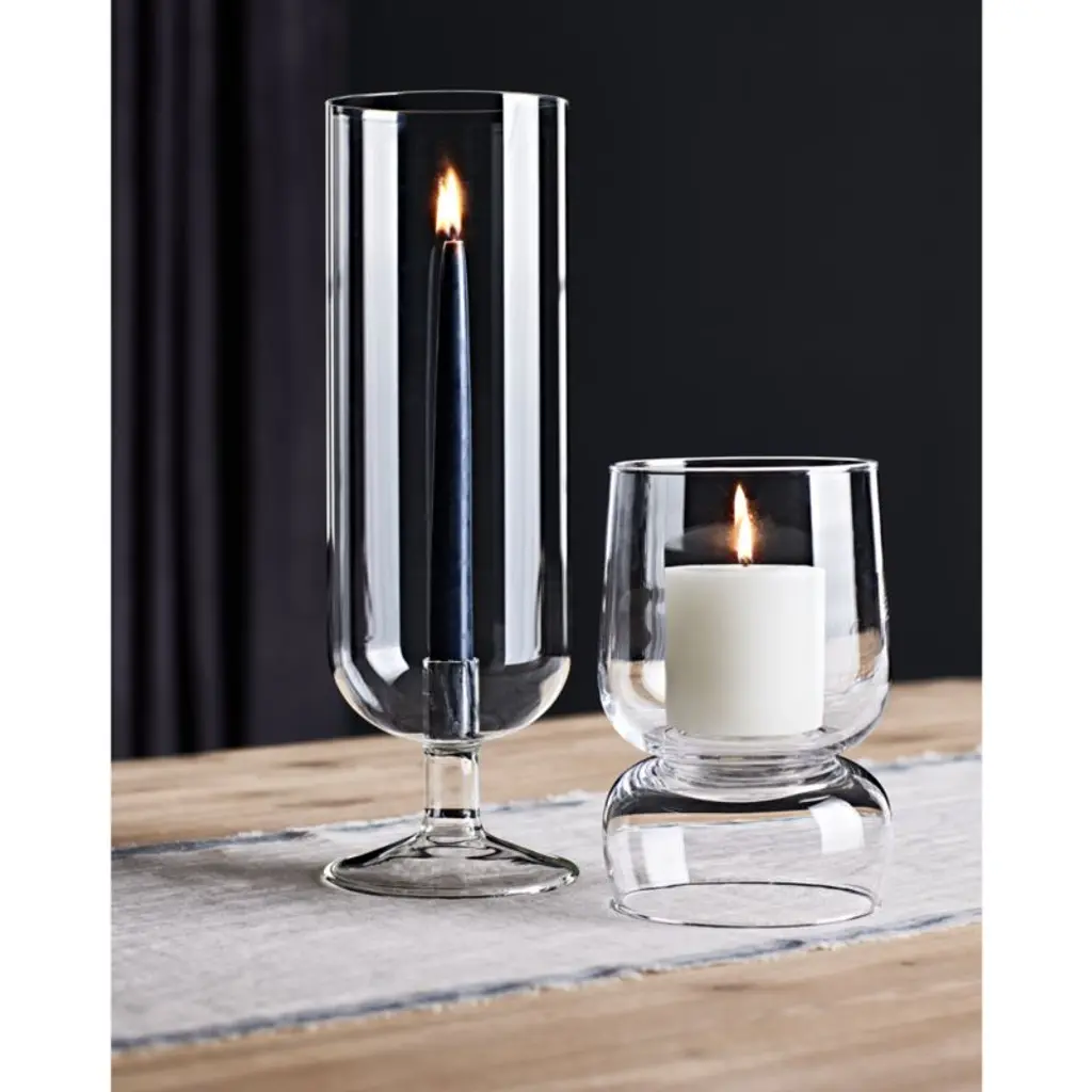 Shaped like an asymmetrical hourglass, our Glencoe hurricane holders have a double-sided design that offers lots of options to light up your space. The larger side facing up encloses tall pillar candles with a classic footed look. Flip the hand-blown candle holder over, and the smaller end elevates votive candles or fills with water for floating candles. Leave the bottom half empty for a clean look or fill with dried botanicals, shells or beach glass for seasonal accents. Made according to traditional glassblowing methods, the 13-inch hurricane holder combines with two other sizes in the collection for a multi-level display.