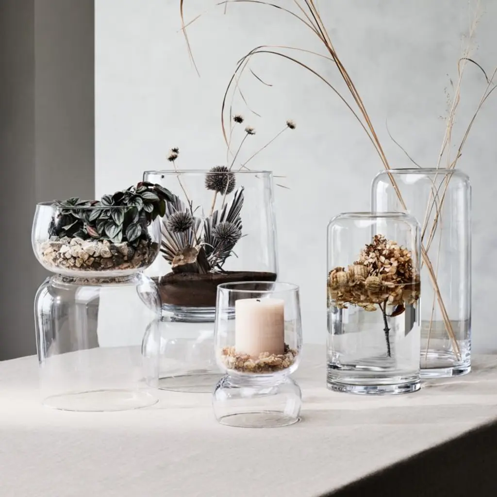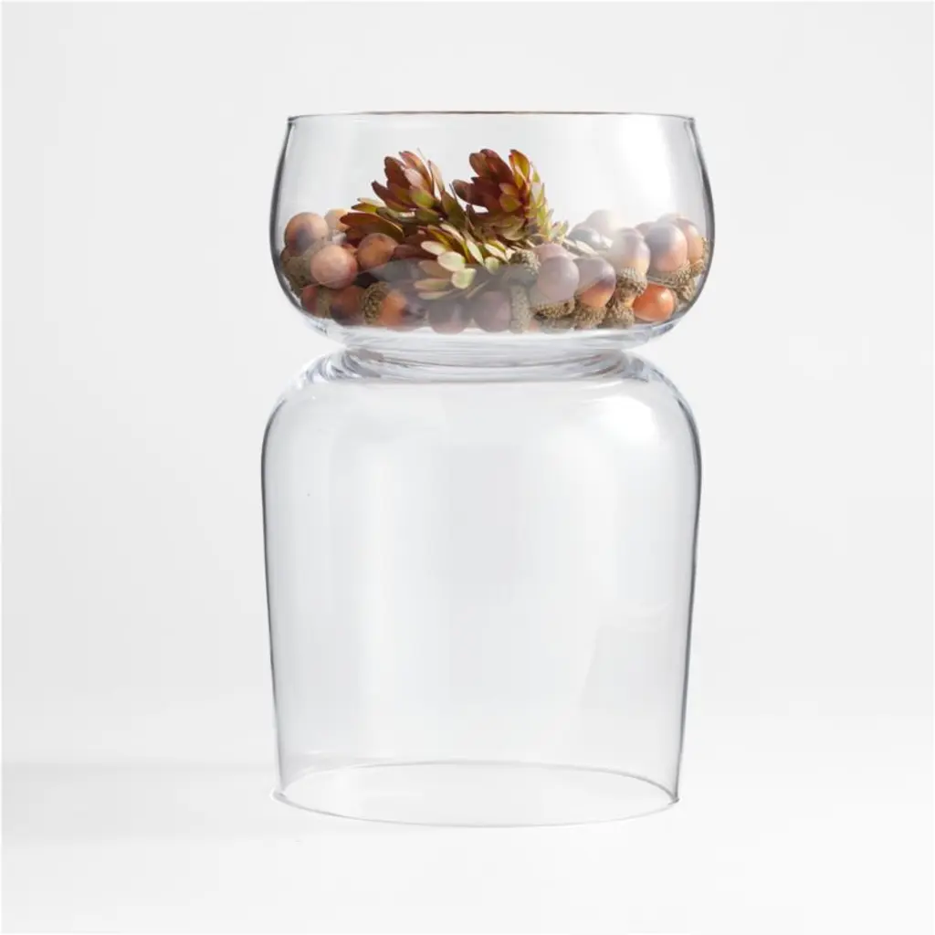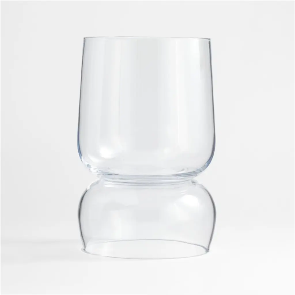 Shaped like an asymmetrical hourglass, our Glencoe hurricane holders have a double-sided design that offers lots of options to light up your space. The larger side facing up encloses tall pillar candles with a classic footed look. Flip the hand-blown candle holder over, and the smaller end elevates votive candles or fills with water for floating candles. Leave the bottom half empty for a clean look or fill with dried botanicals, shells or beach glass for seasonal accents. Made according to traditional glassblowing methods, the 13-inch hurricane holder combines with two other sizes in the collection for a multi-level display.