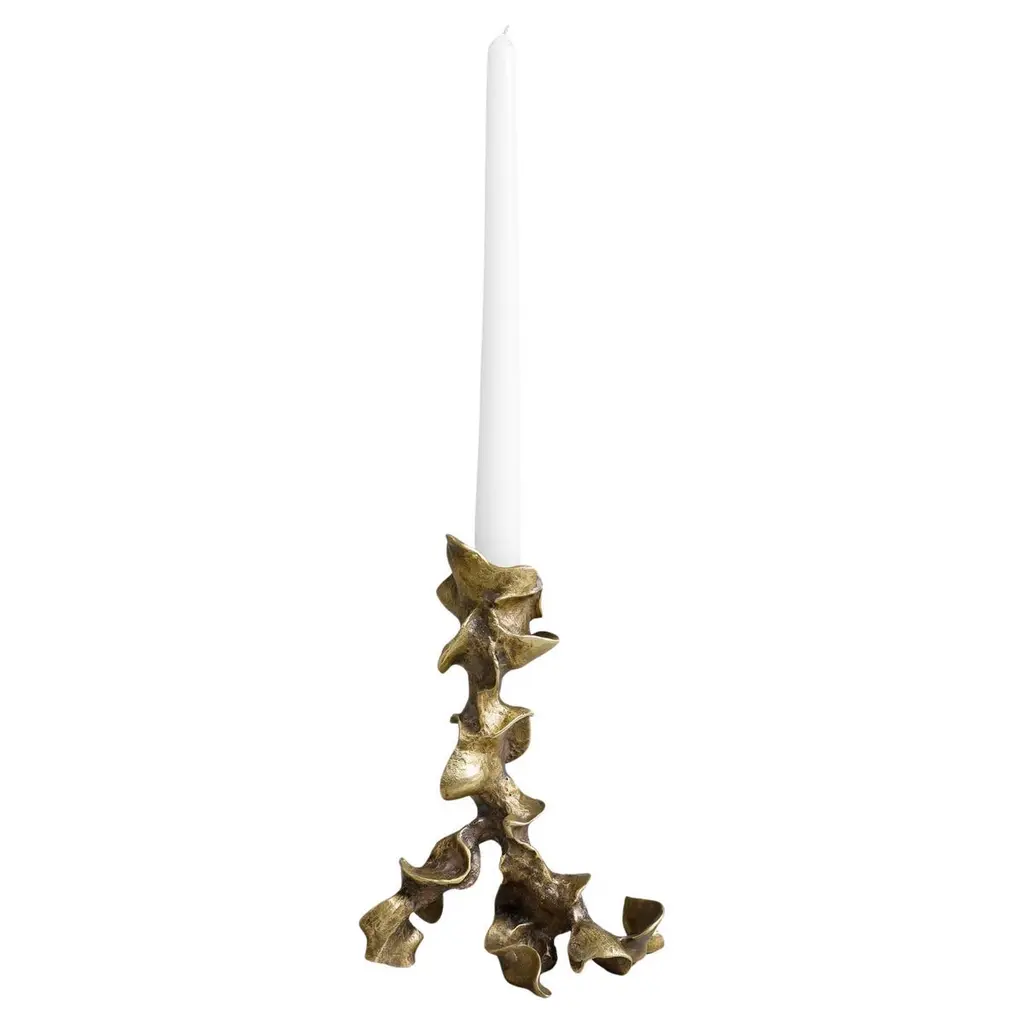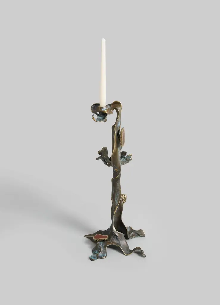 The Glory Lily flower dances in paradox, embodying breathtaking beauty and potent power. A striking climber, it isn’t your typical delicate flower, holding medicinal properties to cure many ailments. Our collection mirrors its dramatic, yet slender structure with its twists and curves in myriad shades of patinated cast brass. Like its namesake, this one is also to be admired.Candle Stand in brass with semi precious inserts. Handmade in India.Product DetailsMaterial: BrassInlay: Tiger Eye, Red Jasper, MalachiteSize: 11"L x 10.75"W x 22.75"H 27.9 L x 27.3 W x 57.8 H cmWeight: 4.11 kg 9.042 lbsNumber of Pieces: 1 Candle StandSKU: VCS2405This product has been handcrafted by local artisans. As such, slight variations are a testament to the unique character of a piece made by hand.
