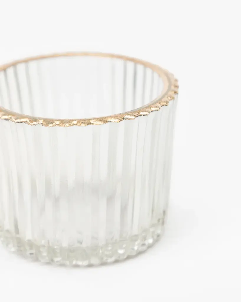 Delicate yet vibrant, the Gold Rimmed Glass Votive is crafted with ribbed glass. The sophisticated forms bring interest to your table settings, from festive occasions to everyday moments.
