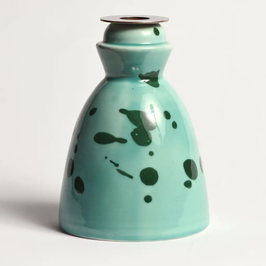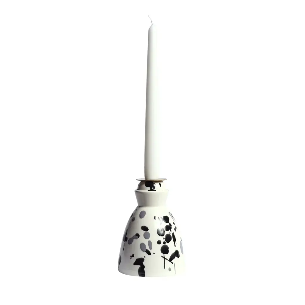 Decorative hand made ceramic candlestick with satin brass wax collector and 4 scented candles set Foglie di Fico. Immerse yourself in the magic of a candlelit dinner with the delicate Foglie di Fico fragrance. The candlestick comes in a gift box that includes the set of 4 scented candles, made of recycled cardboard from certified sources