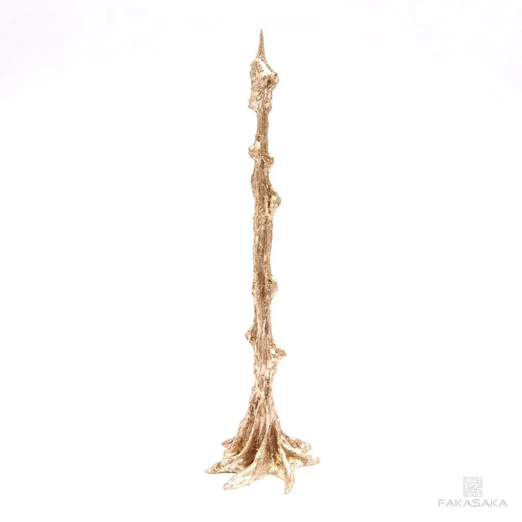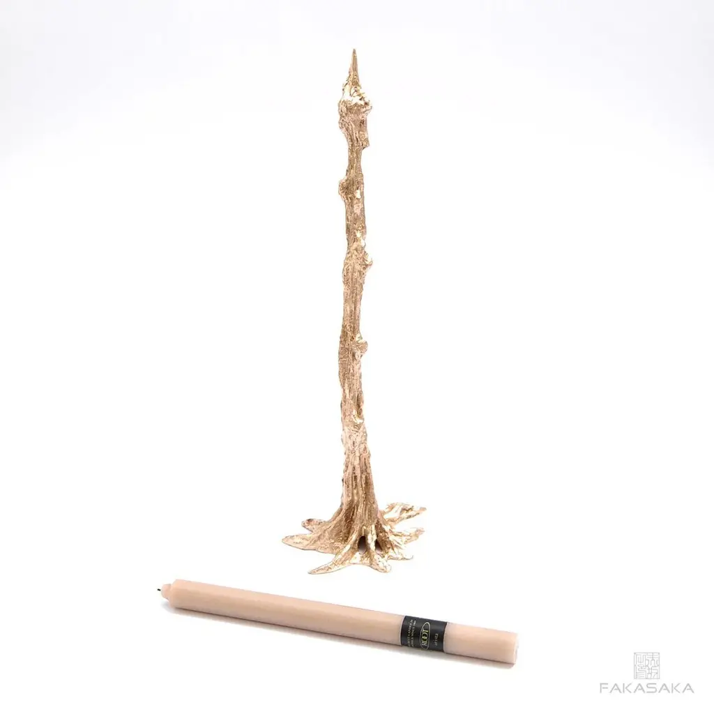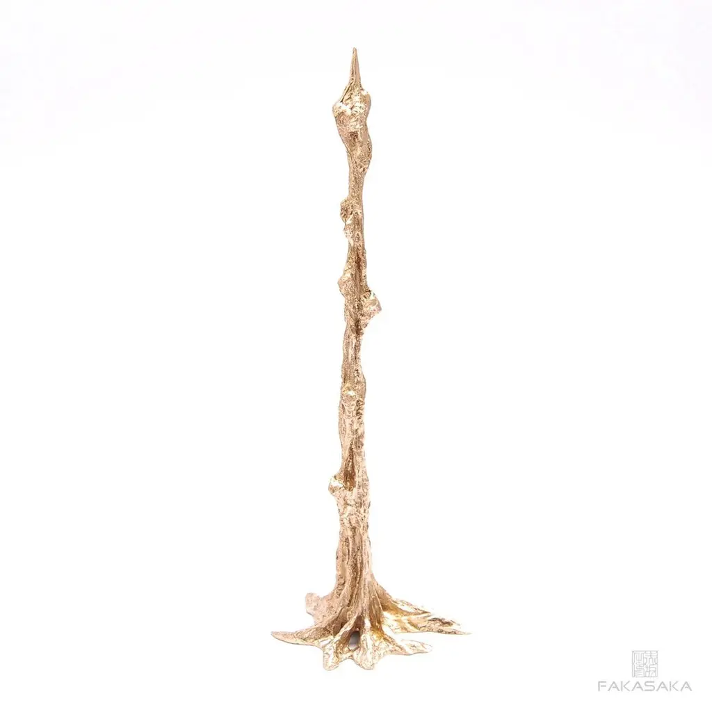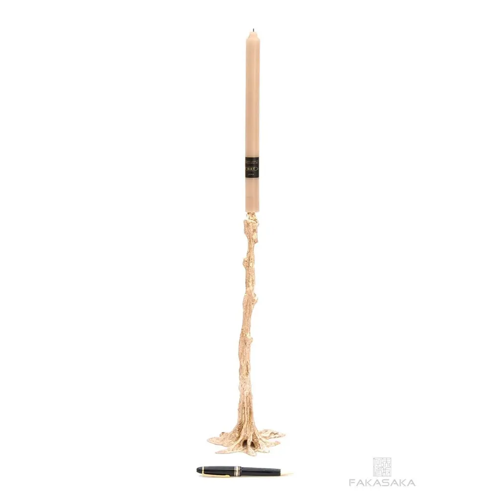 Gui candleholder by Fakasaka Design.Dimensions: W 14 cm D 10.5 cm H 40.5 cm.Materials: polished bronze. Fakasaka is a design company focused on production of high-end furniture, lighting, decorative objects, jewels, and accessories. Established in 2007, Fakasaka is the eponymous design company by Brazilian artist Fernando Akasaka distinguished by a penchant for producing intricate detailed cast bronze collectible design objects, furniture and jewelries. Fakasaka explores the contrast between the manmade and the natural through shapes and finishes that create a clear aesthetic. The constant challenge to balance elements is met with an outcome that is a striking assortment of bronze furniture and objects in oxidised and polished finishes, accented with precious regional stones, granites and rich prehistoric reptilian motifs.