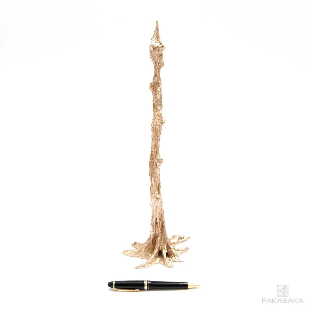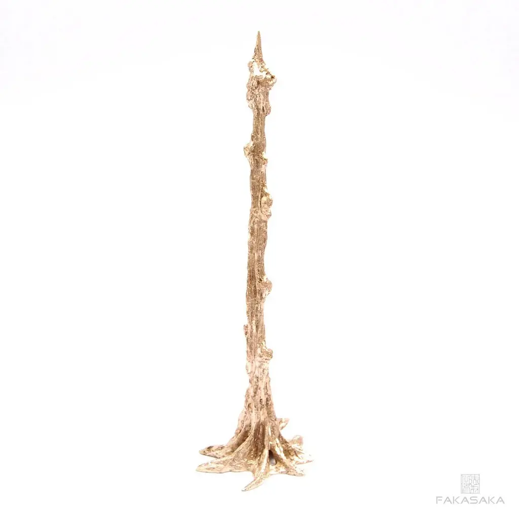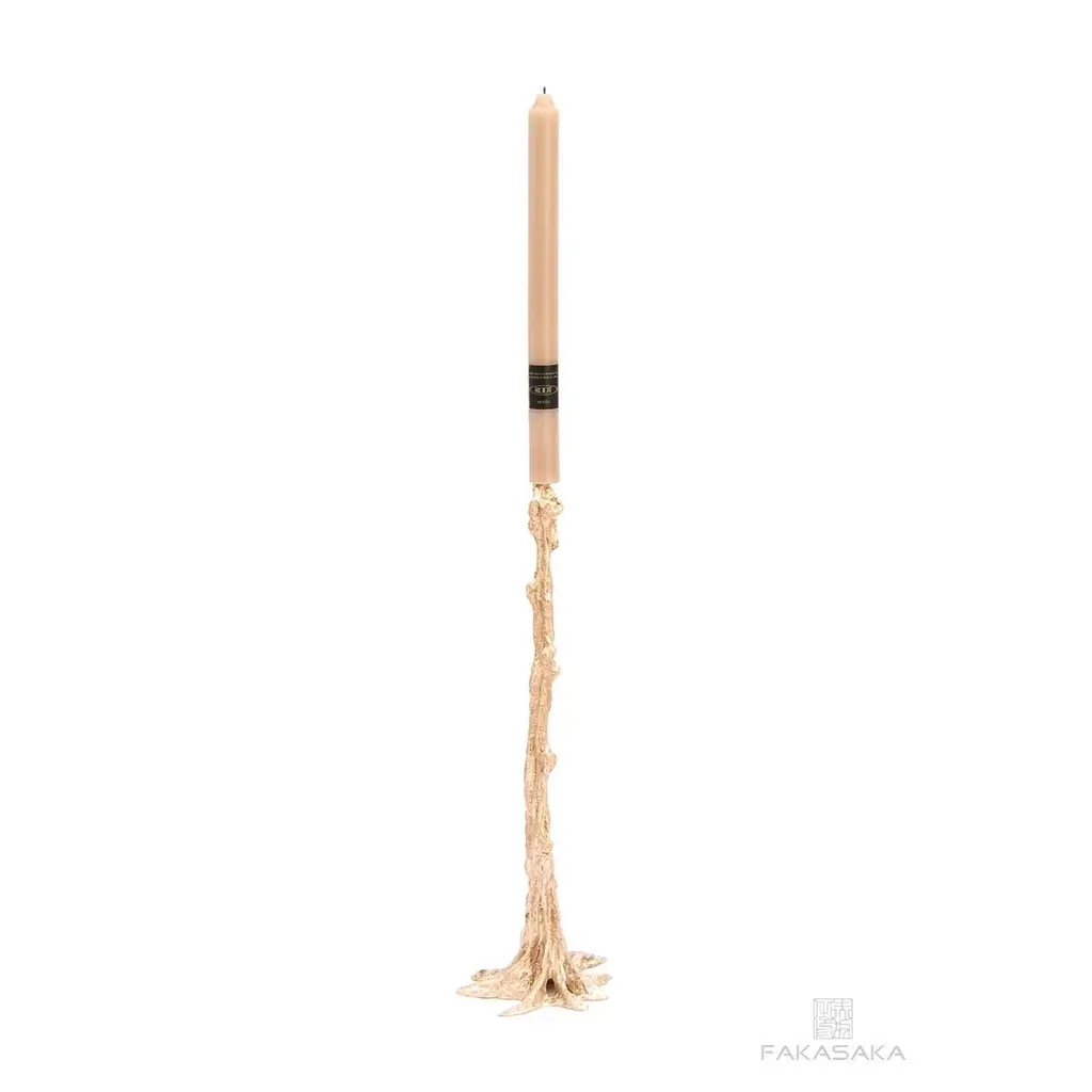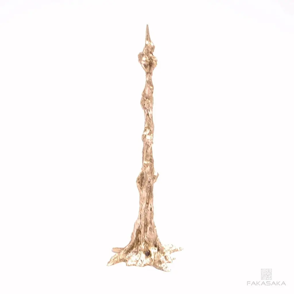 Gui candleholder by Fakasaka Design.Dimensions: W 14 cm D 10.5 cm H 40.5 cm.Materials: polished bronze. Fakasaka is a design company focused on production of high-end furniture, lighting, decorative objects, jewels, and accessories. Established in 2007, Fakasaka is the eponymous design company by Brazilian artist Fernando Akasaka distinguished by a penchant for producing intricate detailed cast bronze collectible design objects, furniture and jewelries. Fakasaka explores the contrast between the manmade and the natural through shapes and finishes that create a clear aesthetic. The constant challenge to balance elements is met with an outcome that is a striking assortment of bronze furniture and objects in oxidised and polished finishes, accented with precious regional stones, granites and rich prehistoric reptilian motifs.