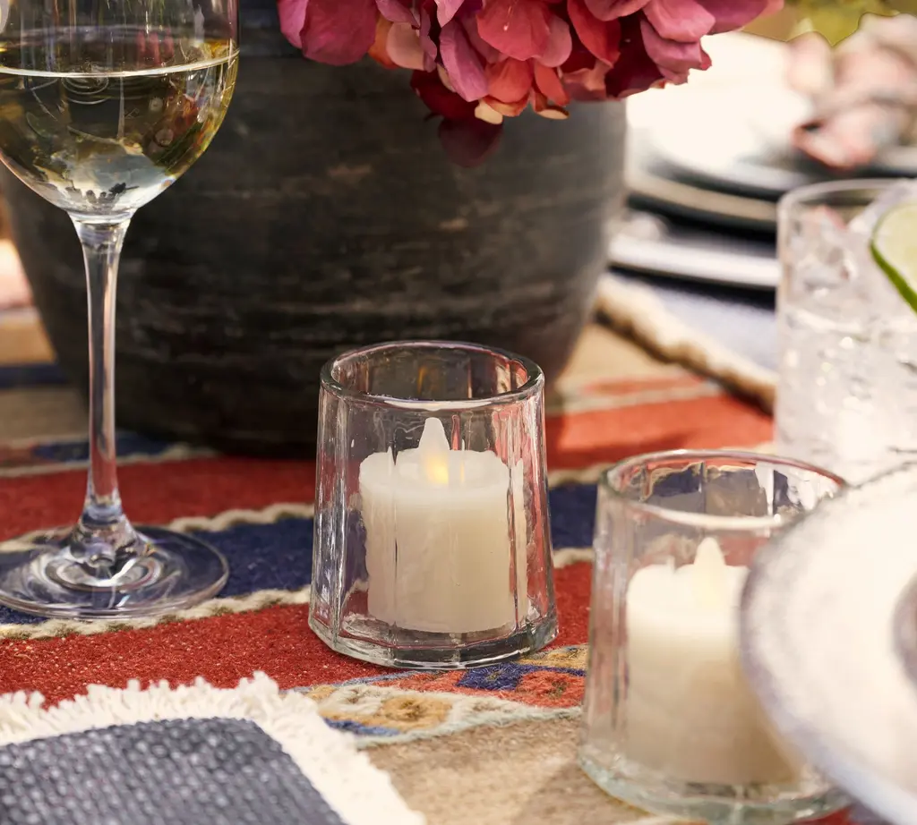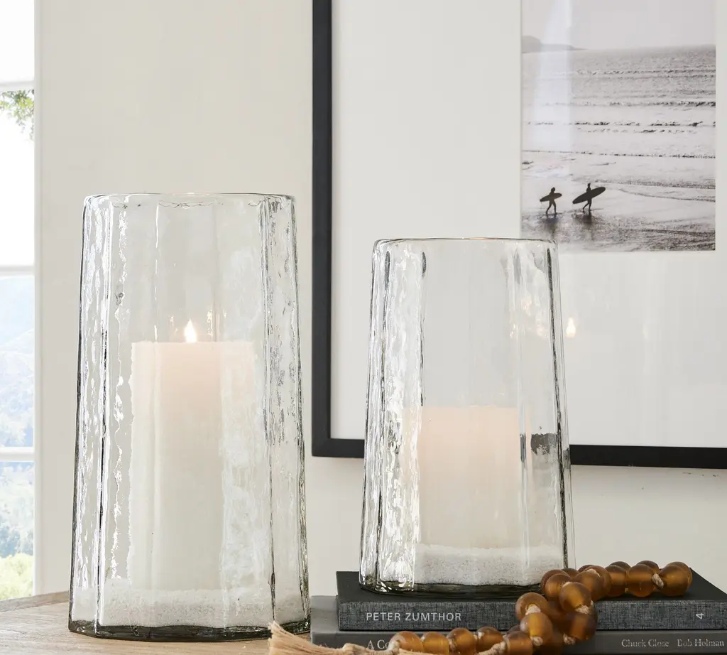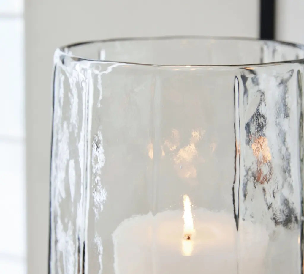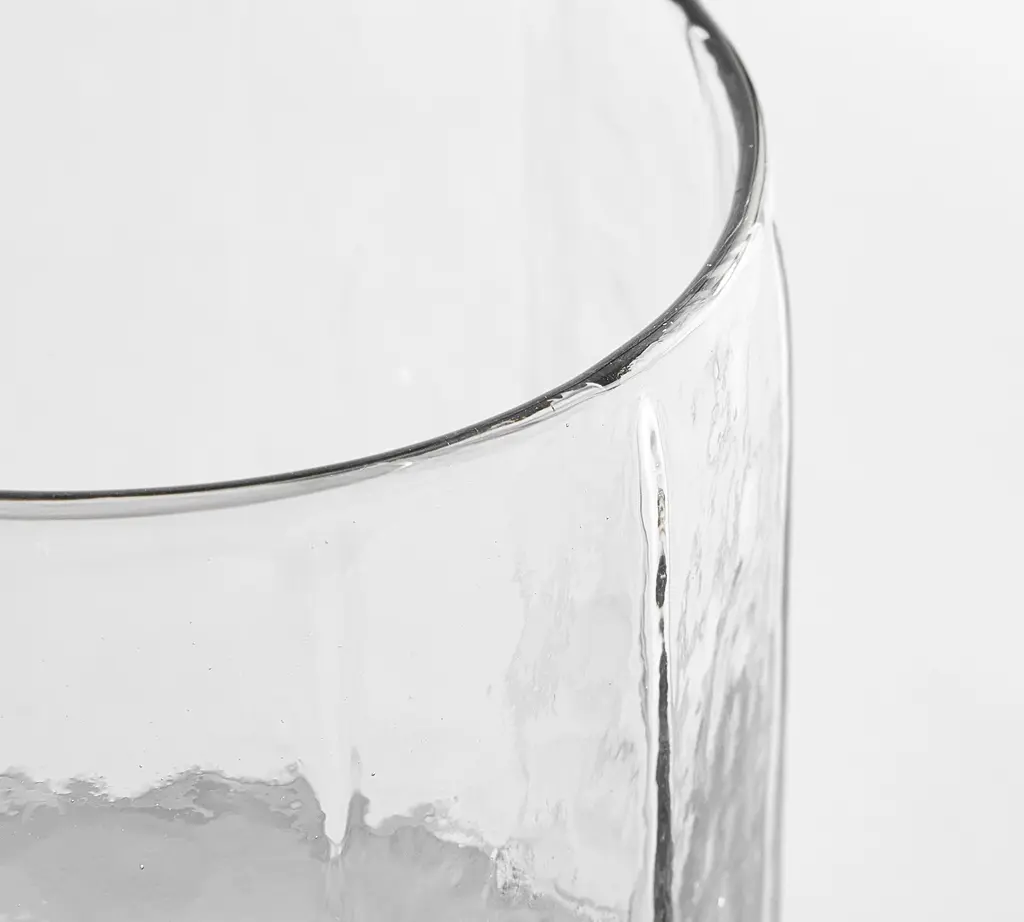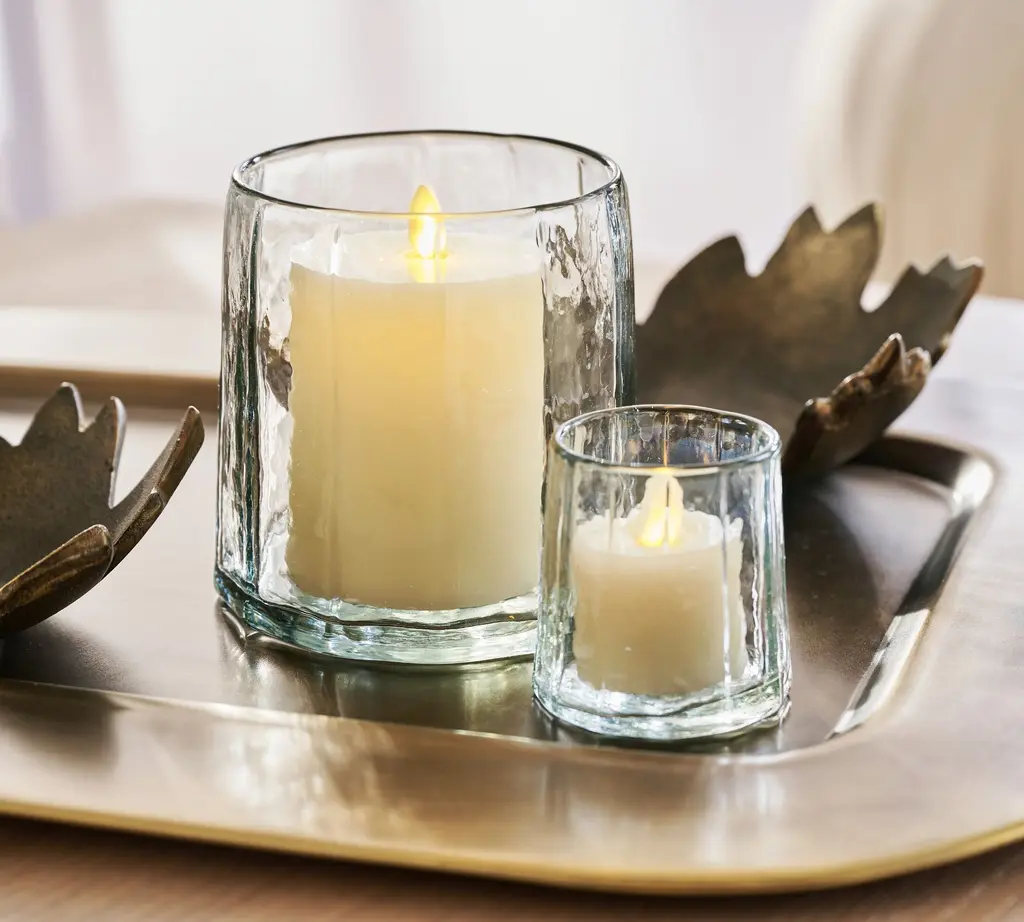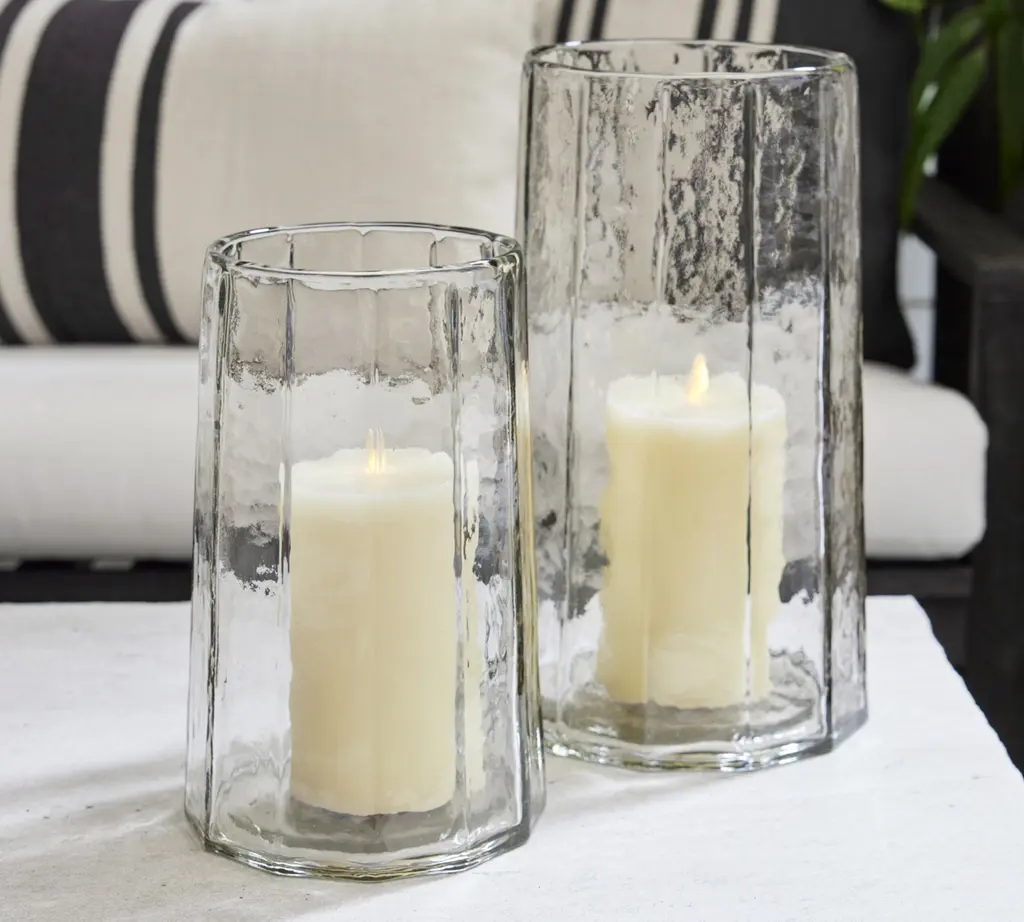 Handcrafted by artisans in India, our hammered hurricane looks relaxed and refined. The soft facets and warbled look of the blown glass can enhance the glow of one of our flameless pillar candles. Use one alone or group several together. Sometimes we fill them with flowers to create an entirely different brand of beauty.