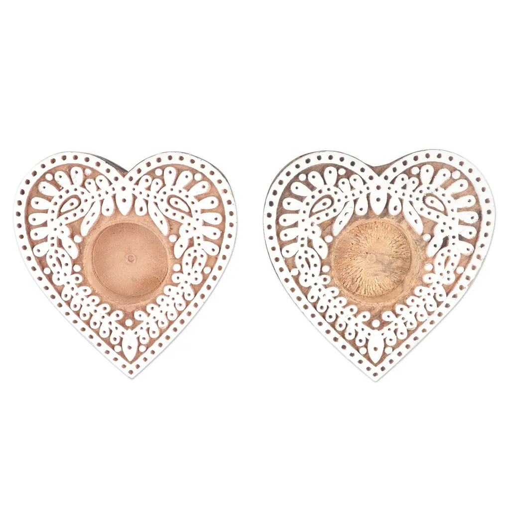 Hand Carved Tealight Candle Holders With Heart Motif (Pair)- Warm Heart
