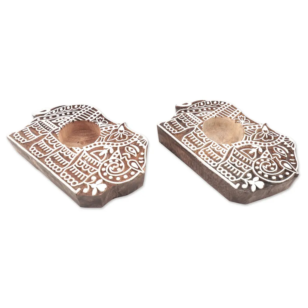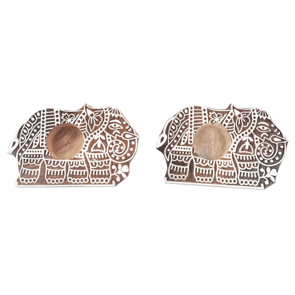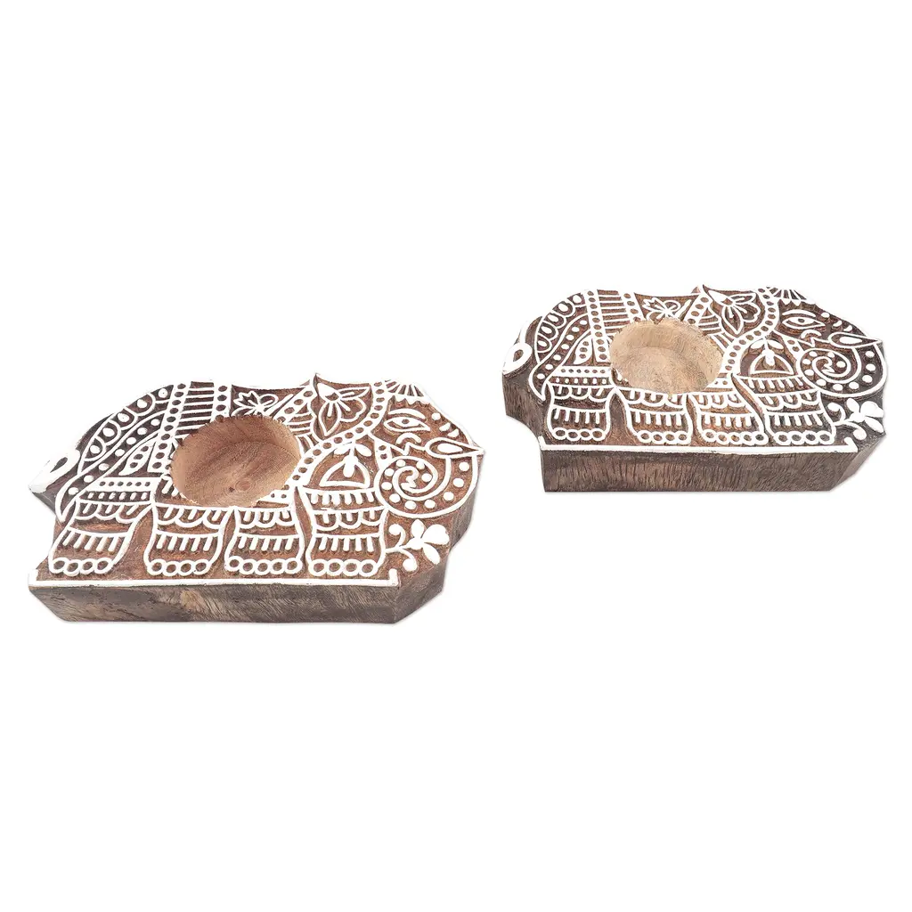 Pop your favorite tealights into Tariq Khan's charming elephant candle holders, which are inspired by the art of traditional block-printing. Carved in relief by Indian artisans, the hand-chiseled designs are painted white, contrasting beautifully with the natural mango wood below.