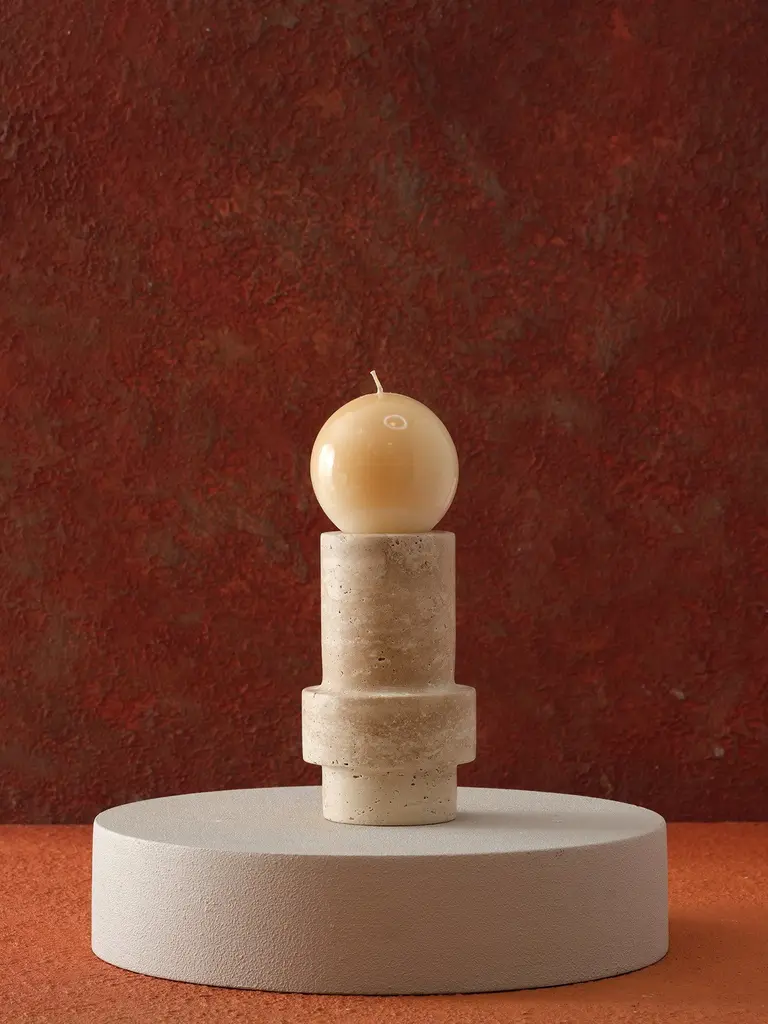 The Travertine Candle Holder is a sculptural celebration of form and function. Handcrafted from natural beige travertine, its clean cylindrical silhouette is punctuated by a geometric ridge detail that gives it visual rhythm and balance. Designed to hold pillar or ball candles, this piece transforms a simple lighting element into a design statement. Whether styled alone or in multiples, it brings a warm, architectural quality to tabletops, mantels, or intimate vignettes. The stone’s soft veining adds a natural elegance to its modern minimalism.