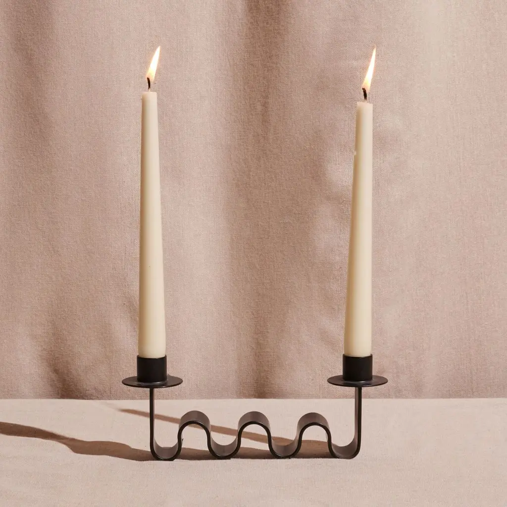 This elegant candle holder features a wavy design, perfect for holding two taper candles. Crafted from metal, it is Fair Trade Certified and handcrafted in India, ensuring both quality and ethical production. Its sleek dimensions make it a stylish addition to any decor.