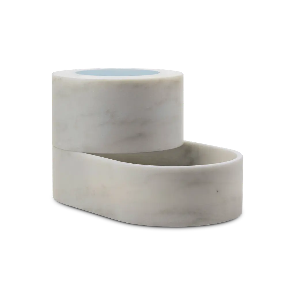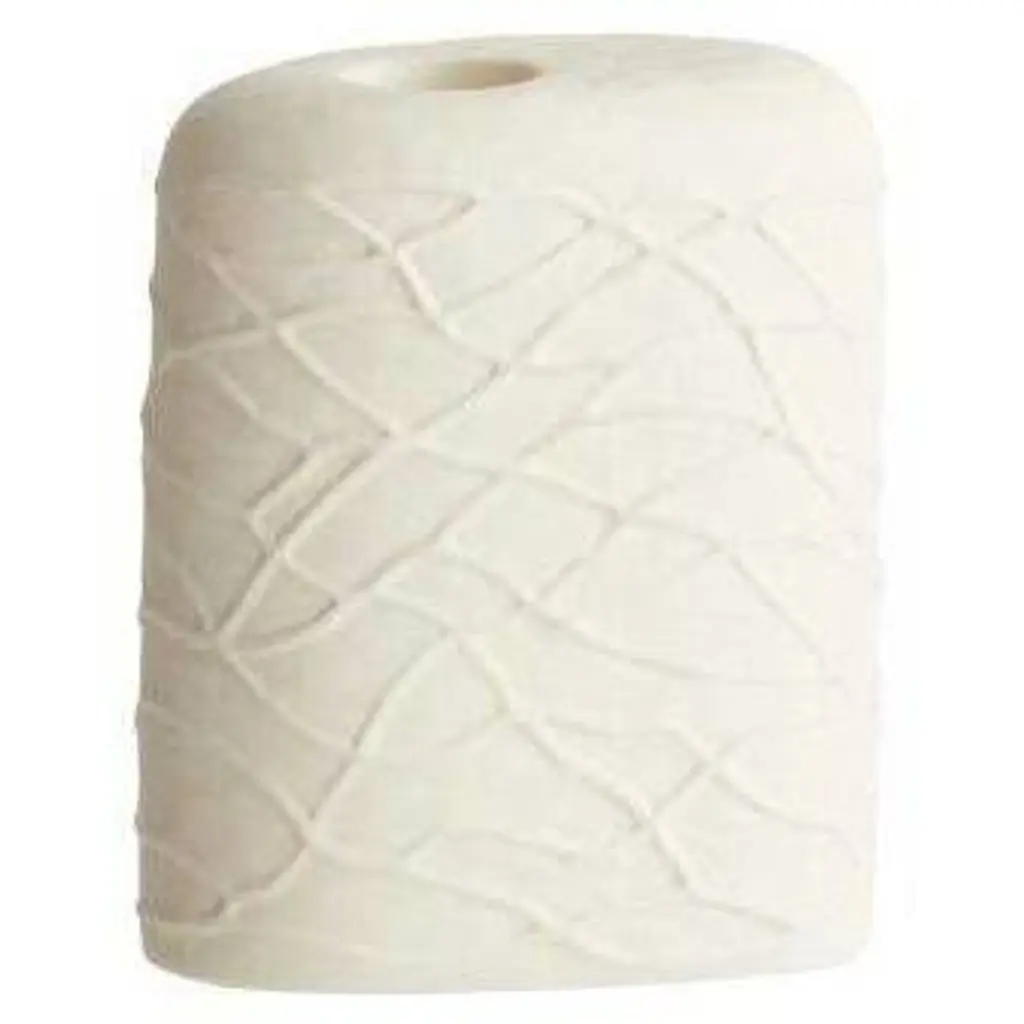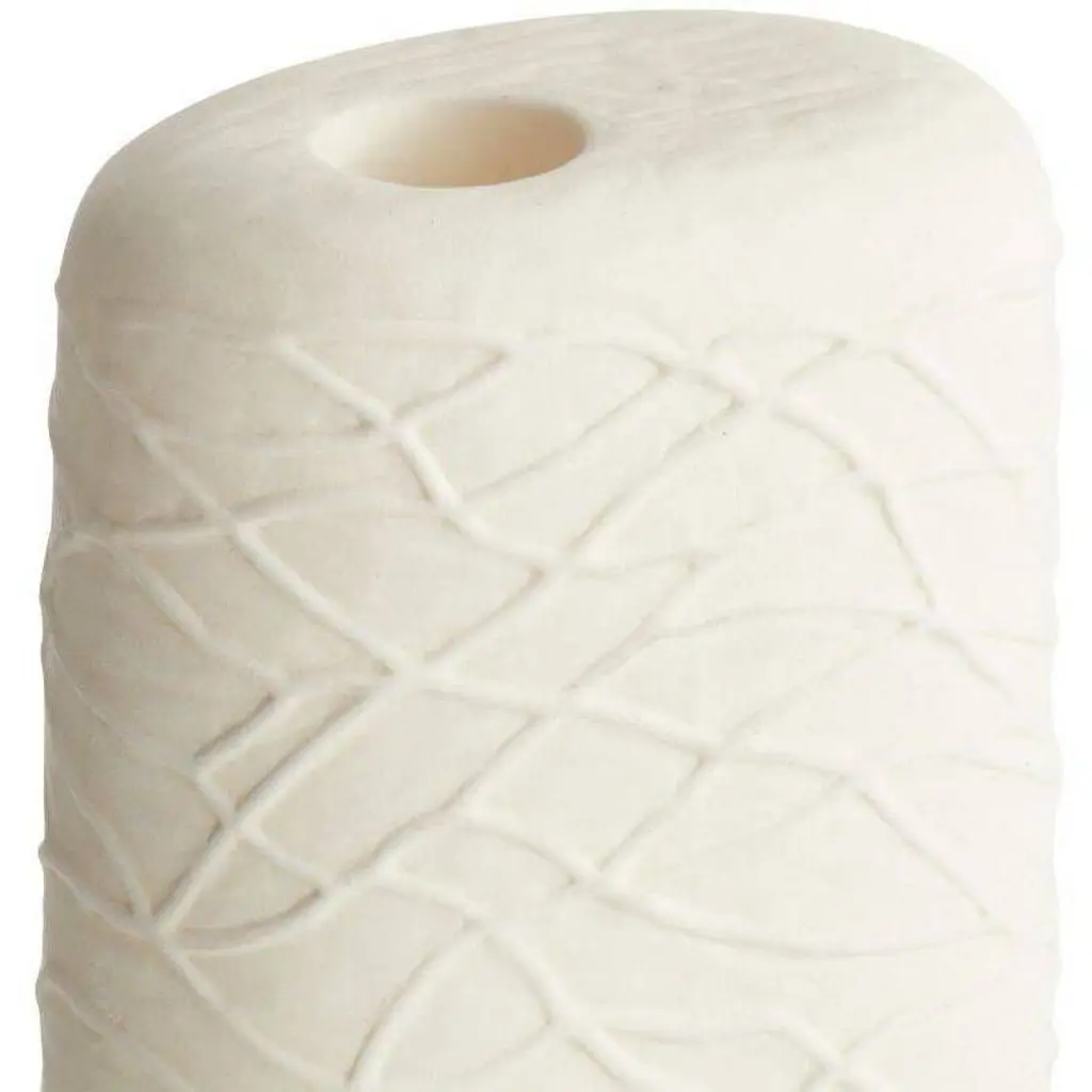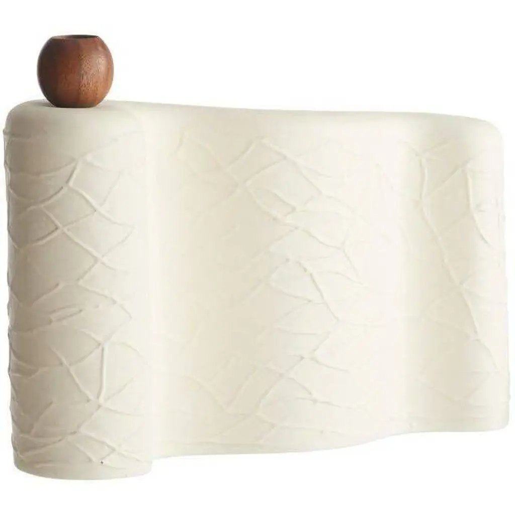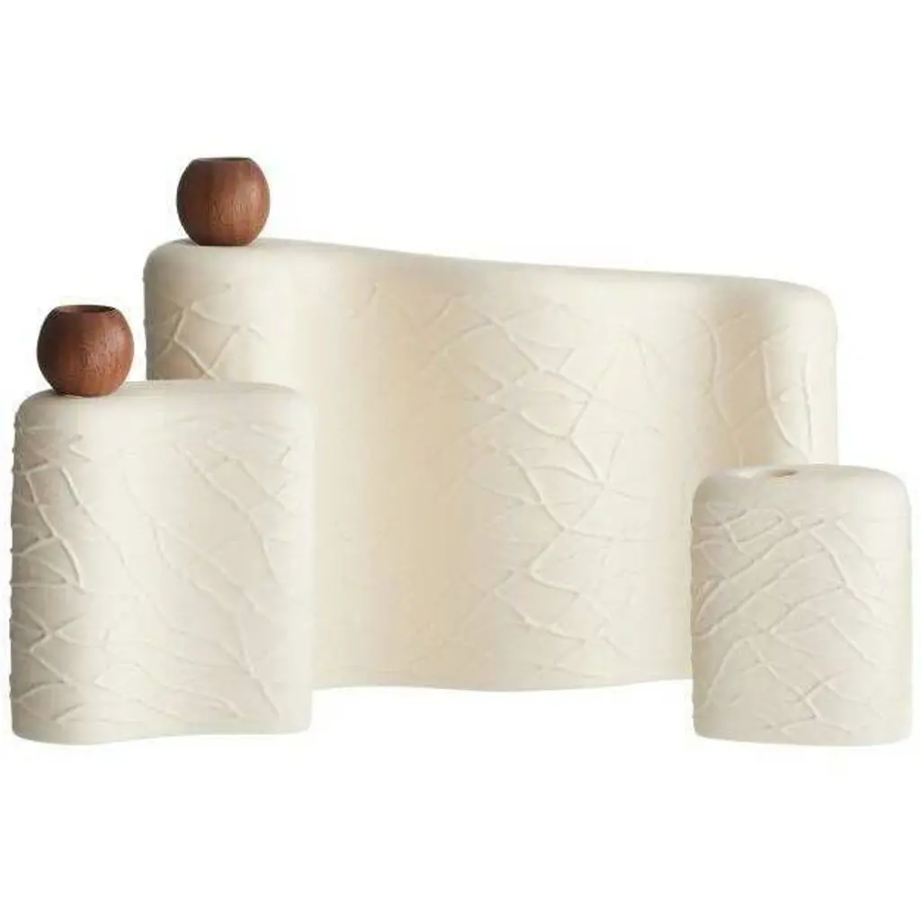 Our candleholders were designed to be nested or pulled apart to create a unique vignette. Crafted of porcelain with a matte eggshell glaze, each has a texture inspired by embroidered fabric. Walnut wood accents add an organic feel. Finish will vary.