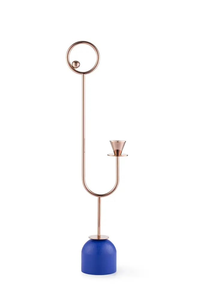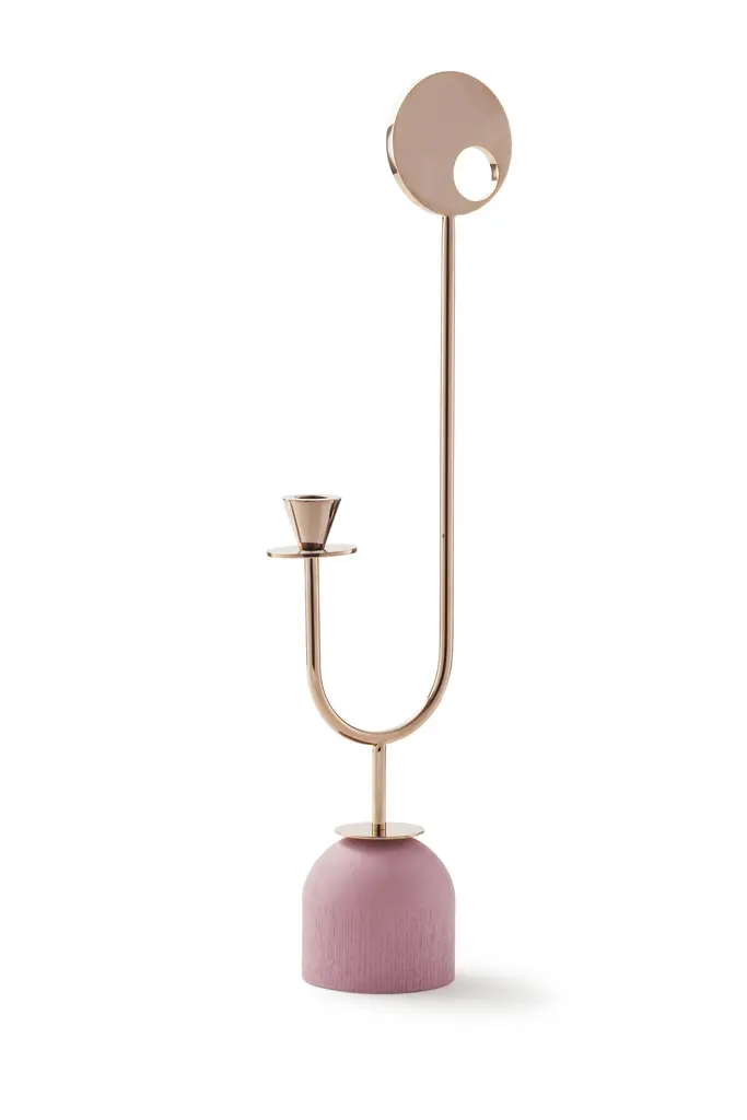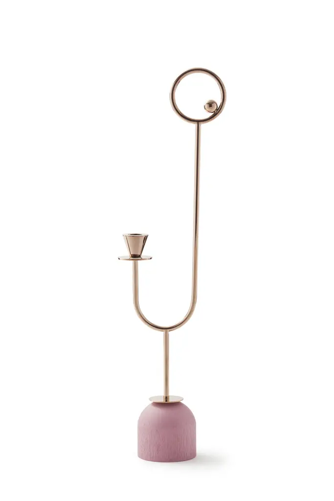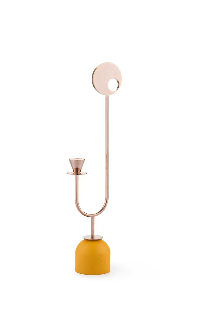 Homage to Memphis Movement - candleholderMeasures: D 8.5 x W 15 x H 50 cmPlated metal coated with glossy pink copper finishBase in ash veneer painted in matte dusty pink, yellow or blueParis-Memphis capsule collection draws its inspiration and pays homage to The Memphis Design Movement created in 1981 by Ettore Sottsass. Unstructured shapes and asymmetric lines bring humor, energy and flamboyance to the entire series. While N.3 and N.4 candleholders feature bold colors rather alluding to pop art, the rest of the collection – with pastel colors and delicate shades of champagne, copper and pink-copper metal finish – further remind the Art Deco geometrical elegancy.