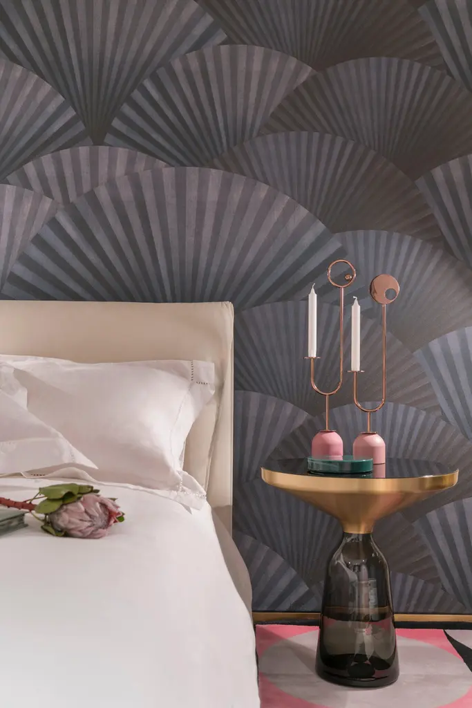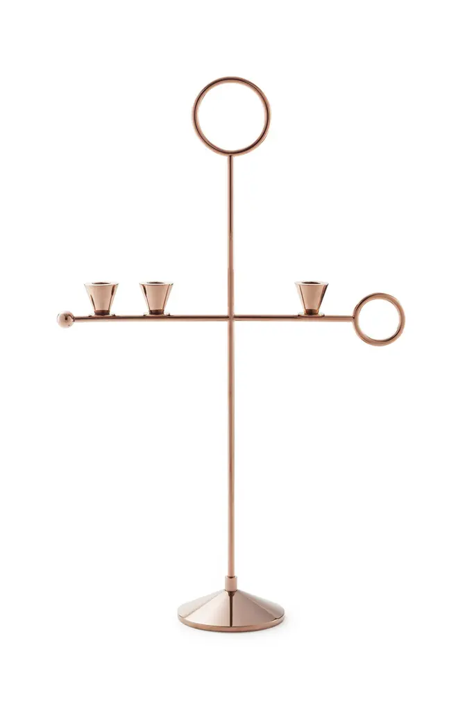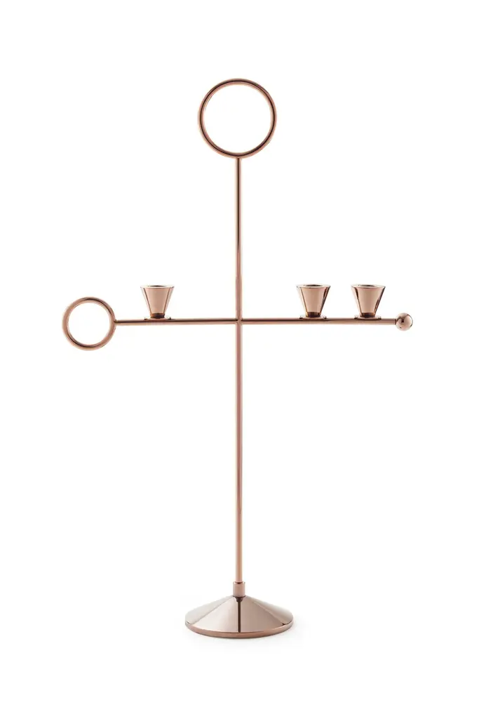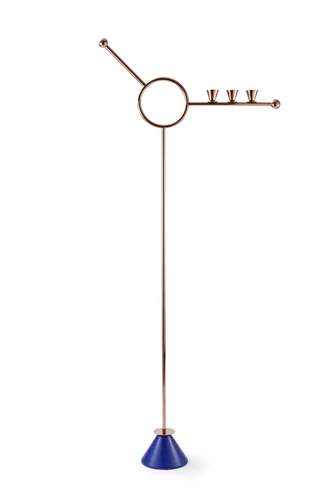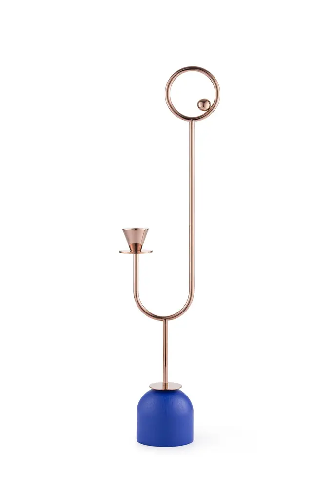 Homage to Memphis Movement - candleholderMeasures: D 8.5 x W 15 x H 50 cmPlated metal coated with glossy pink copper finishBase in ash veneer painted in matte dusty pink, yellow or blueParis-Memphis capsule collection draws its inspiration and pays homage to The Memphis Design Movement created in 1981 by Ettore Sottsass. Unstructured shapes and asymmetric lines bring humor, energy and flamboyance to the entire series. While N.3 and N.4 candleholders feature bold colors rather alluding to pop art, the rest of the collection – with pastel colors and delicate shades of champagne, copper and pink-copper metal finish – further remind the Art Deco geometrical elegancy.