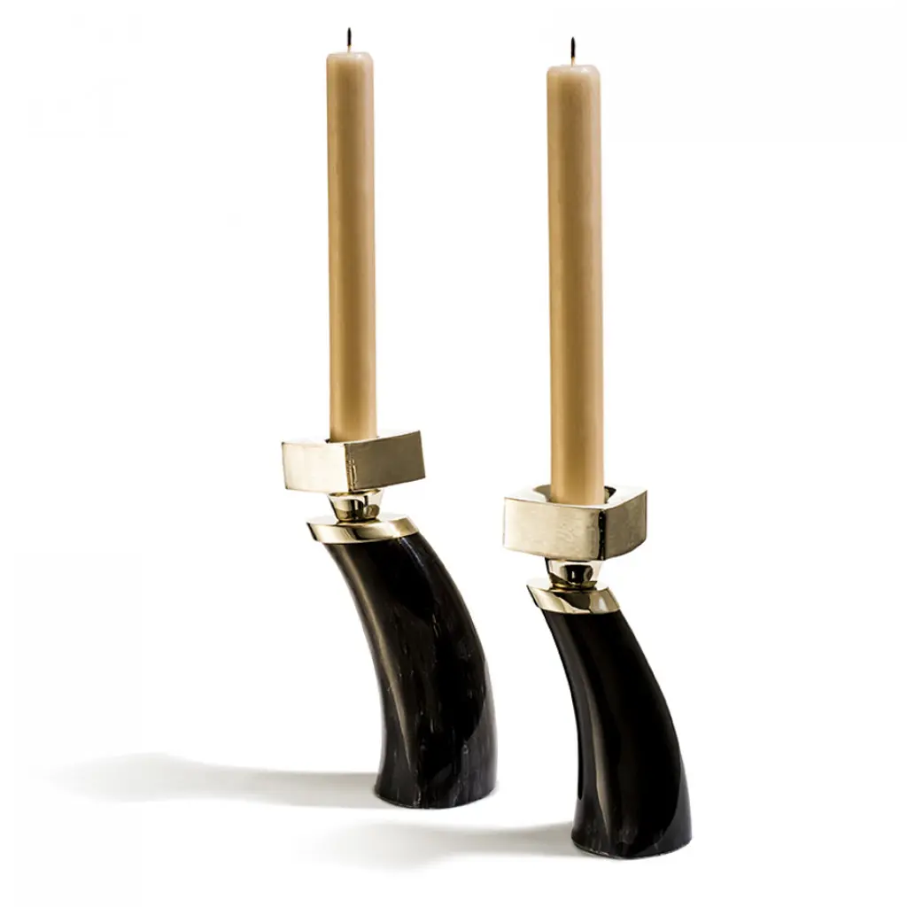 Whether you are dressing your table, or adding finishing touches to your décor, our candleholders will be that elusive piece. A marriage of classic and modern, the warmth and texture of our rich horn veneer candleholder set on conical bases, combined with our lustrous gold brass finish is sure to turn heads. Complete the look by pairing our three piece set with stark candles for a bold effect.