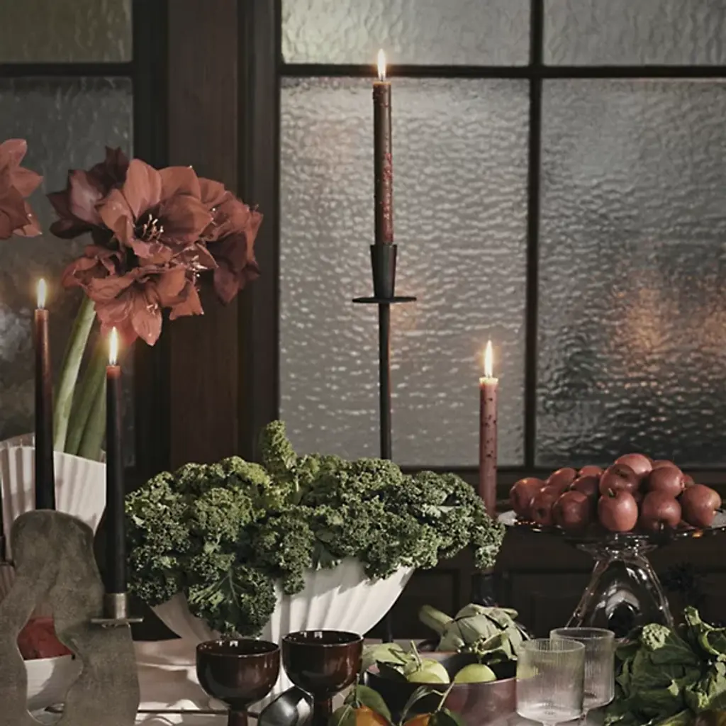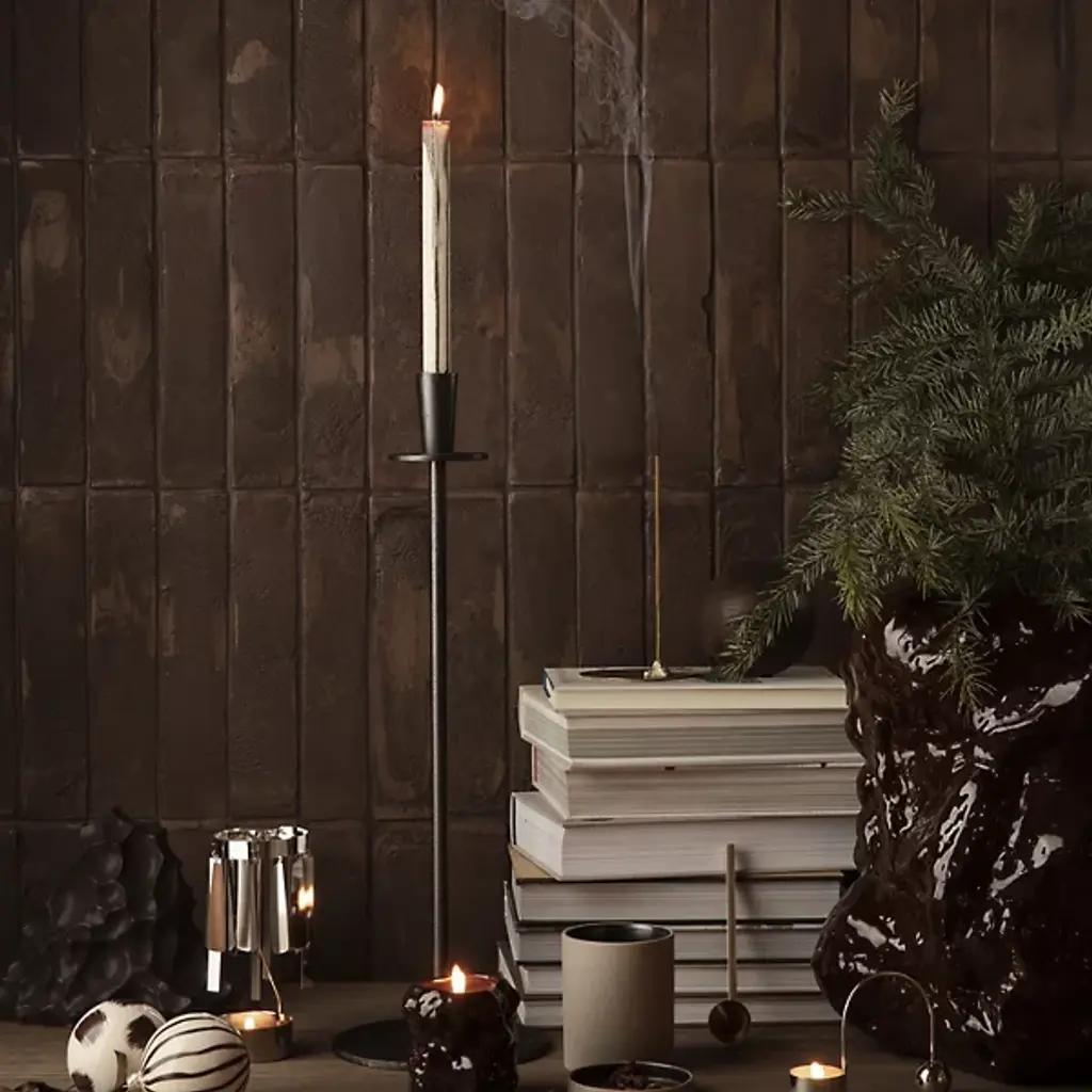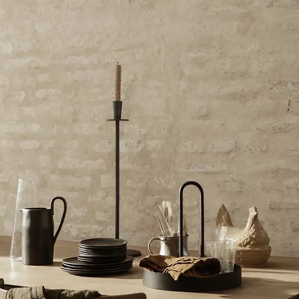 The Hoy Casted Candle Holder from Ferm Living uses recycled casted aluminum to create a tall, minimalist form. The raw matte finish adds subtle texture to the simple design. This piece works in multiple settings—on a beautifully set dinner table, by the fireplace, or on the floor. Safety features include a stable base and proper candle containment. The aluminum construction provides durability while maintaining visual lightness. This candle holder’s proportions allow for dramatic presentation without compromising stability.